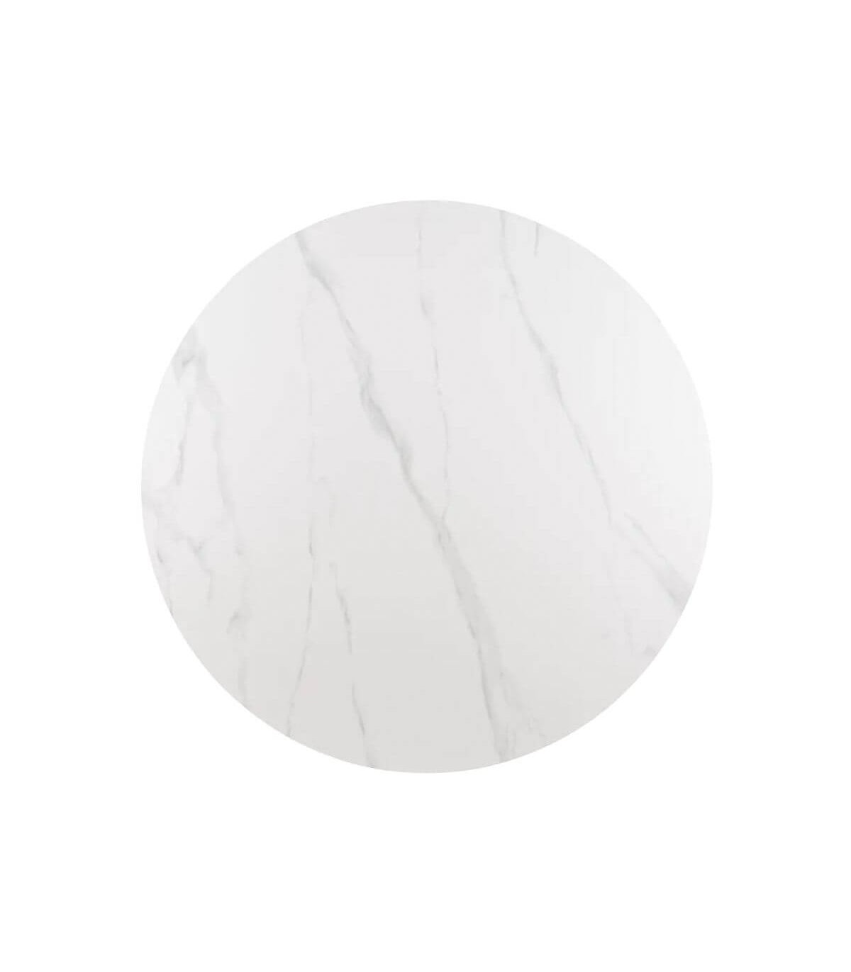 Mesa de comedor redonda grande, realizada en metal imitación madera natural, tapa de cerámica imitación mármol blanco con vetas grises. Una mesa robusta muy decorat1va y de fácil mantenimiento.