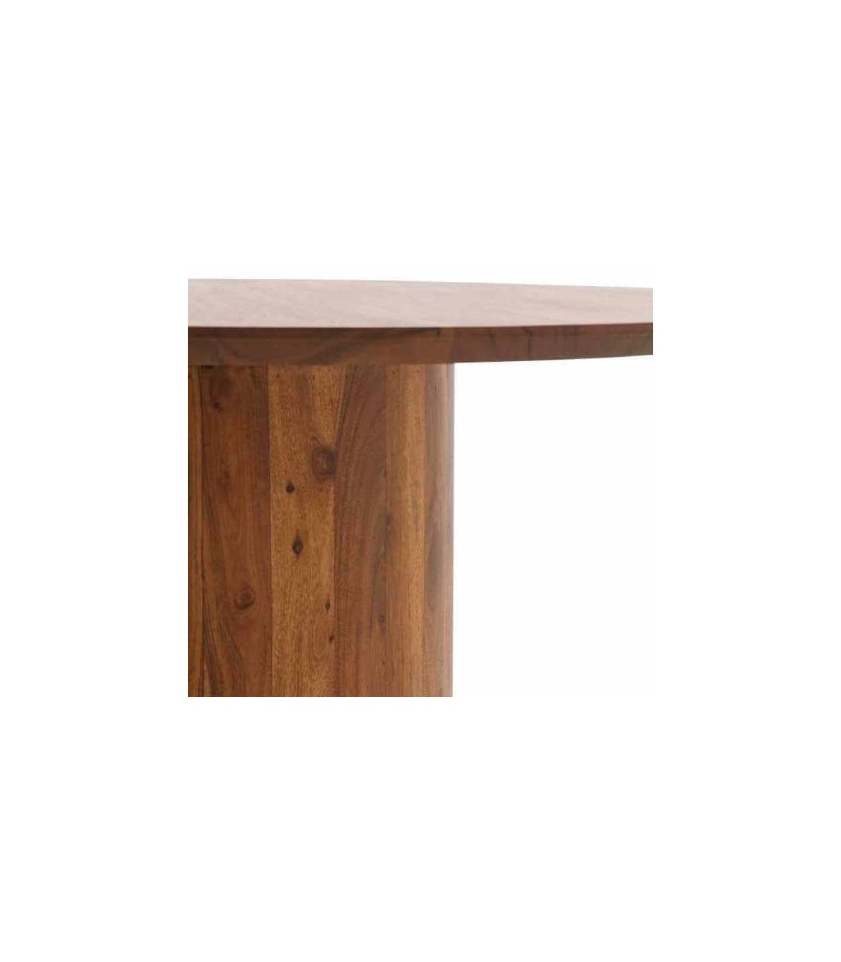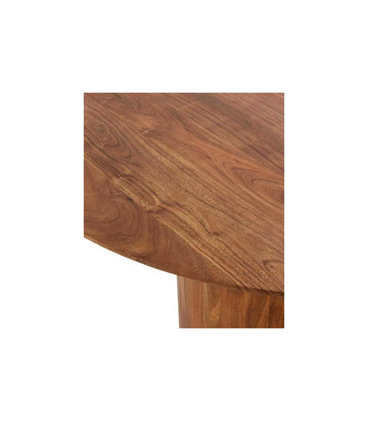 Mesa de comedor redonda realizada en madera de acacia natural. La madera de acacia, con sus tonalidades naturales y su distintivo grano, aporta un encanto cálido y auténtico a la mesa de comedor, añade un elemento de estilo y elegancia a cualquier espacio.