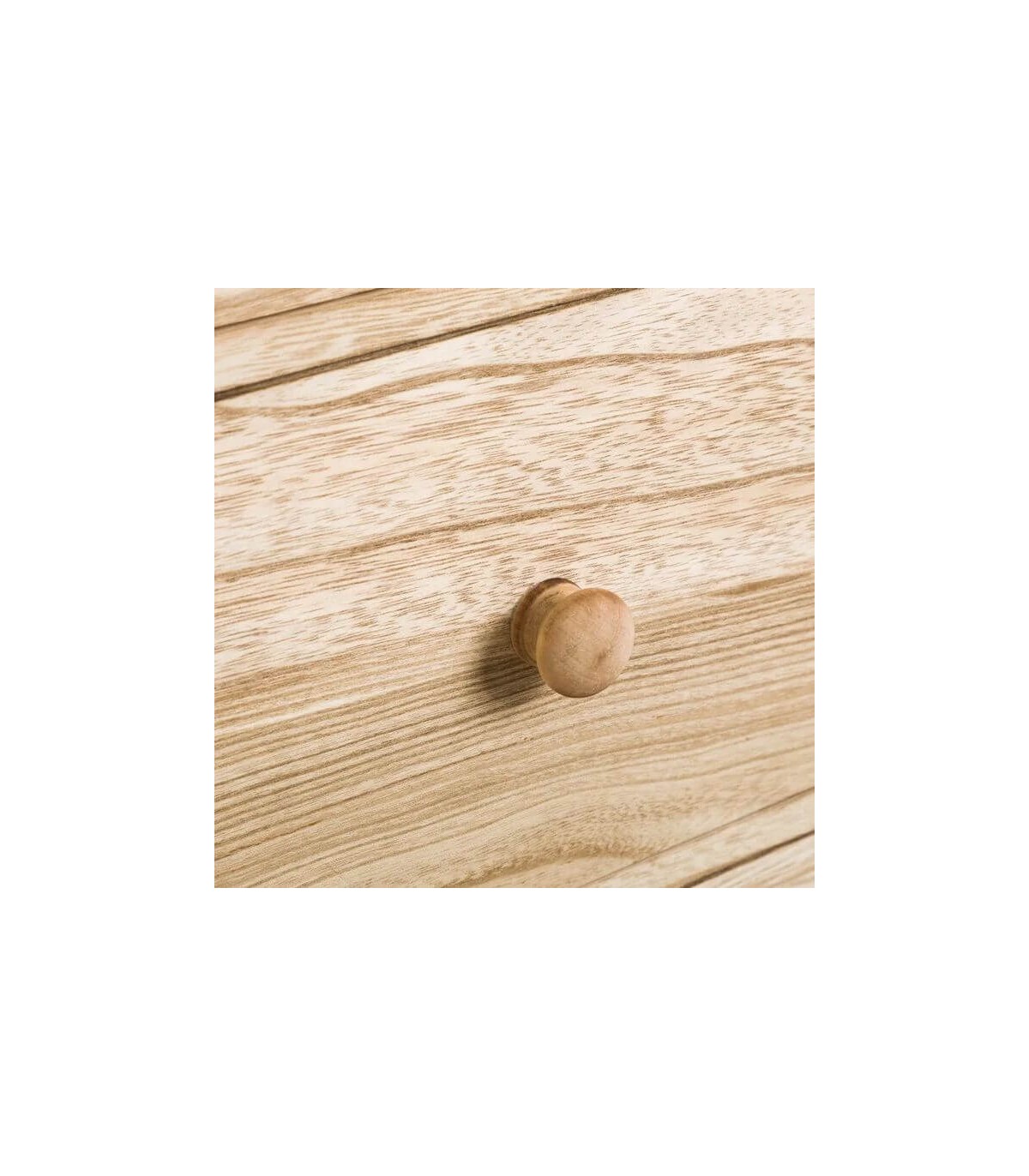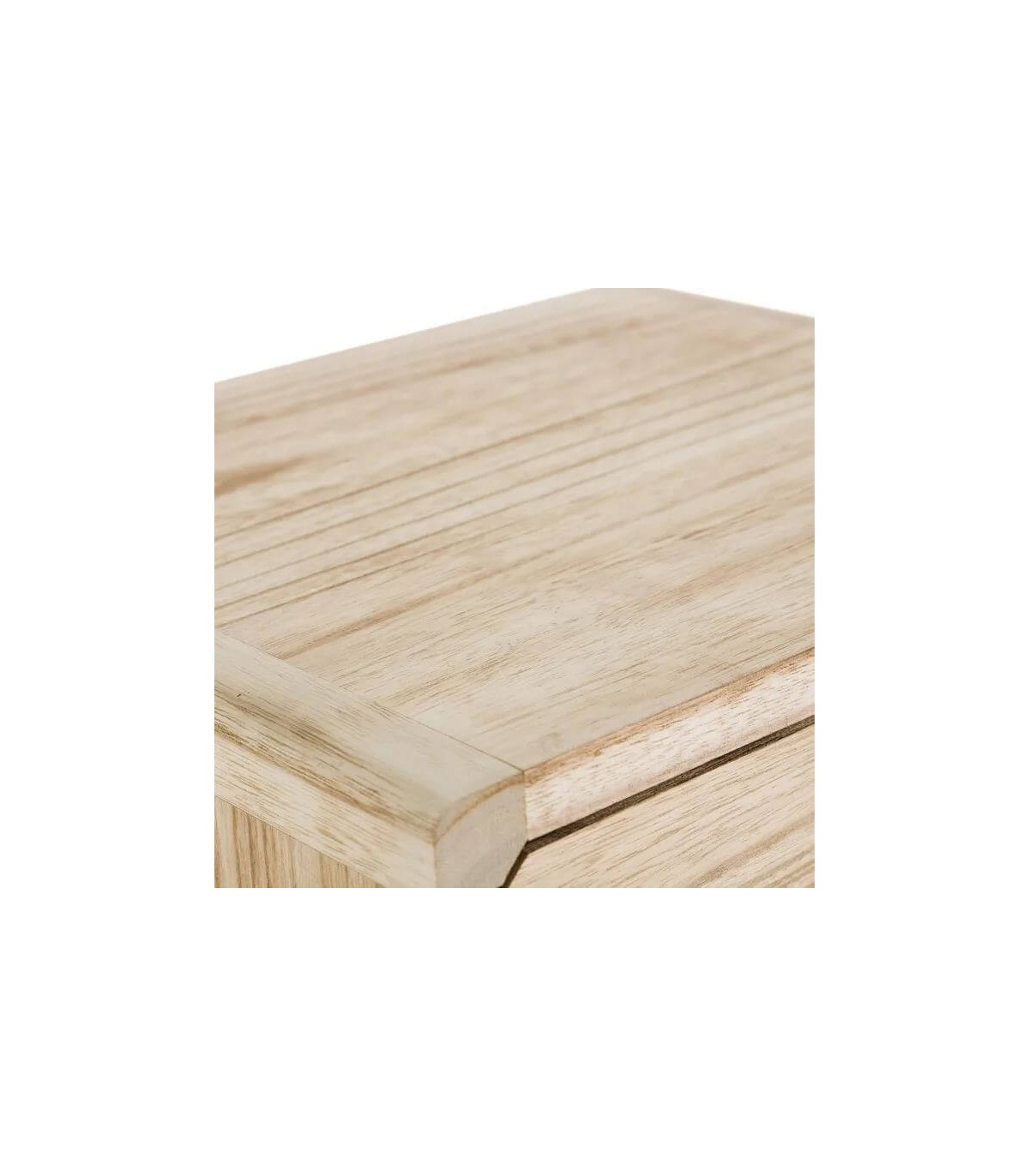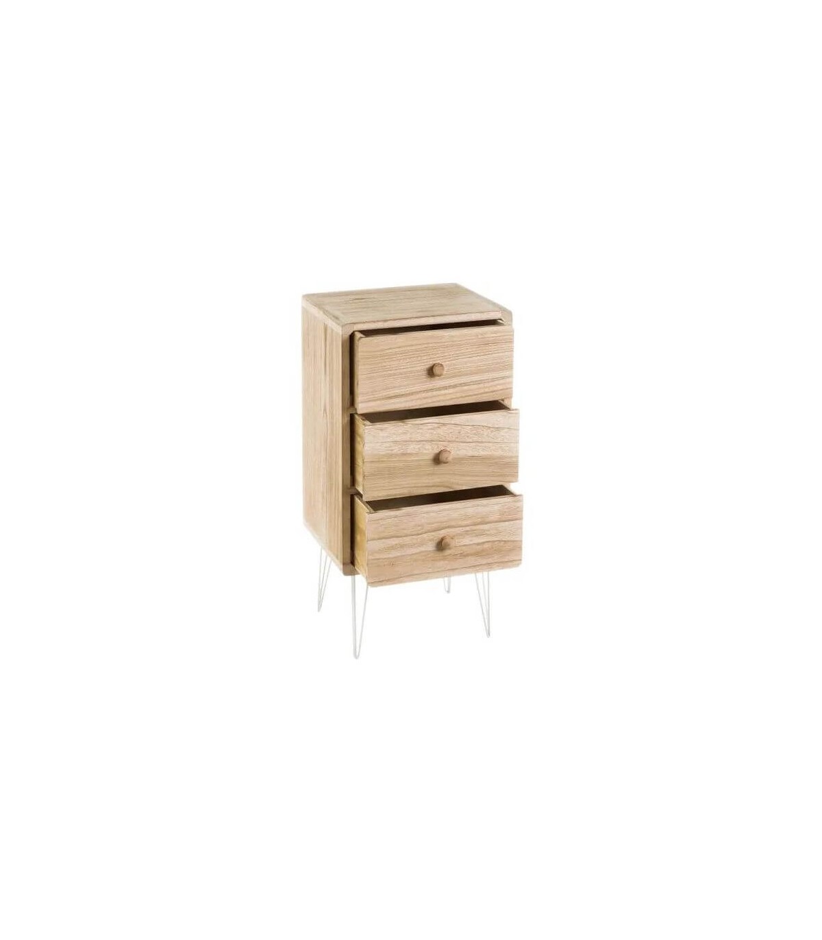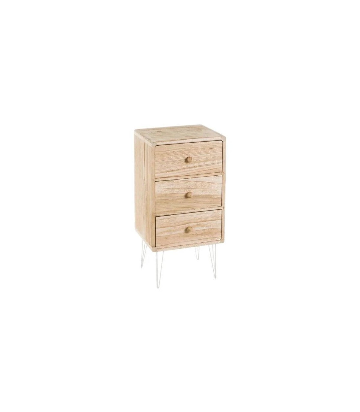 Mesita de noche con 3 cajones, realizada en madera de paulonia natural y metal blanco, ligera y muy práctica de líneas desenfadadas, ideal para tu dormitorio.