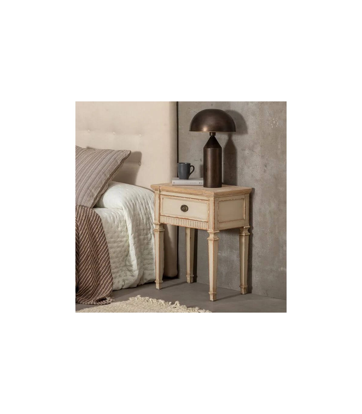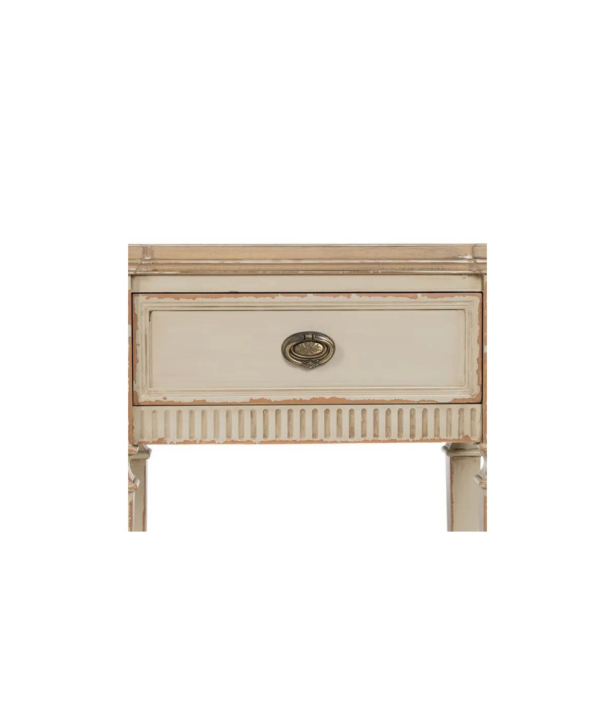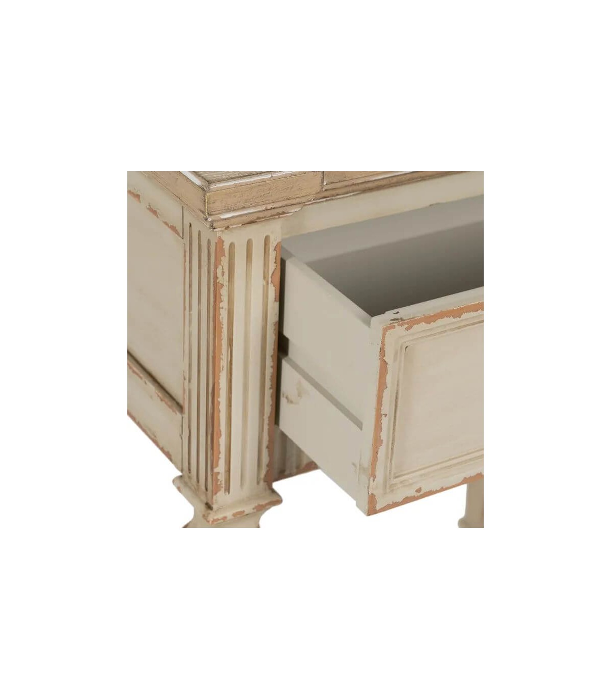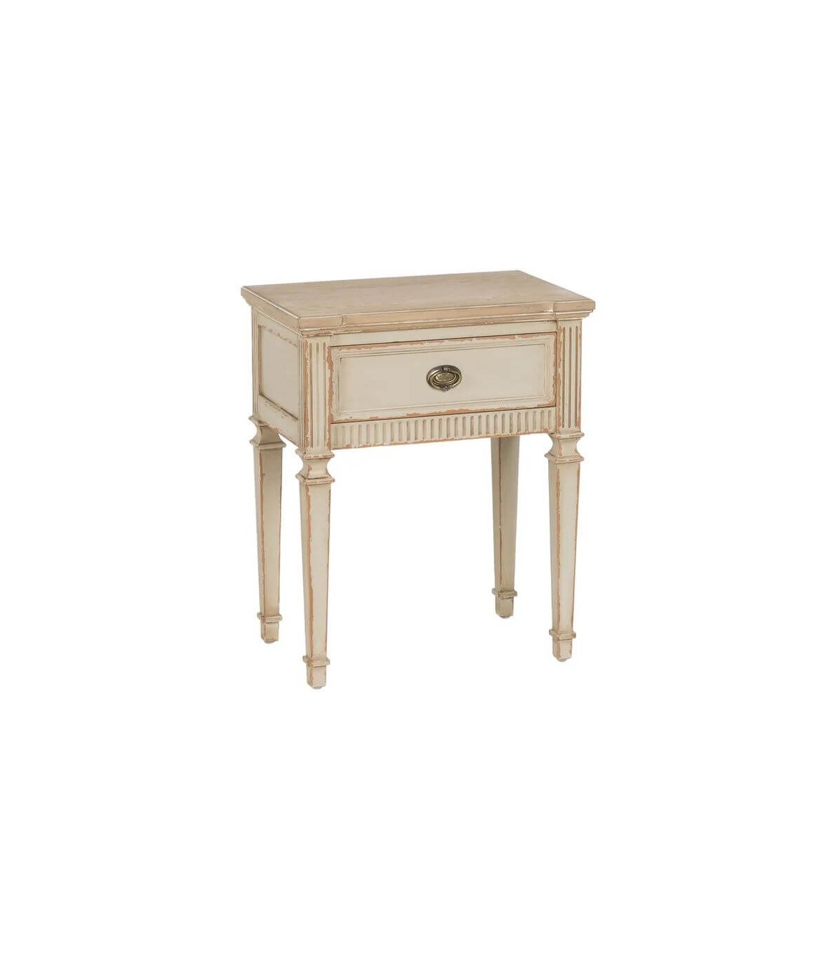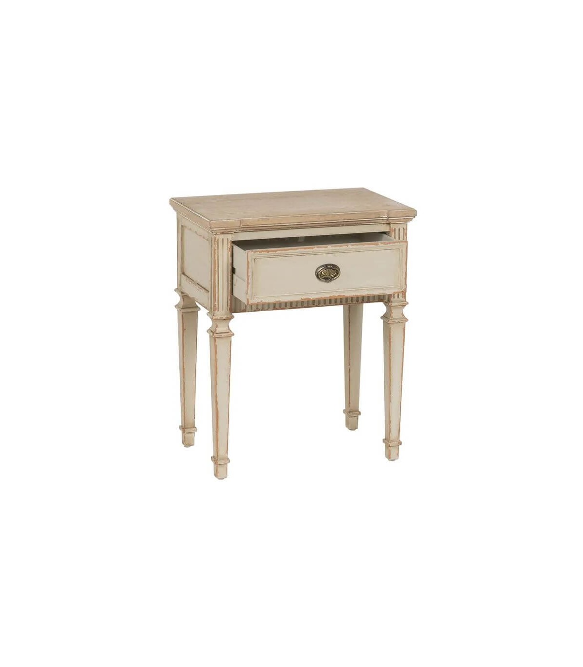 Mesita de noche con 1 cajón estilo clásico, realizado en madera de abeto dm en blanco rozado, una mesita perfecta para tu dormitorio o como mesita auxiliar.