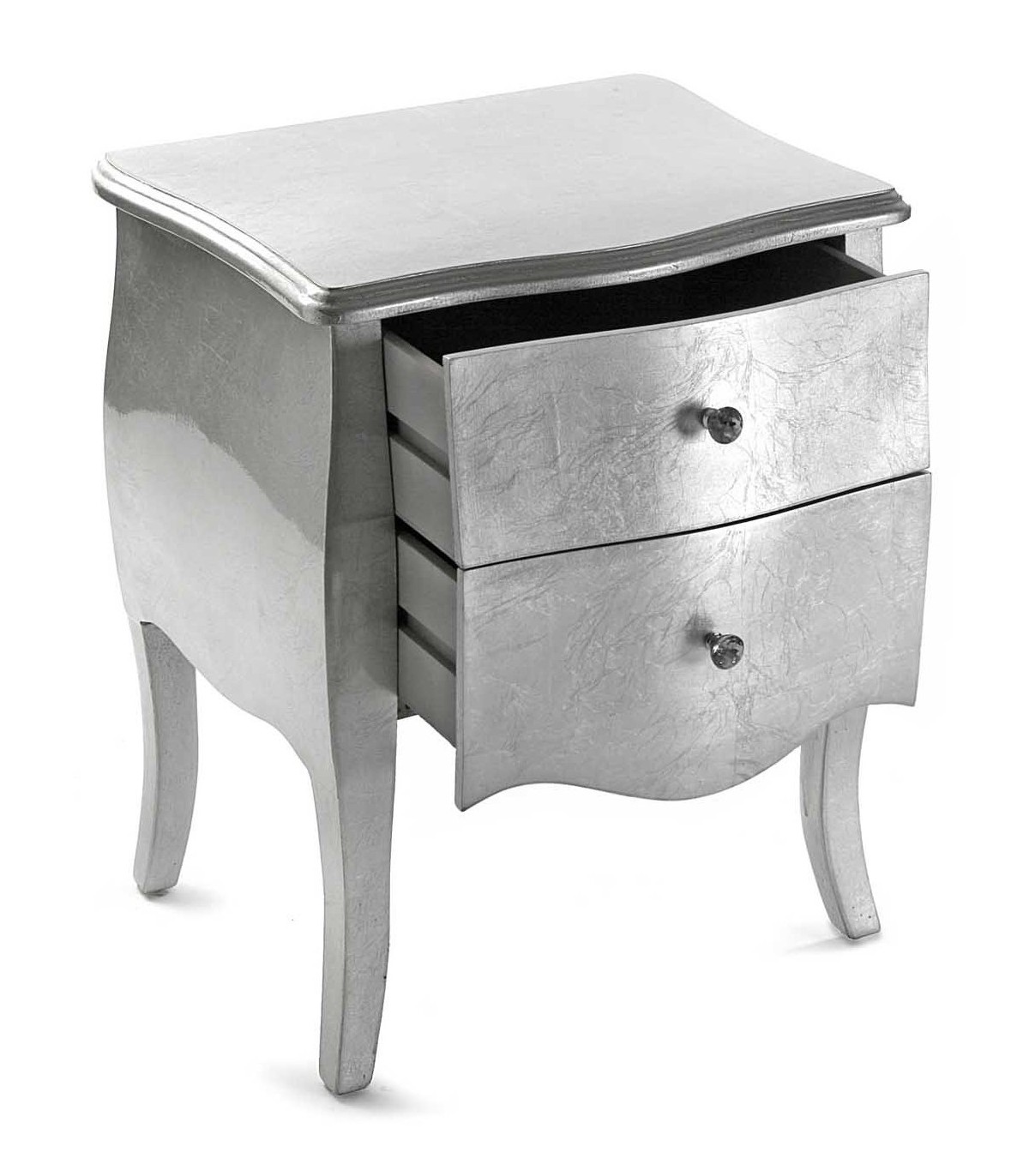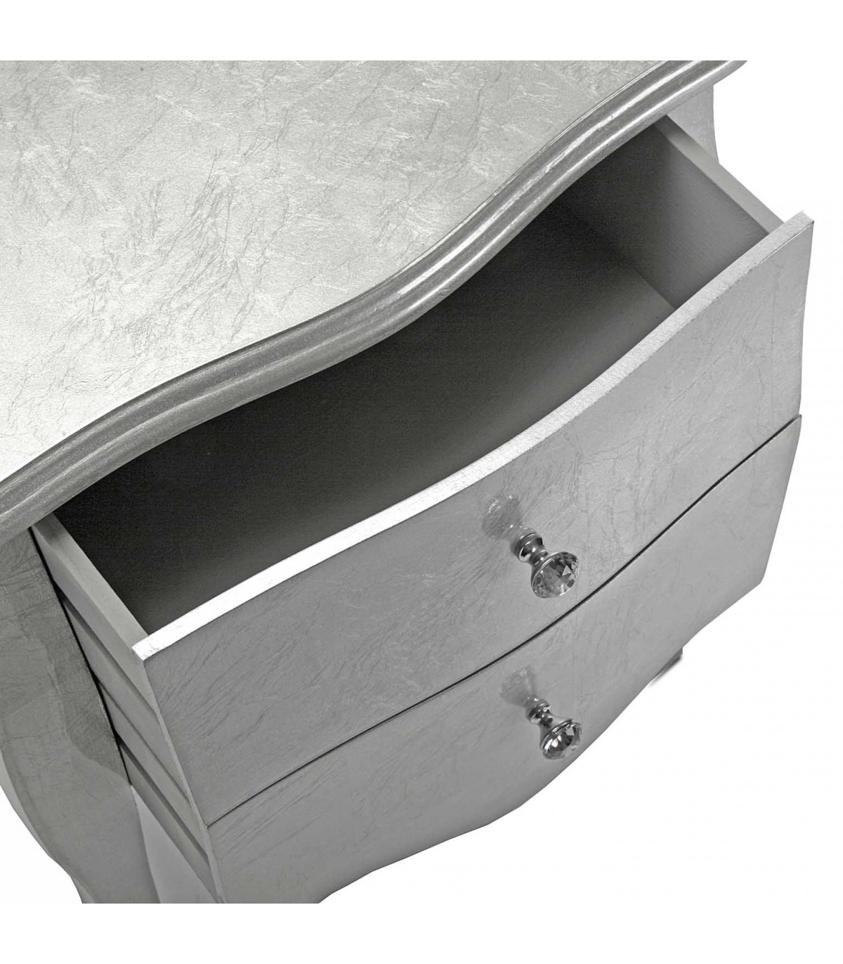 Acabado, madera acabada en pan de plata, tiradores de cristal transparente.