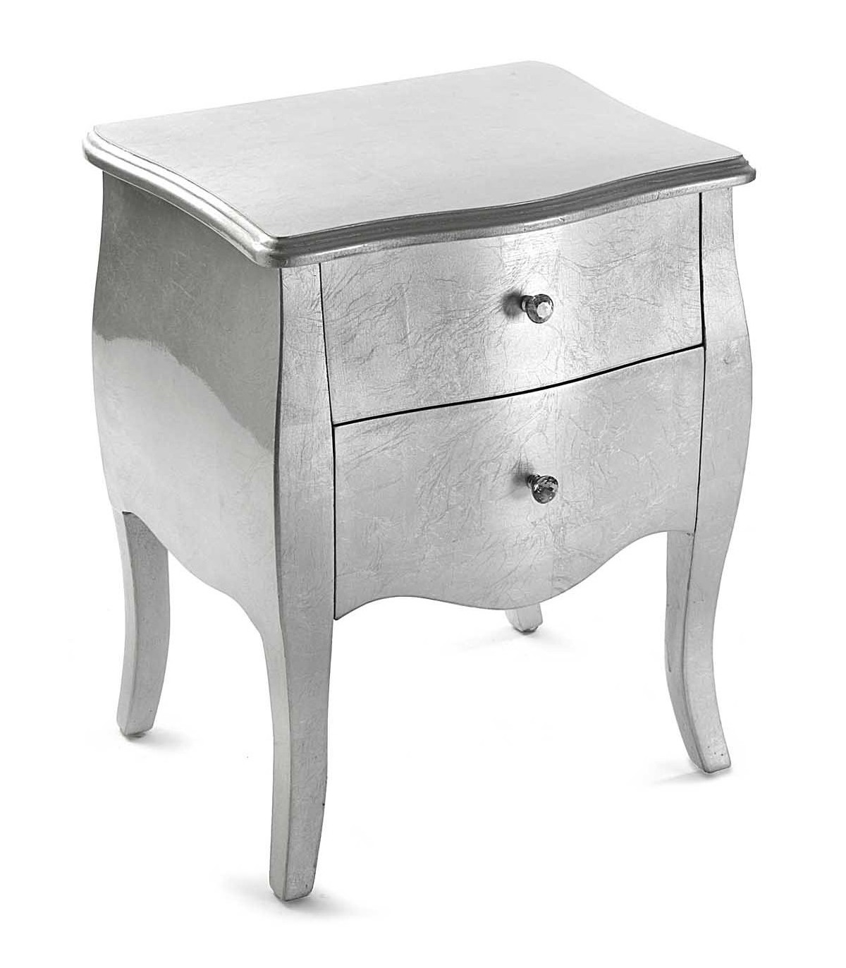 Mesita de noche realizada en madera cubierta de pan de plata con 2 cajones, perfecta para un dormitorio o como mueble auxiliar, para los que quieren un mueble práctico y decorativo, ideal para darle una nota elegante a tu espacio.