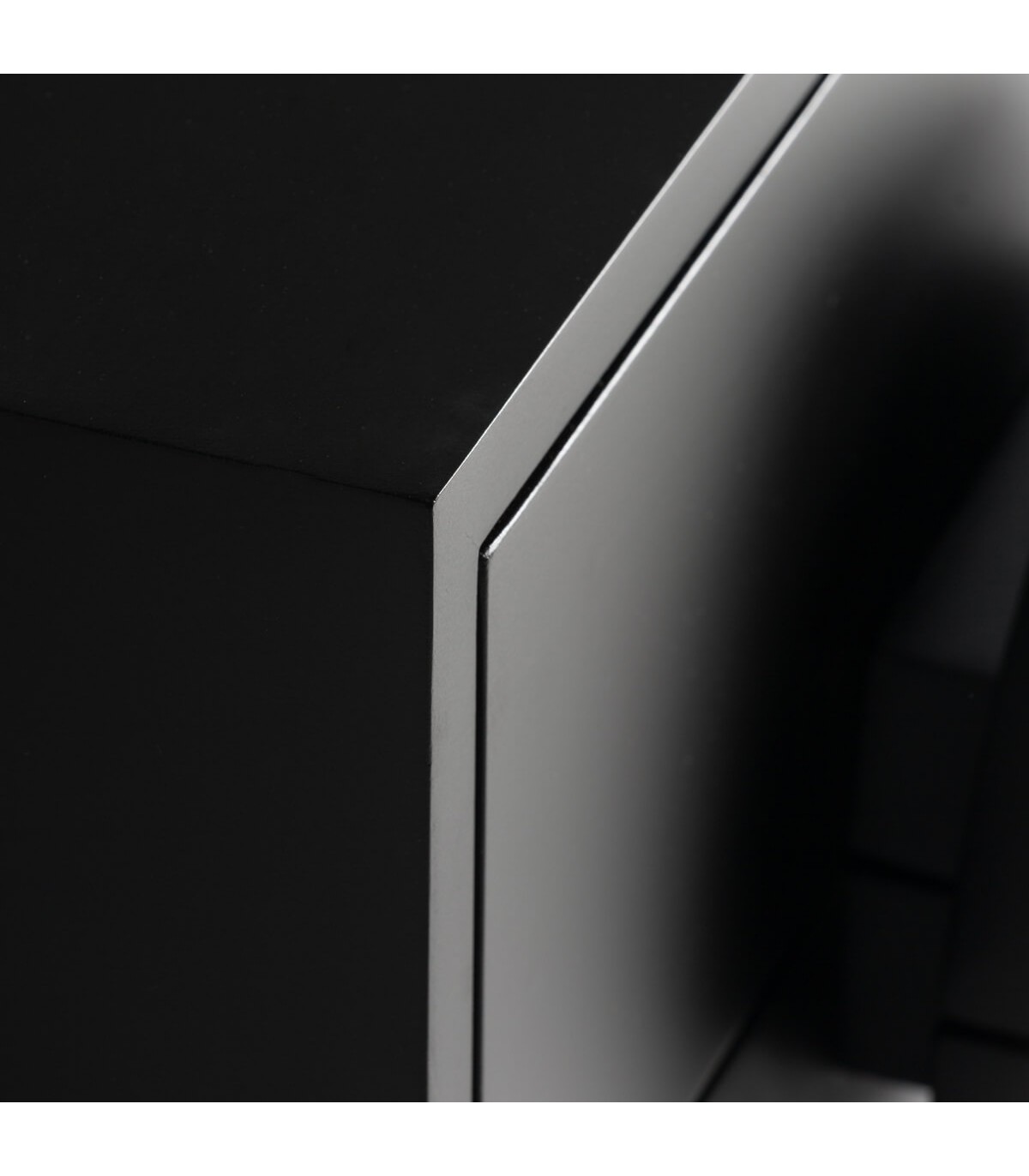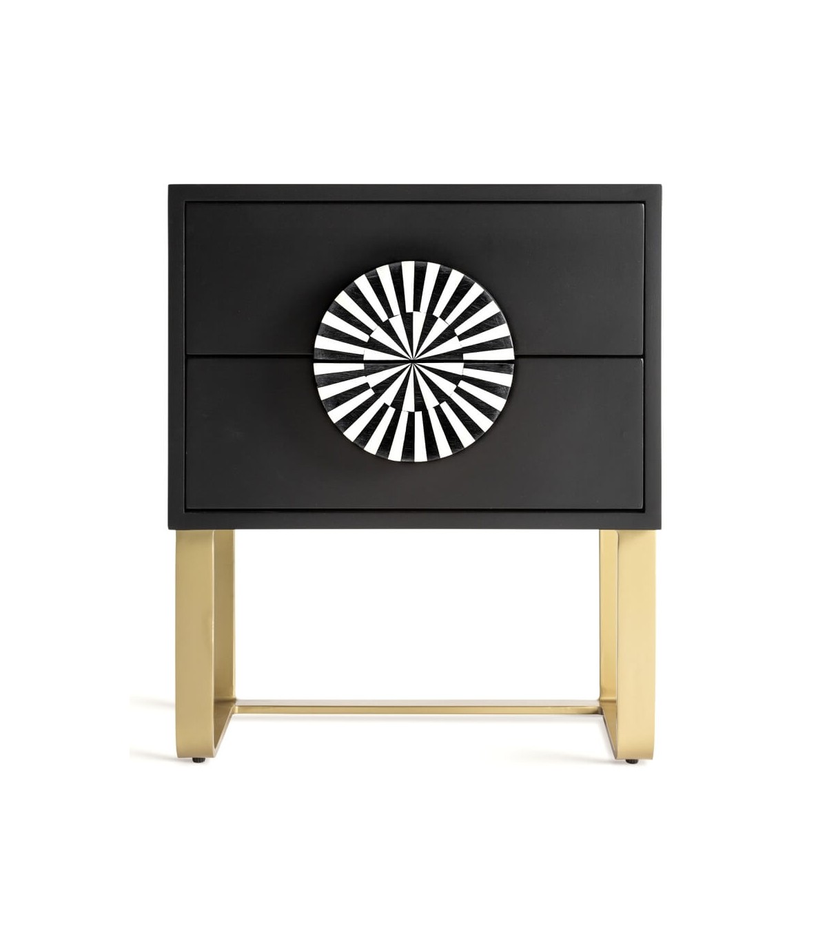 Mesita de noche realizada en madera lacada en negro con las patas en metal acabado oro y un sofisticado tirador con aplicaciones de hueso blanco, una gran mesita de noche que despierta todos los sentidos.