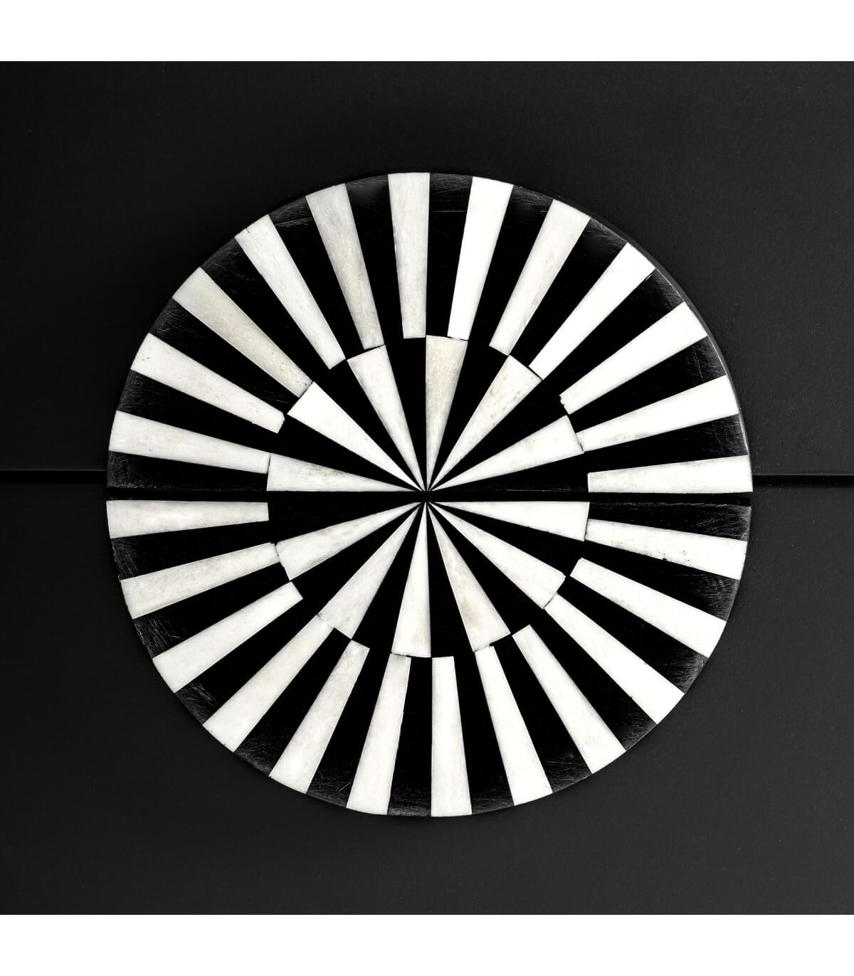 Acabado, madera lacada en negro patas en metal acabado oro, tirador con aplicaciones de hueso blanco