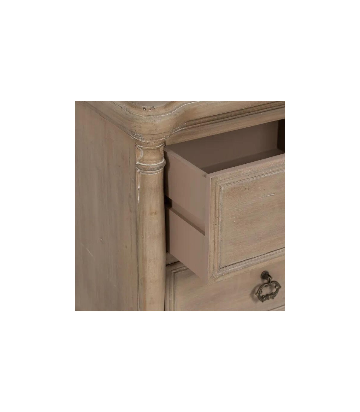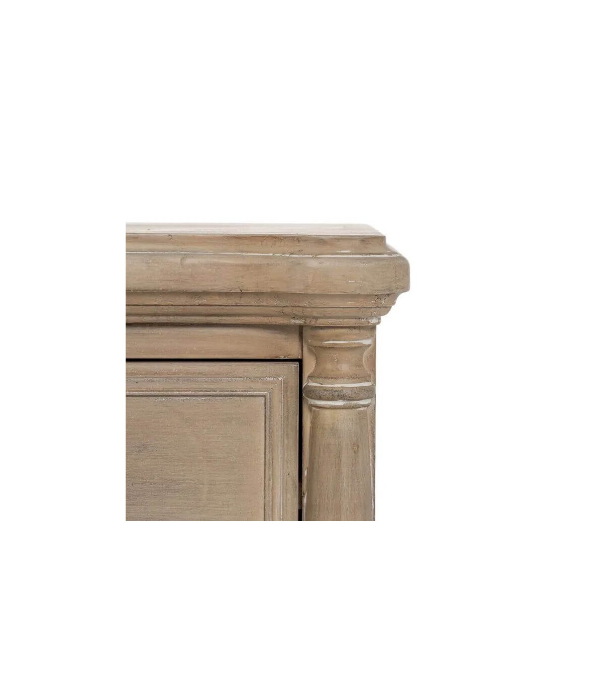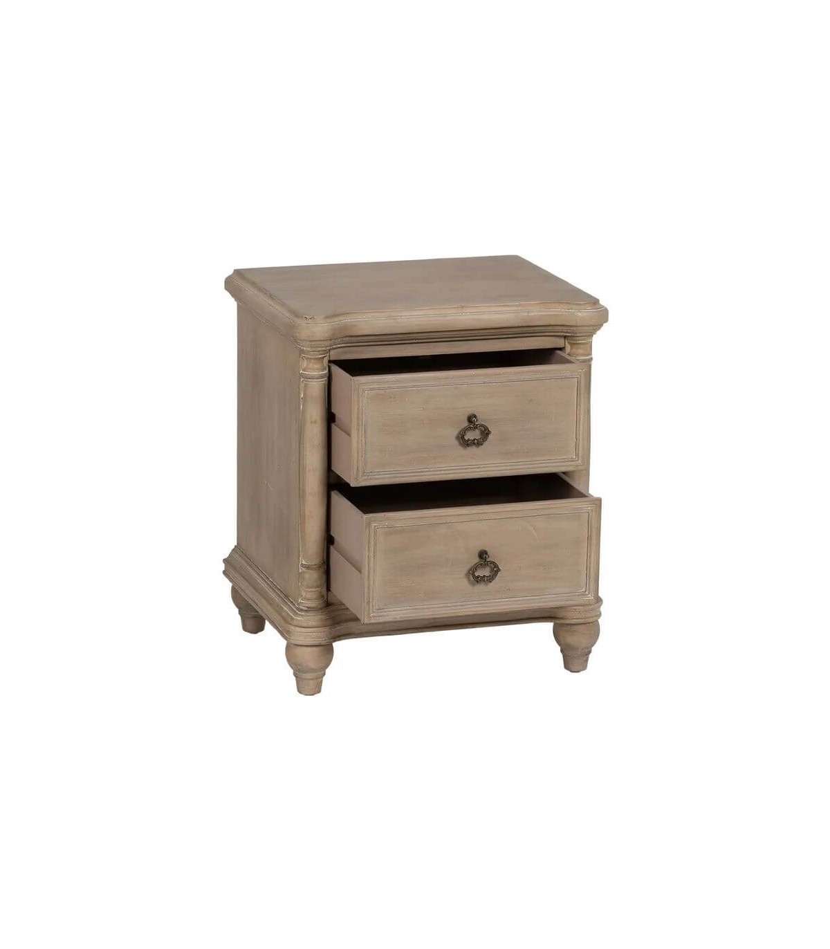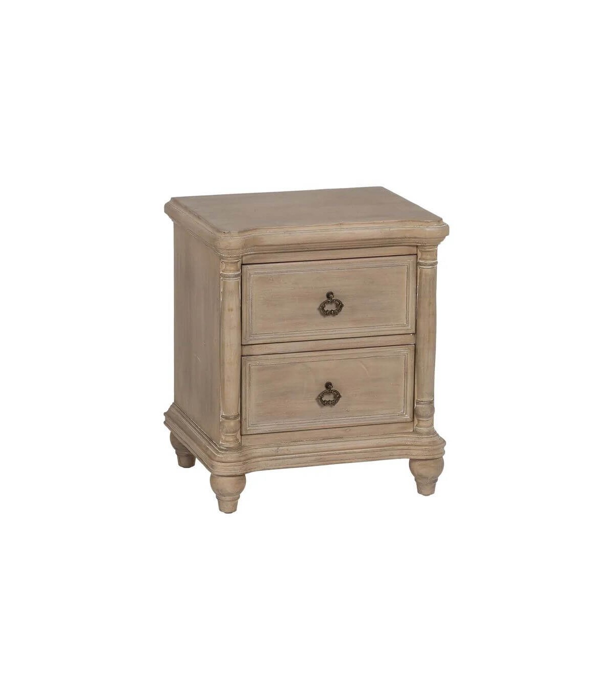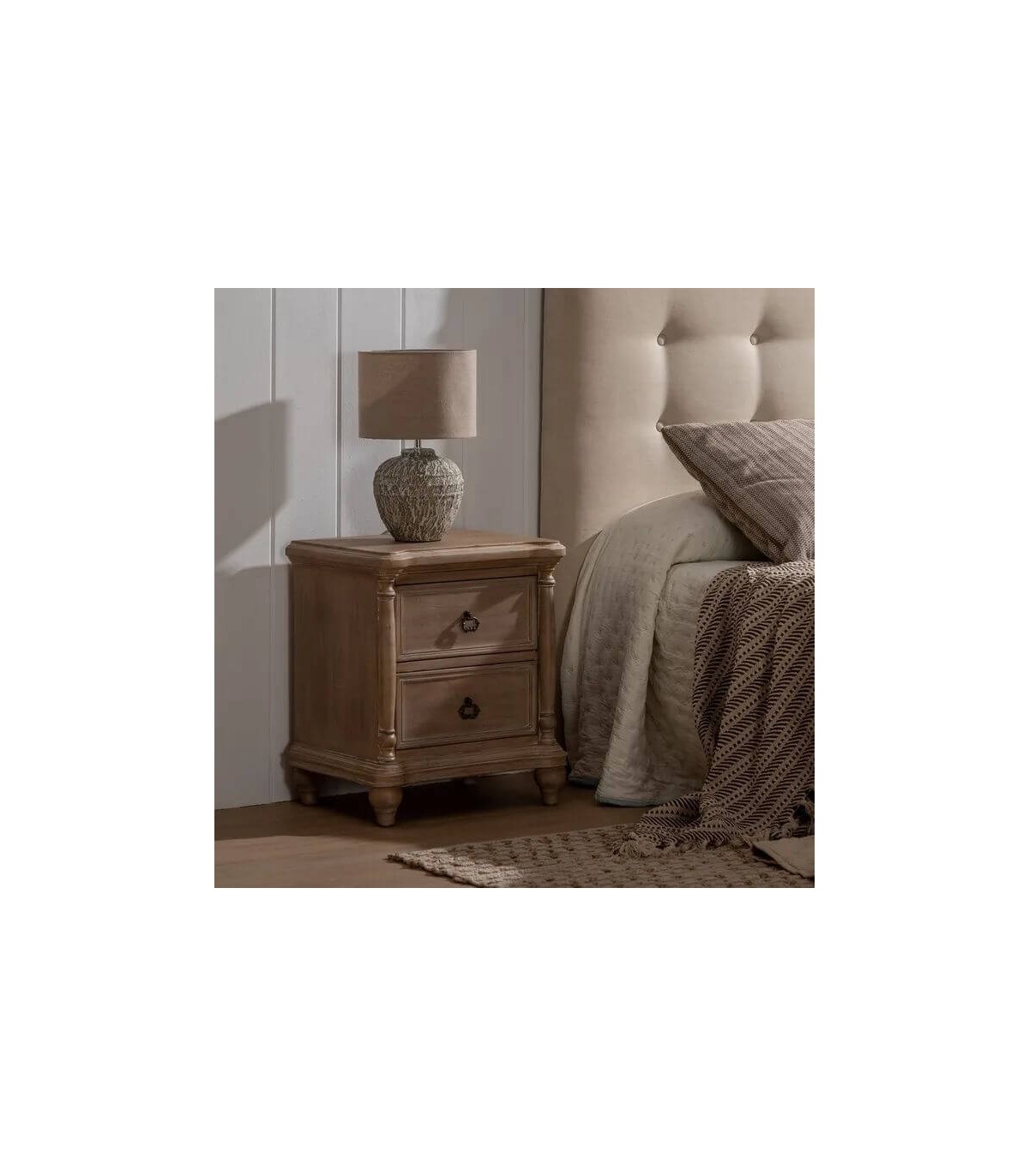 Mesita de noche con 2 cajones, realizada en madera de abeto acabado vintage de estilo colonial, con sus bonitos torneados y su tirador le da ese toque elegante y señorial.