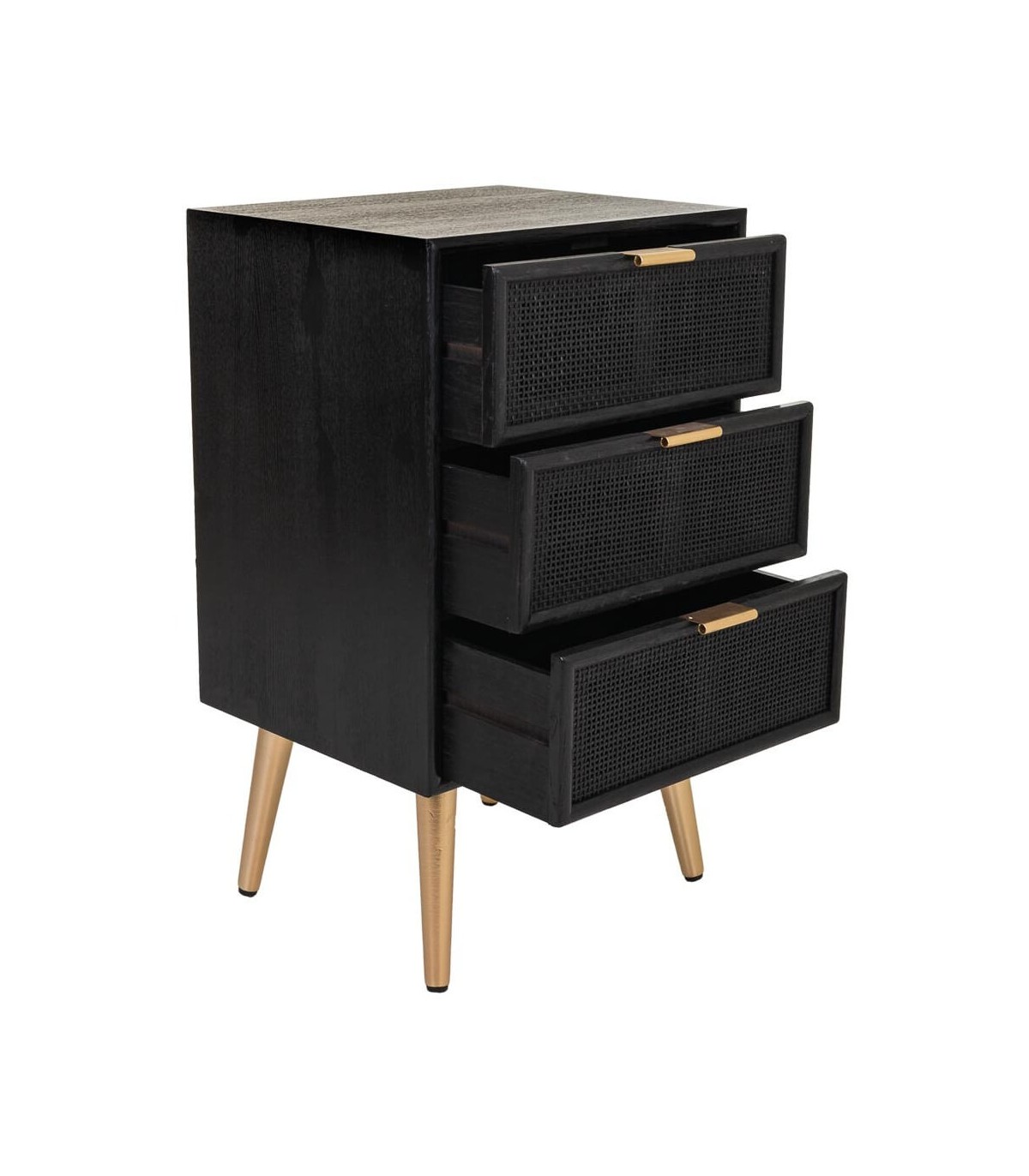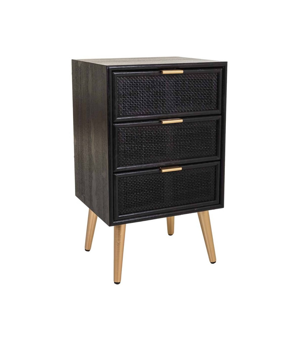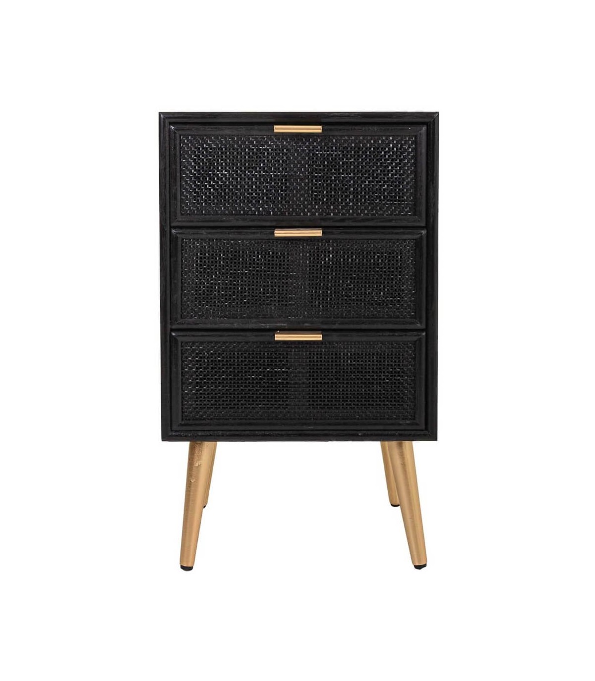 ⚫ Mesita de Noche con 3 Cajones en Madera y Ratán Negro con Patas y Tiradores Dorados – Elegancia y Estilo Contemporáneo ✨