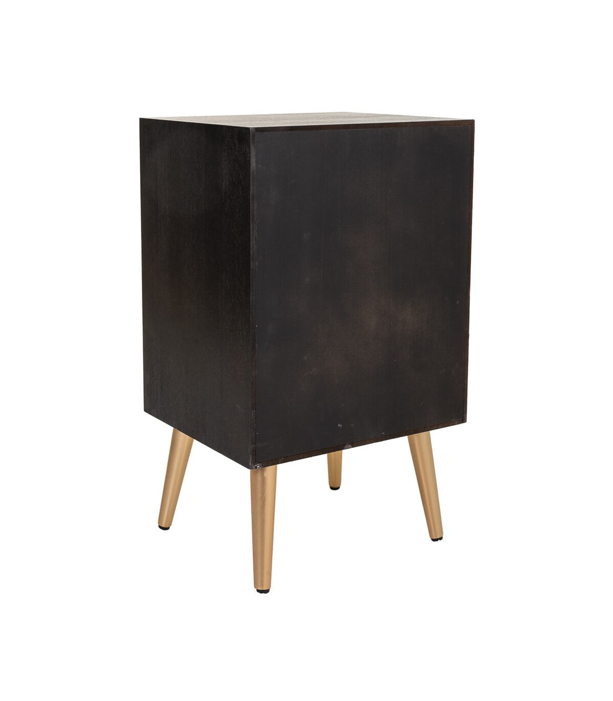 Añade un toque de sofisticación a tu dormitorio con esta mesita de noche de 3 cajones, realizada en madera y ratán teñidos en color negro, combinada elegantemente con patas y tiradores en metal dorado. Su diseño contemporáneo aporta un aire de lujo y exclusividad, mientras que su funcionalidad y amplio espacio de almacenamiento la hacen perfecta para mantener tu espacio organizado y elegante. Ideal para ambientes modernos y de inspiración glam.