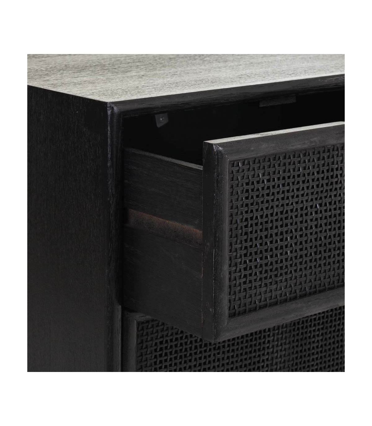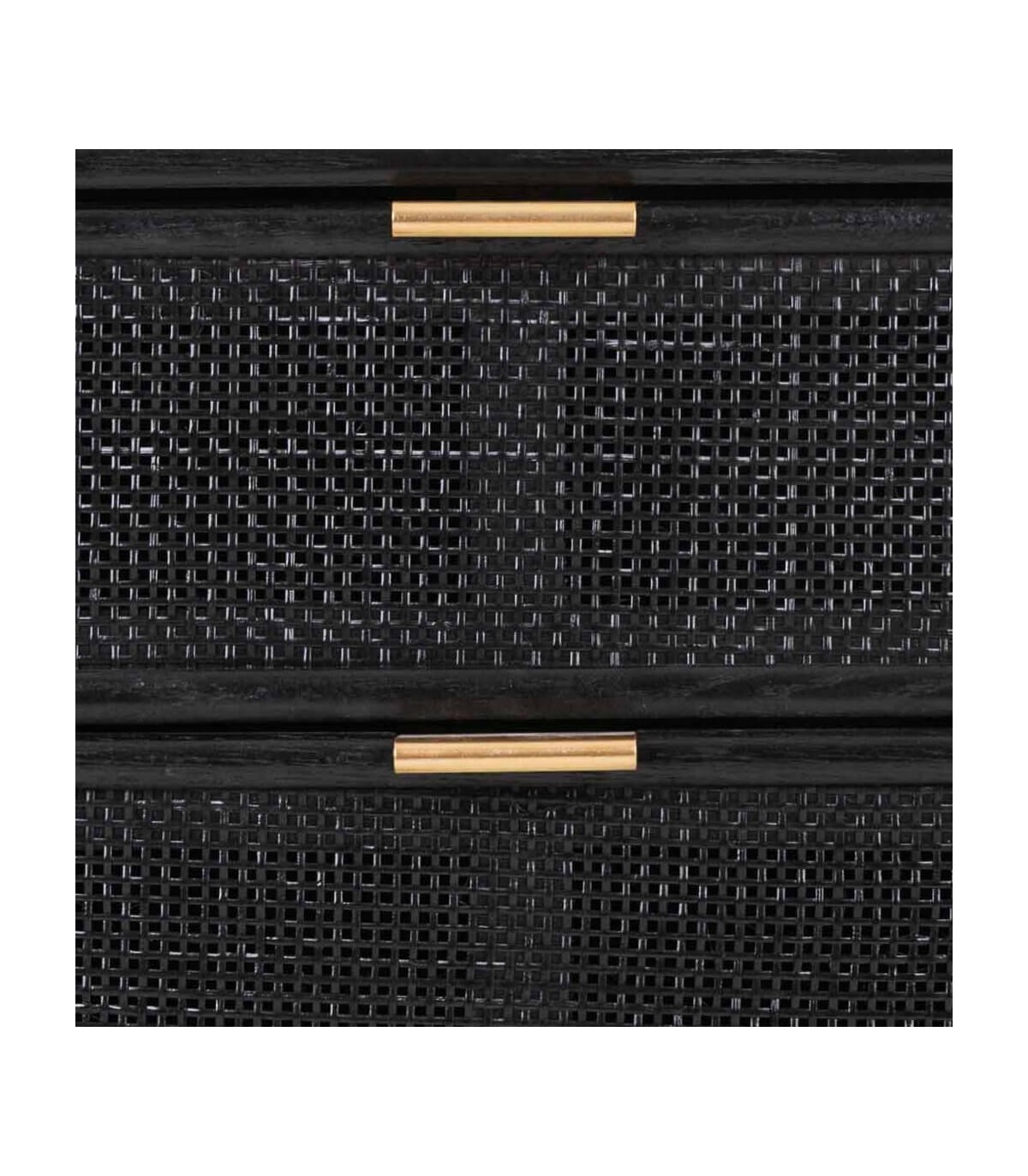 Acabado, madera y ratán teñido color negro, patas y tiradores dorado.