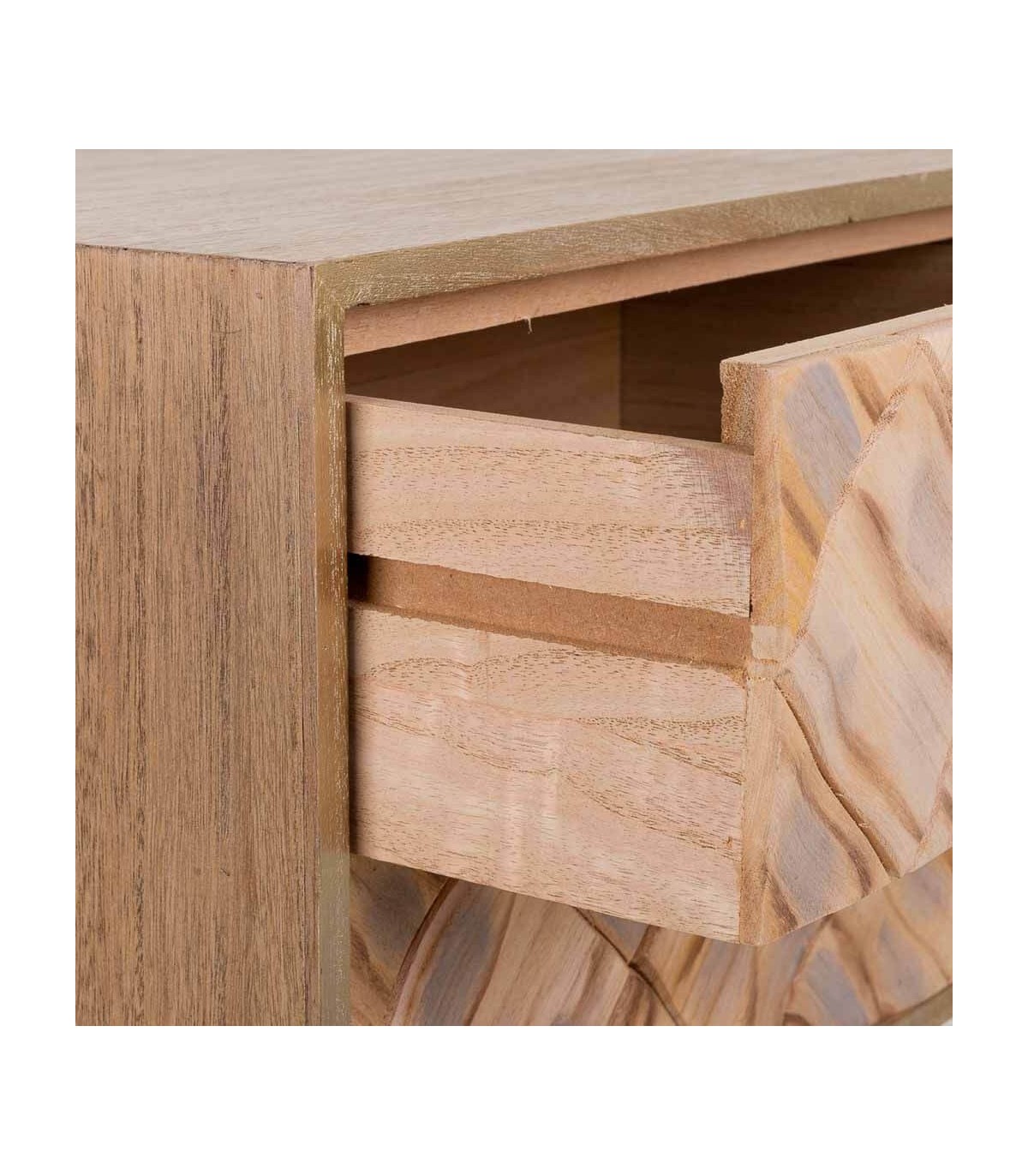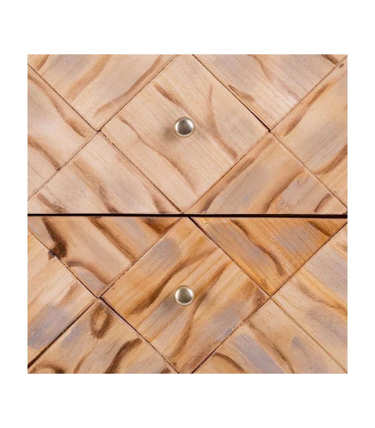 Mesita de noche de nuestra colección Naxos, una colección que se caracteriza por su estilo art decó, realizada en madera natural con los cantos perfilados en oro, de líneas rectas con el contraste de los dibujos dameados en sus frentes realizado artesanalmente y el contraste con el oro, una colección muy elegante con muebles y complementos patra cualquier lugar de tu casa.
