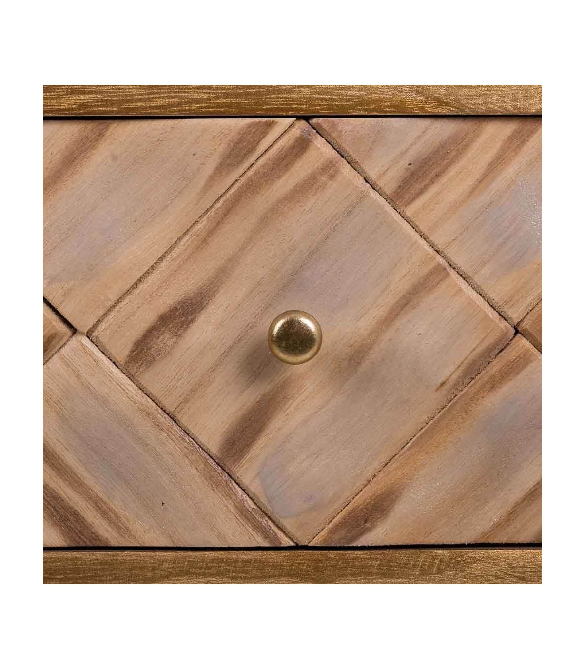 Mesita de noche de nuestra colección Naxos, una colección que se caracteriza por su estilo art decó, realizada en madera natural con los cantos perfilados en oro, de líneas rectas con el contraste de los dibujos dameados en sus frentes realizado artesanalmente y el contraste con el oro, una colección muy elegante con muebles y complementos patra cualquier lugar de tu casa.