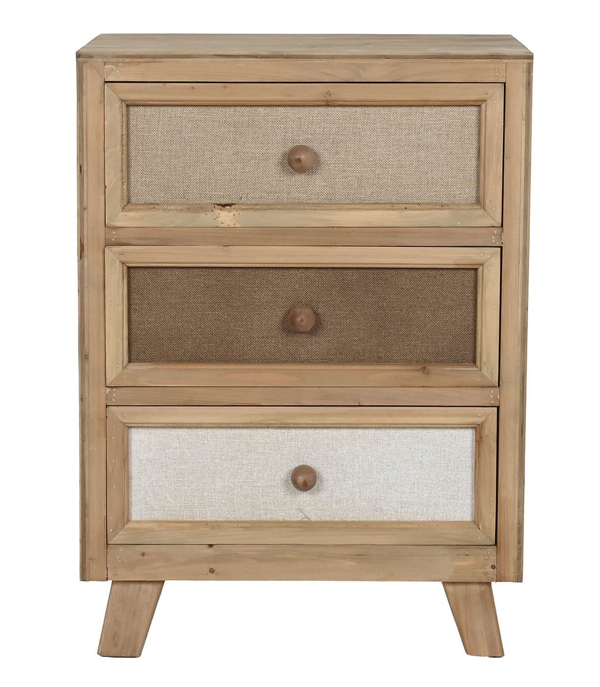 Mesita de noche con 3 cajones realizada en madera de abeto natural con el frente de los cajones tapizados en lino en 3 tonos diferentes, una mesita de noche original y cálida.