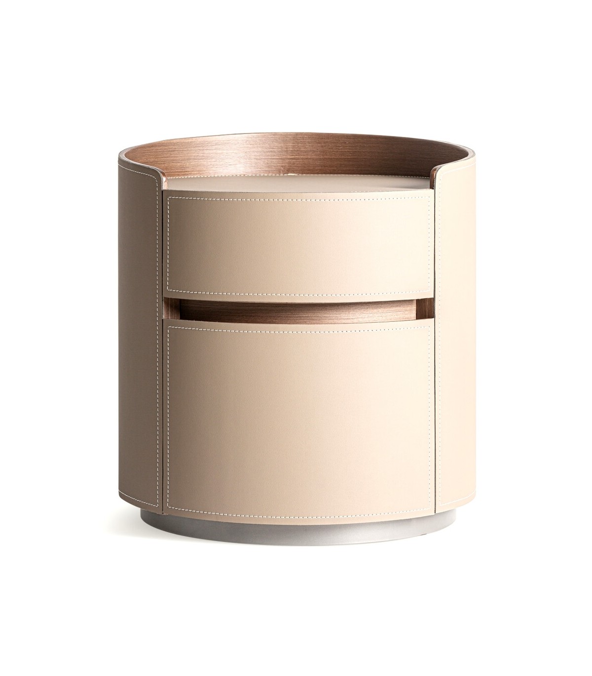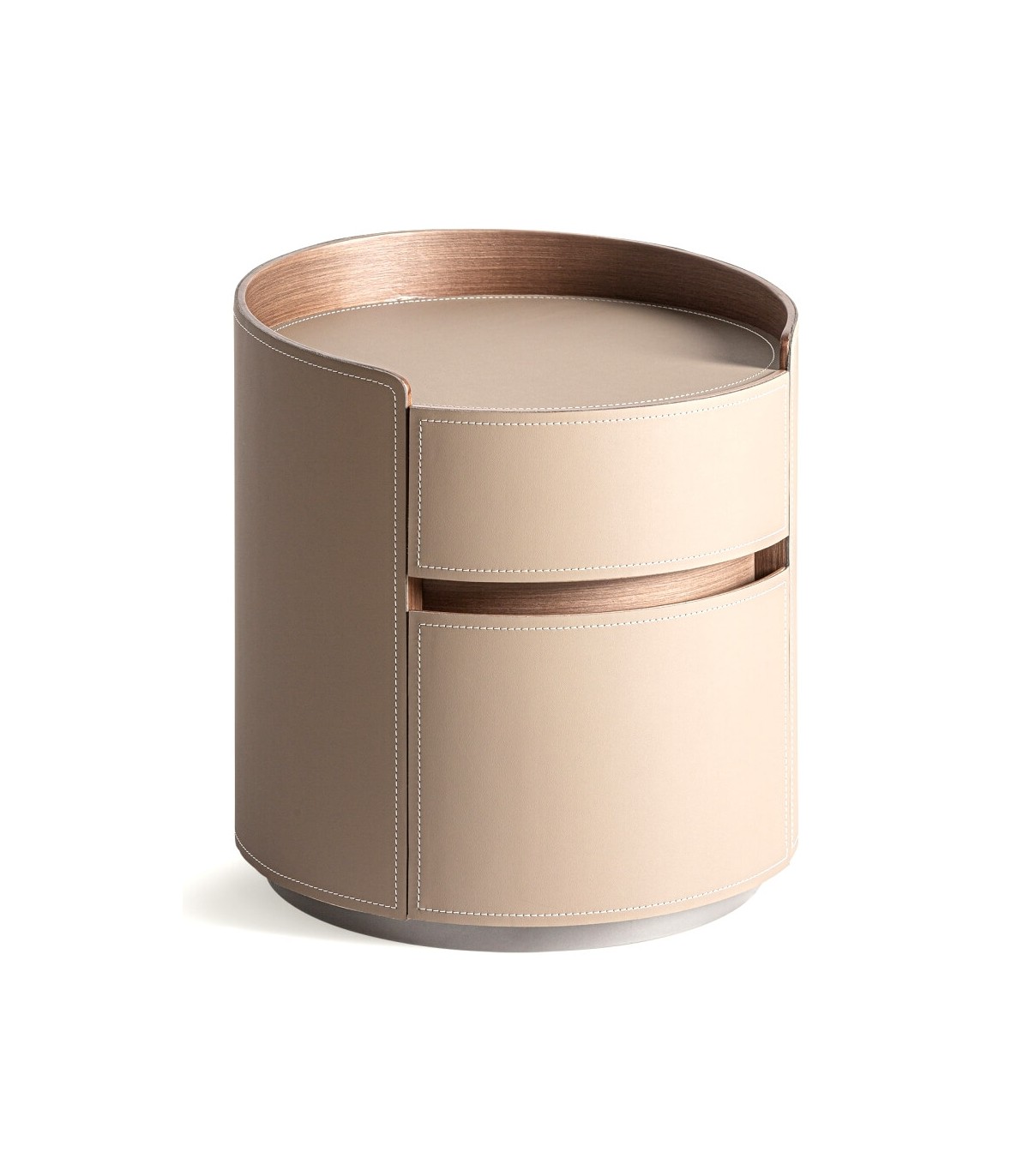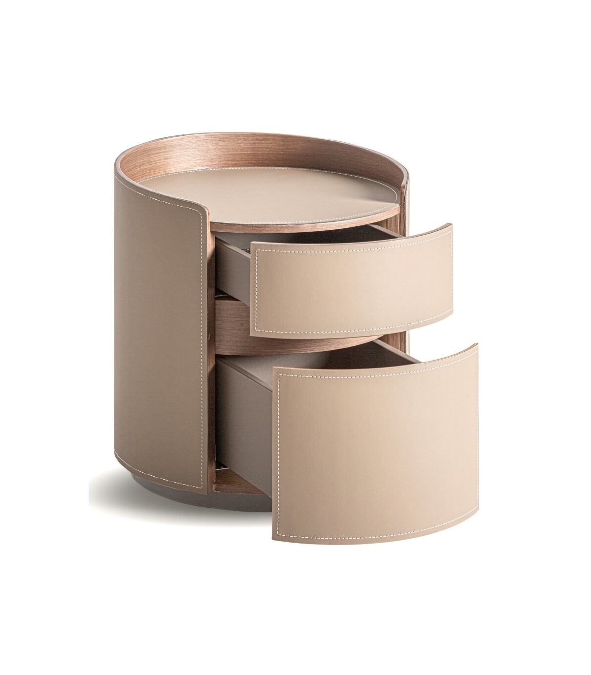 Mesita de noche redonda con 2 cajones realizada en madera contrachapada natural y polipiel en color beige, Una mesita que descarga mucho visualmente por su redondez, muy elegante y original.