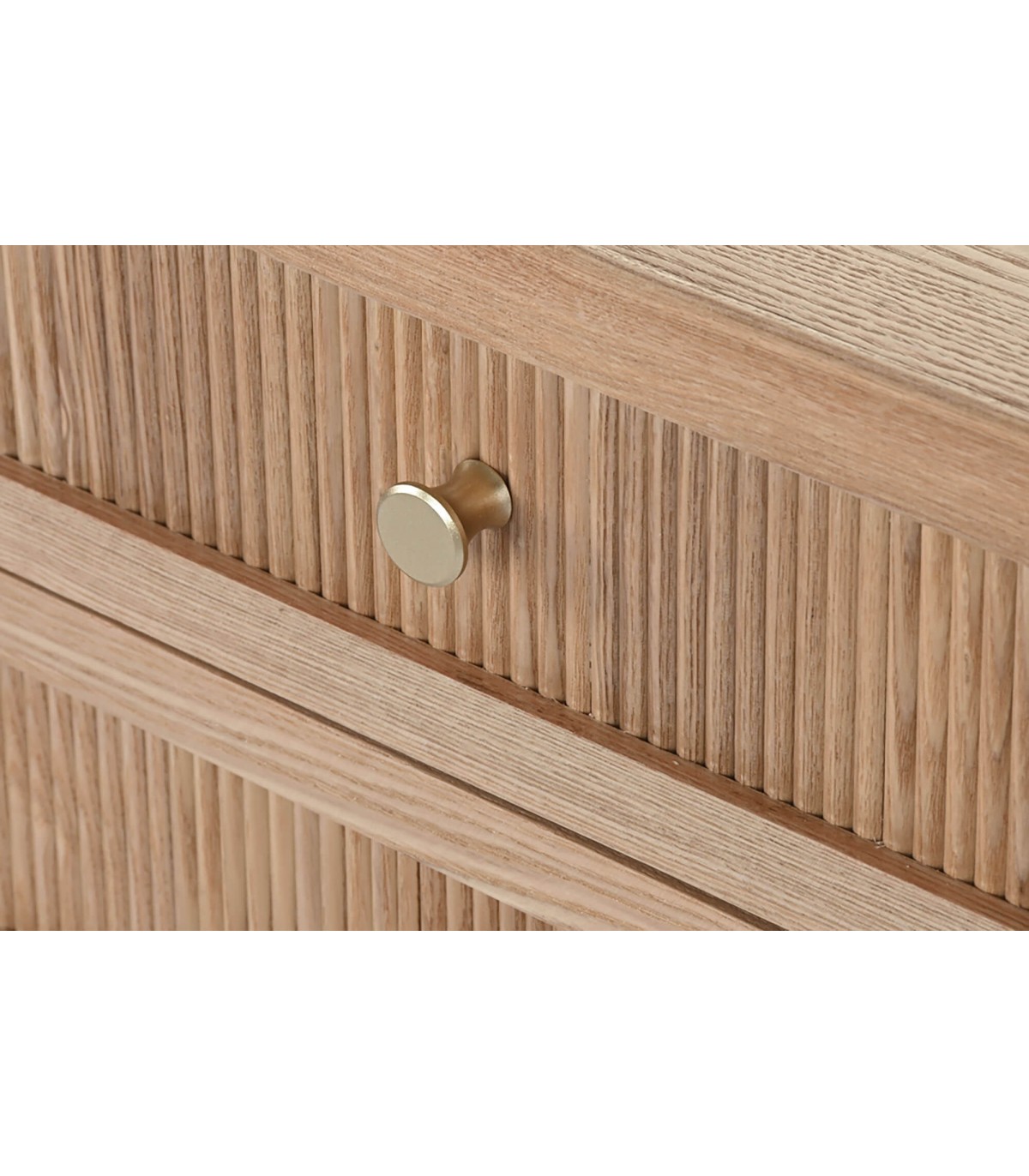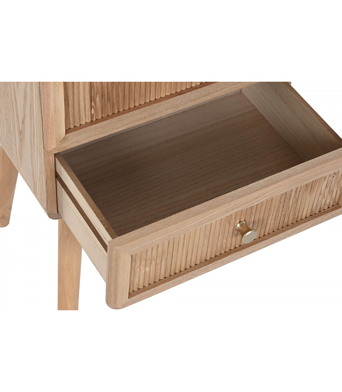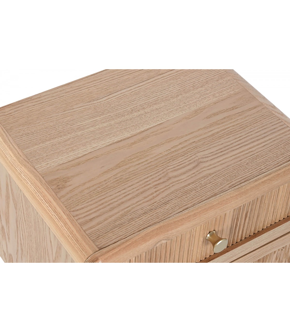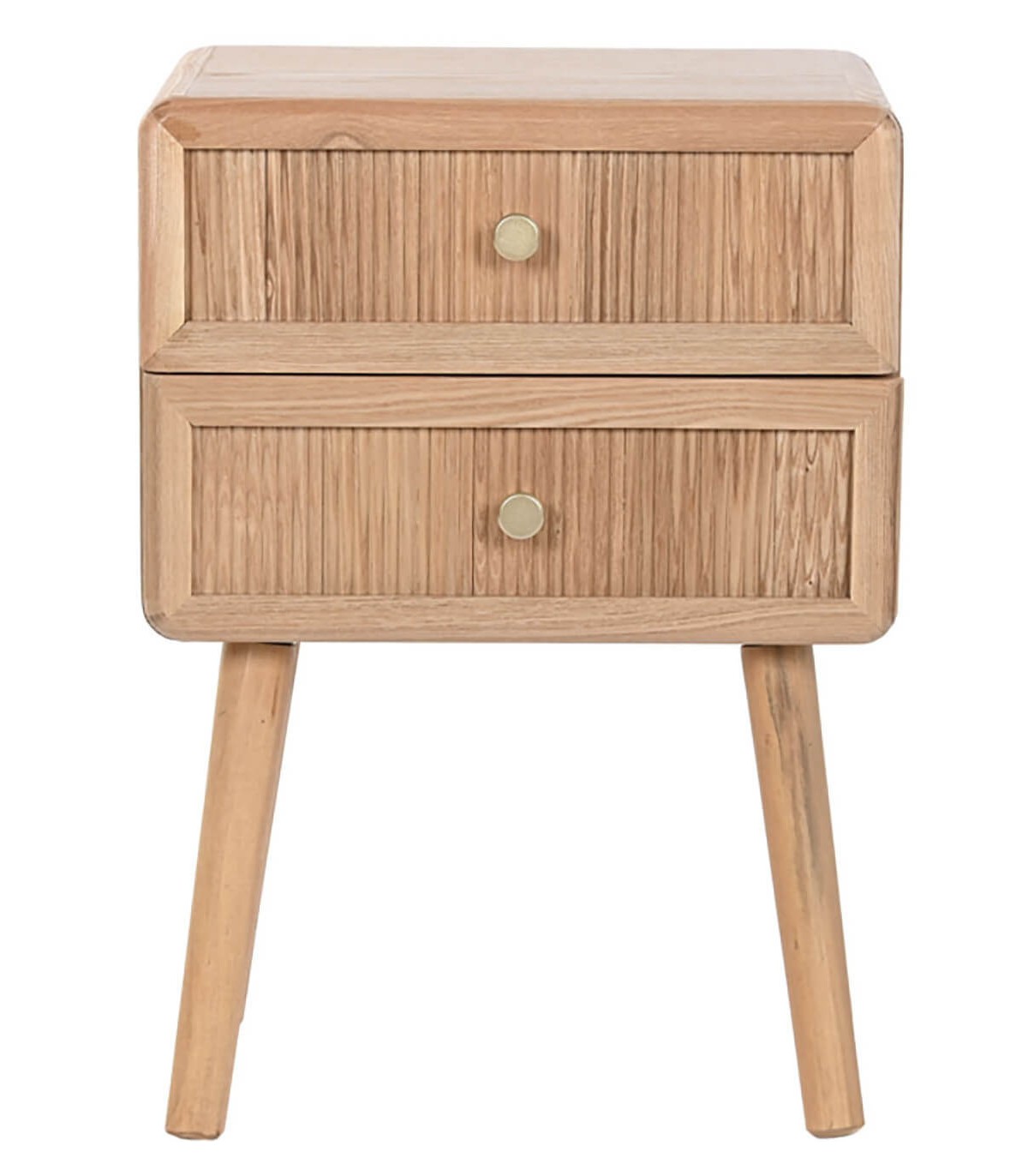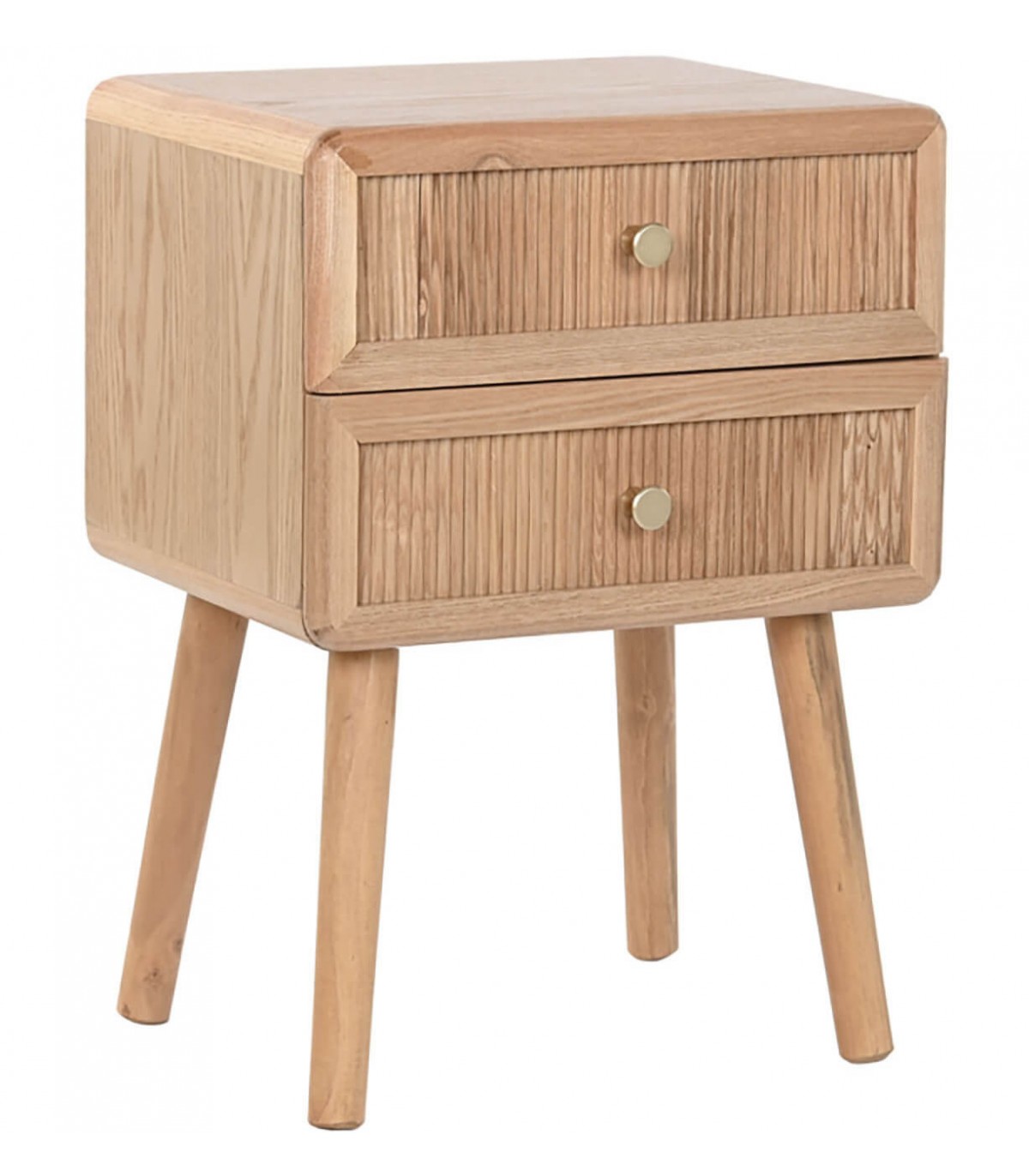 Esta mesita de noche presenta un diseño compacto y funcional con esencia escandinava. Fabricada en madera de pino natural, ofrece dos cajones frontales con acabado acanalado y tiradores redondos metálicos en dorado mate.