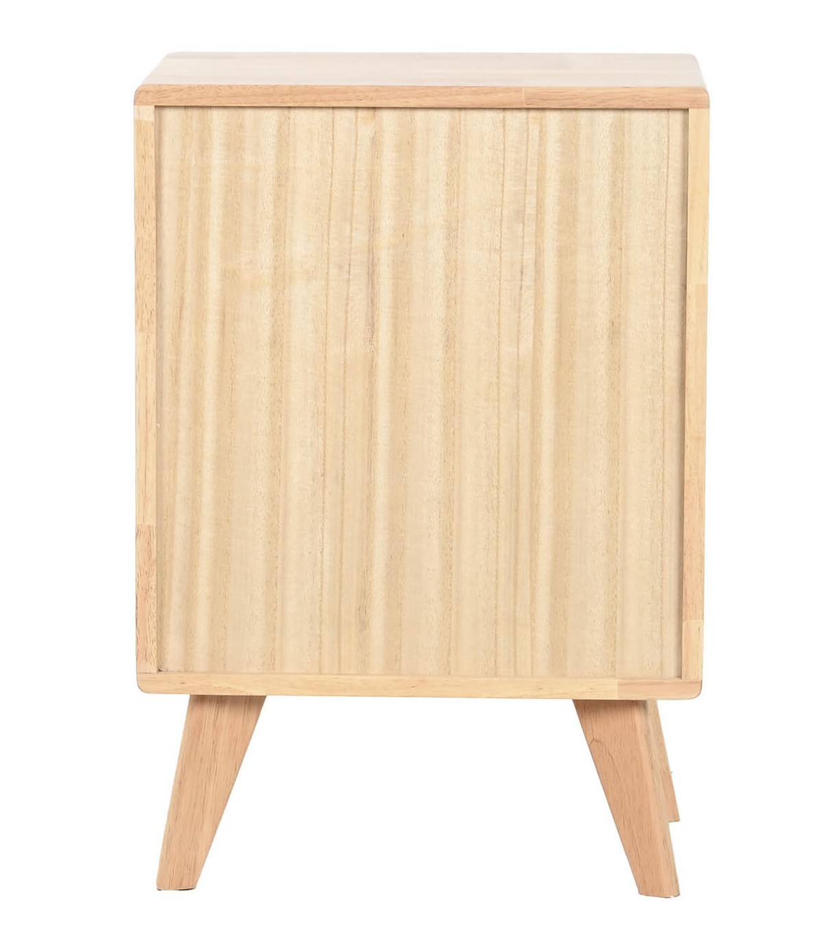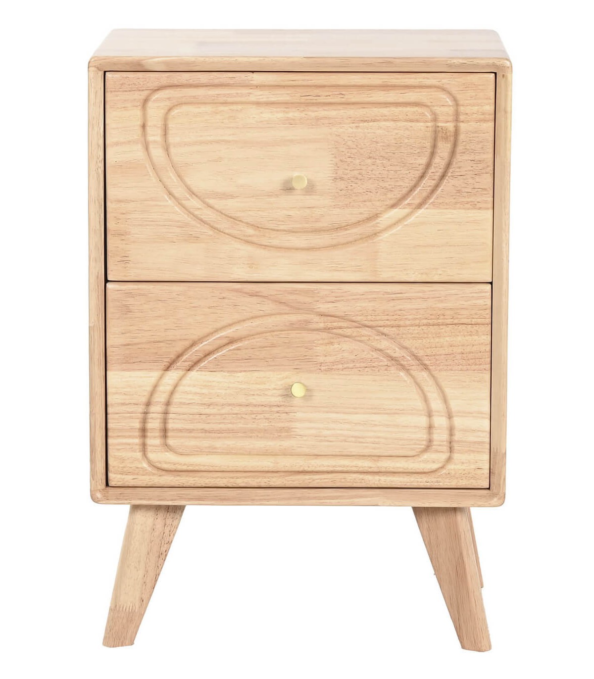 Una pieza funcional y decorativa que encaja a la perfección en interiores nórdicos, escandinavos o de inspiración natural. Esta mesita de noche de líneas rectas y patas inclinadas está fabricada en madera de hevea, con un bonito labrado semicírculo en cada frente de cajón.