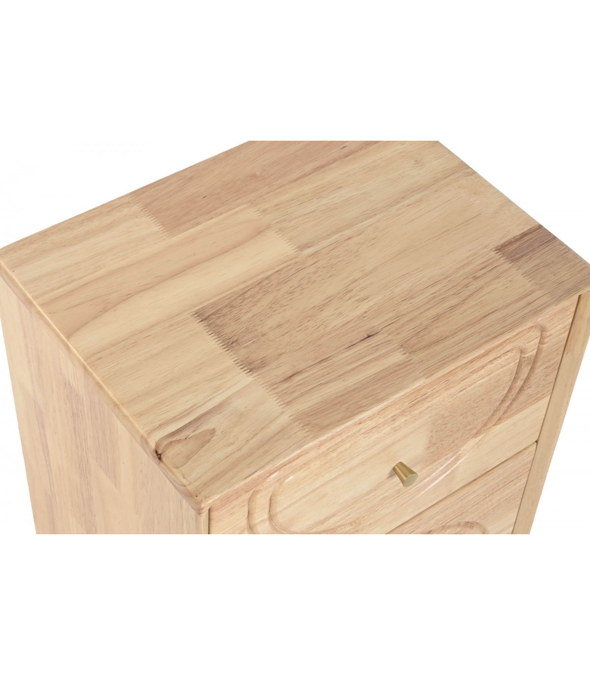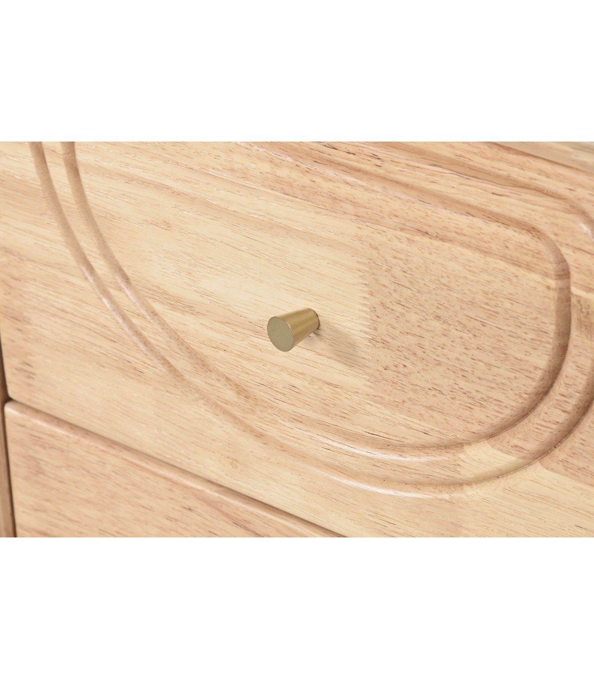 El acabado natural deja visible la veta de la madera y aporta calidez, mientras que los tiradores de metal dorado suman un sutil toque elegante. Práctica y con encanto, ideal para dar equilibrio y estilo a tu dormitorio.