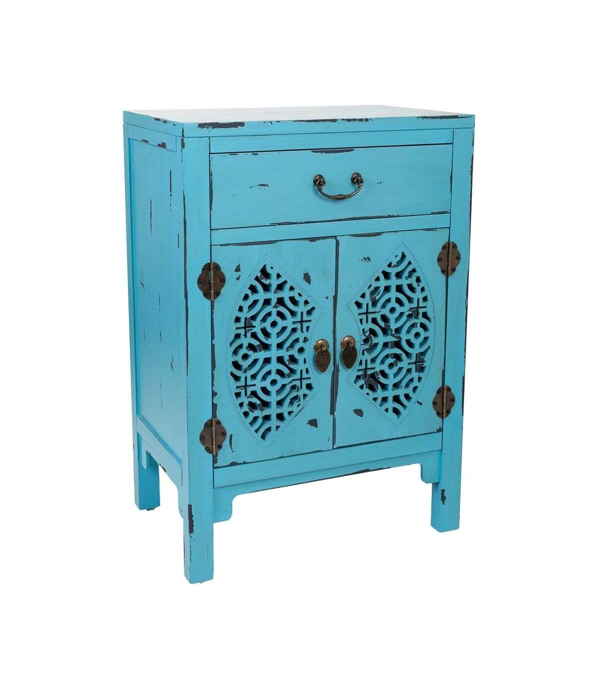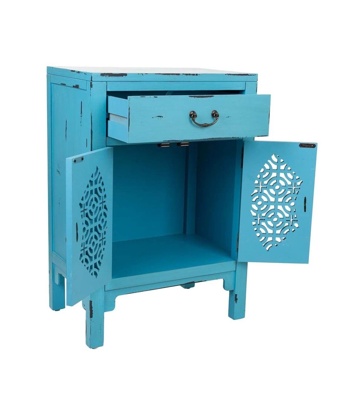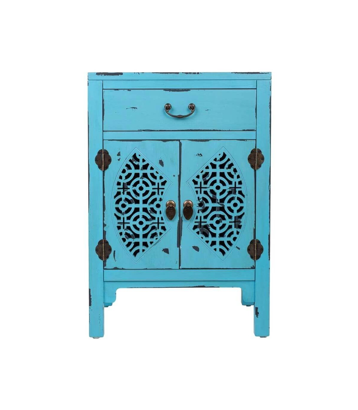 Mesita de noche de nuestra colección de muebles Makalu, una colección de inspiración oriental, realizada artesanalmente con los frentes de las puertas tallados a mano y decapado en tres colores diferentes, una fiesta de color que le dará alegría y viveza a a tu decoración.
