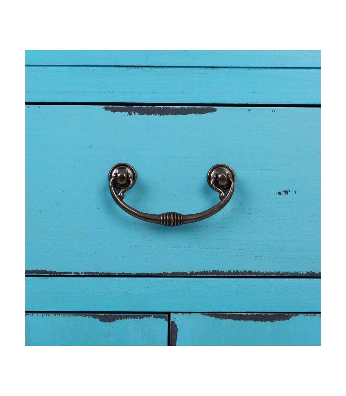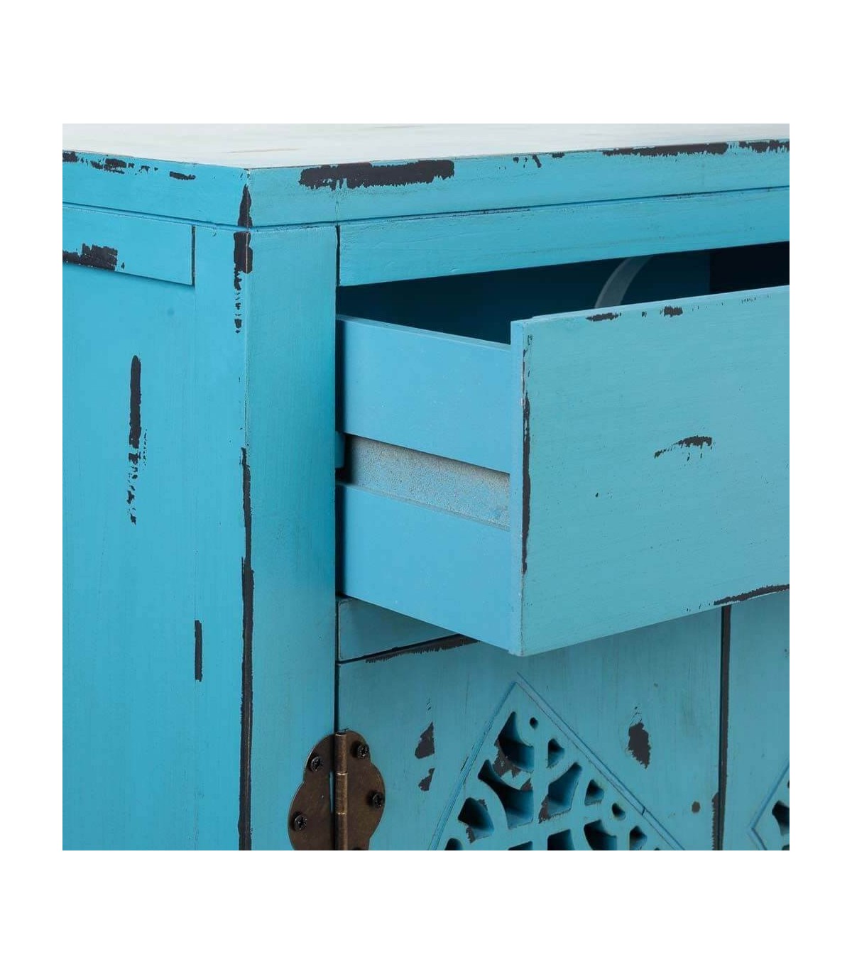 Acabado, artesanal, frente de las puertas talladas a mano, decapado azul, tiradores de bronce.