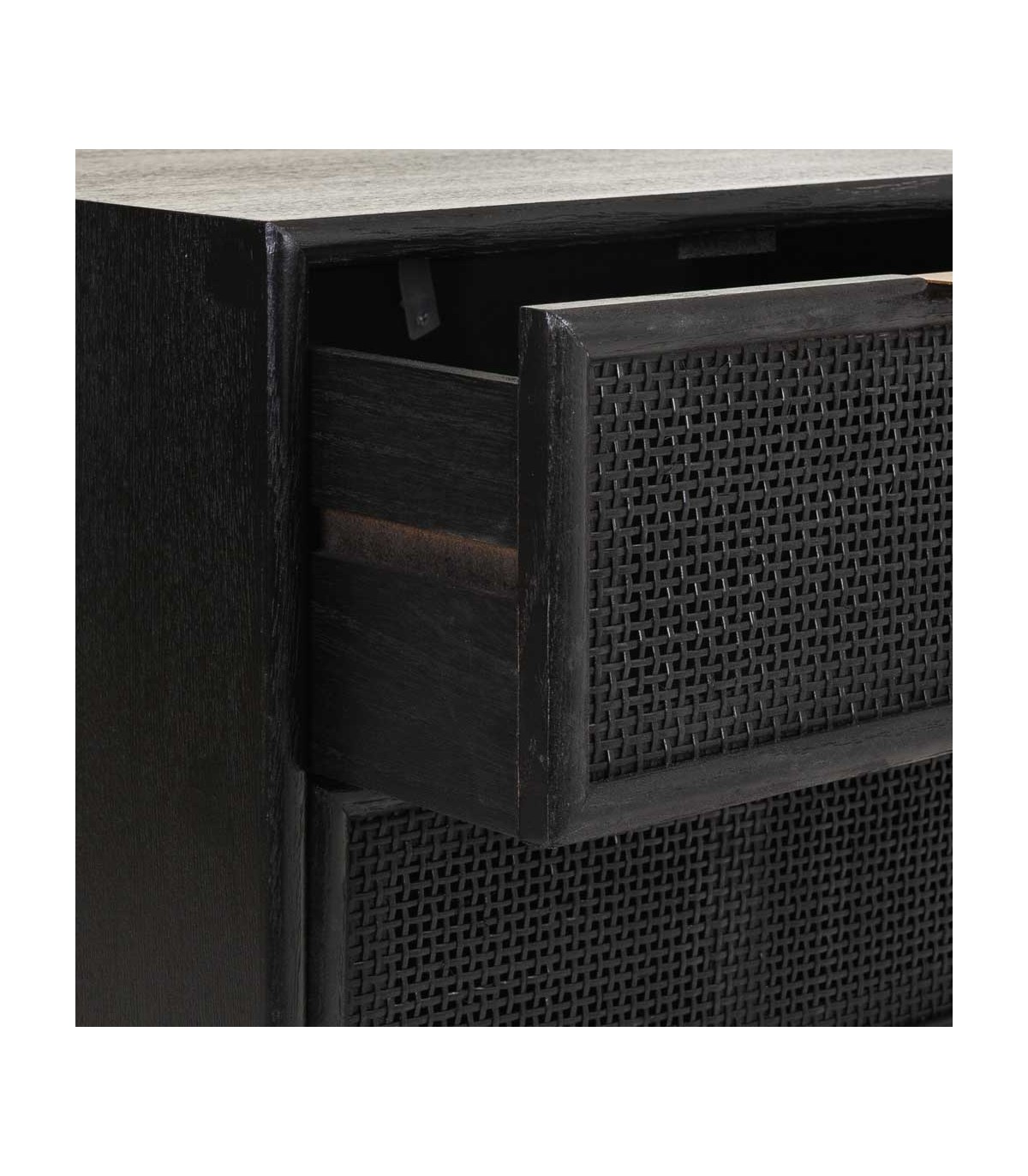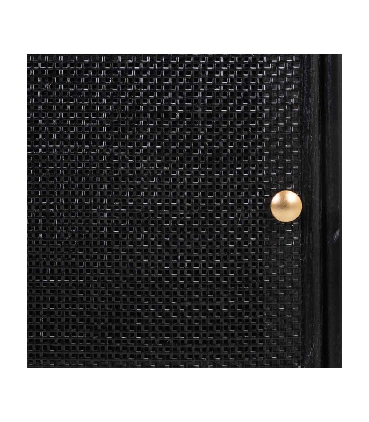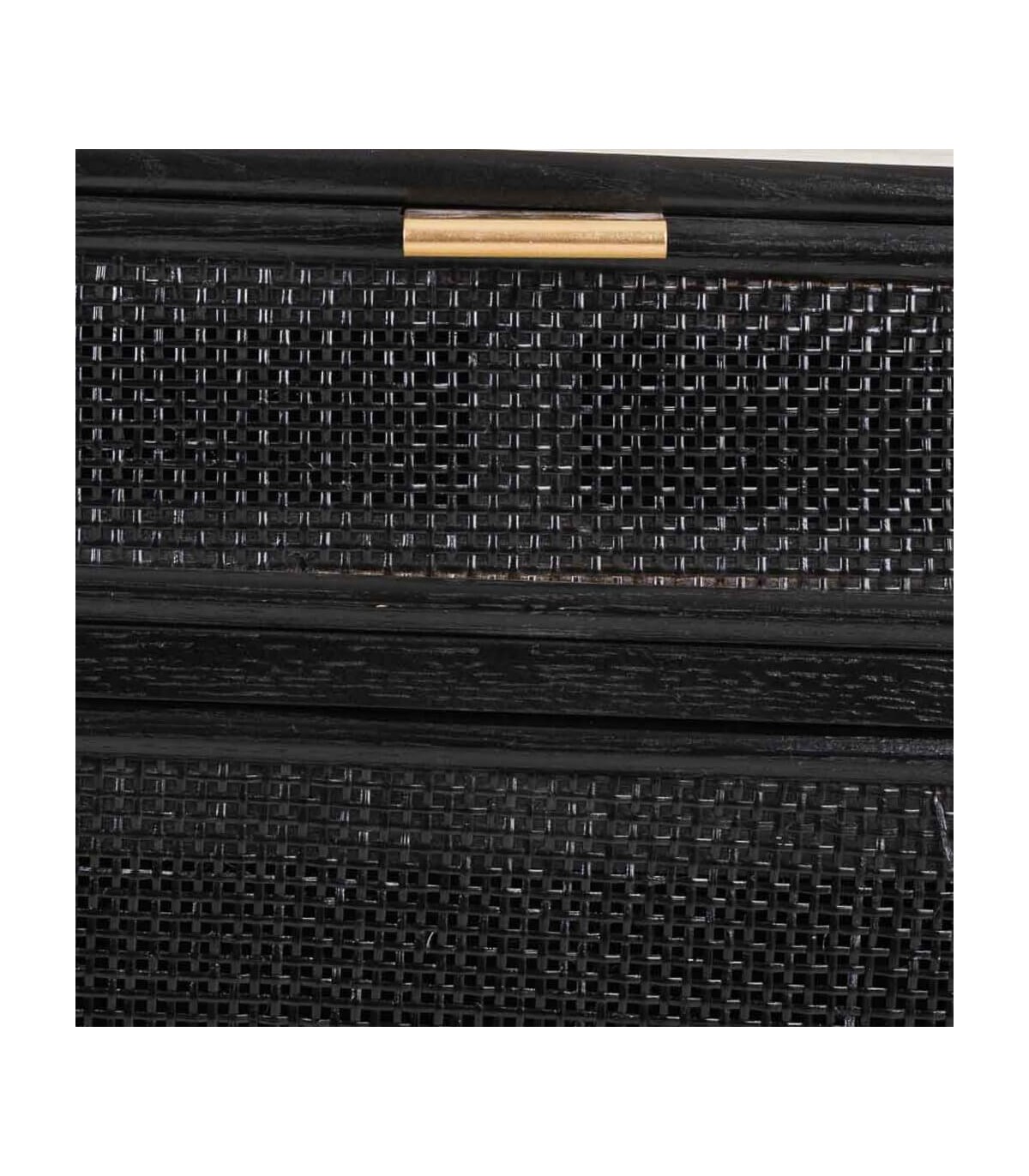 🎨 Acabado: Madera y ratán negro, patas y tiradores dorados.