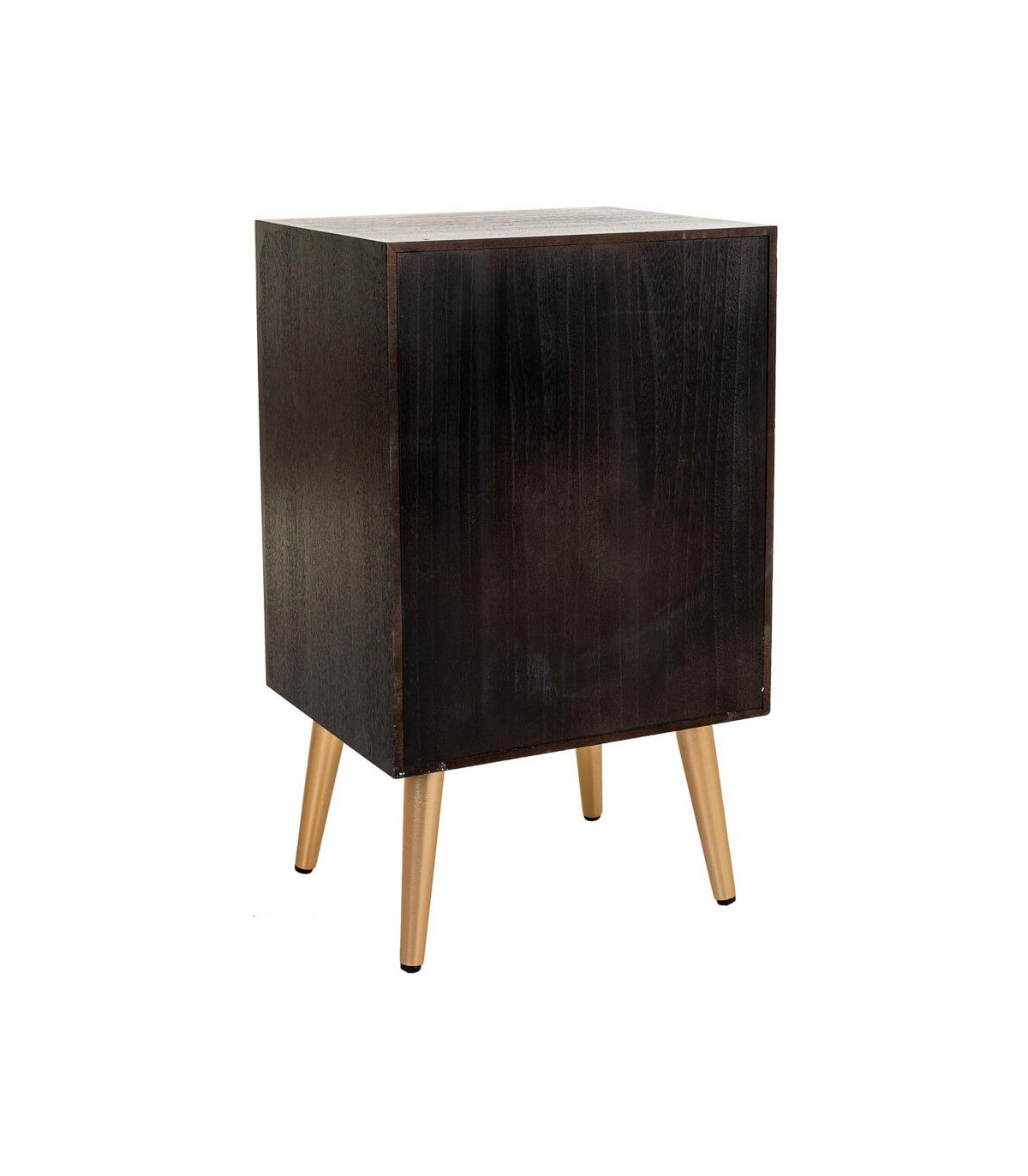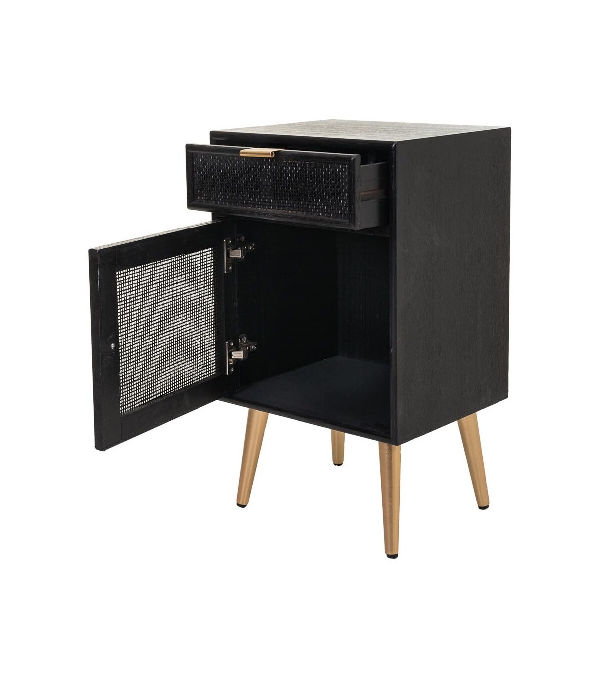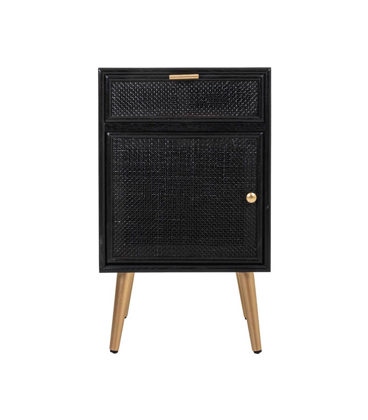 🎨 Acabado: Madera y ratán negro, patas y tiradores dorados.