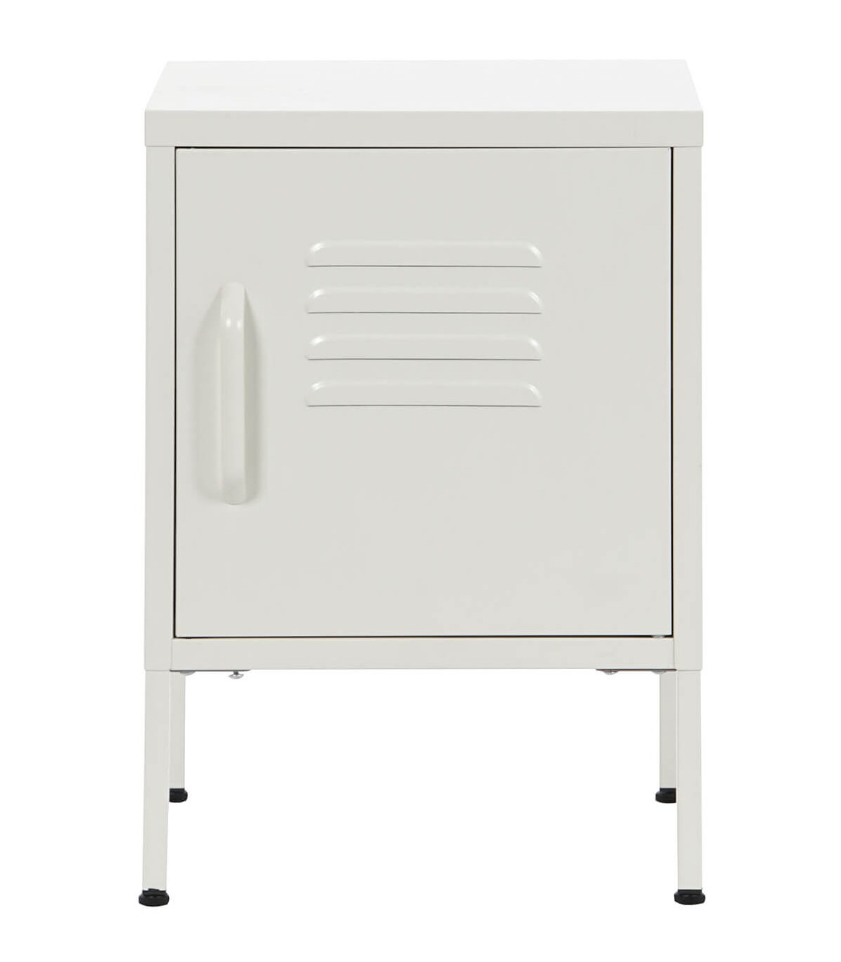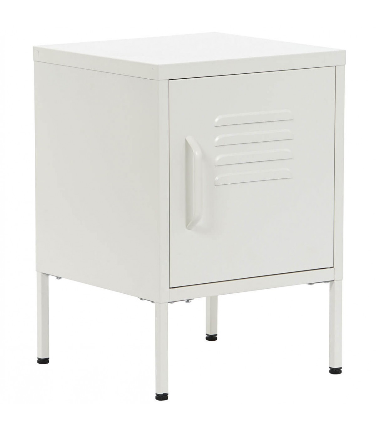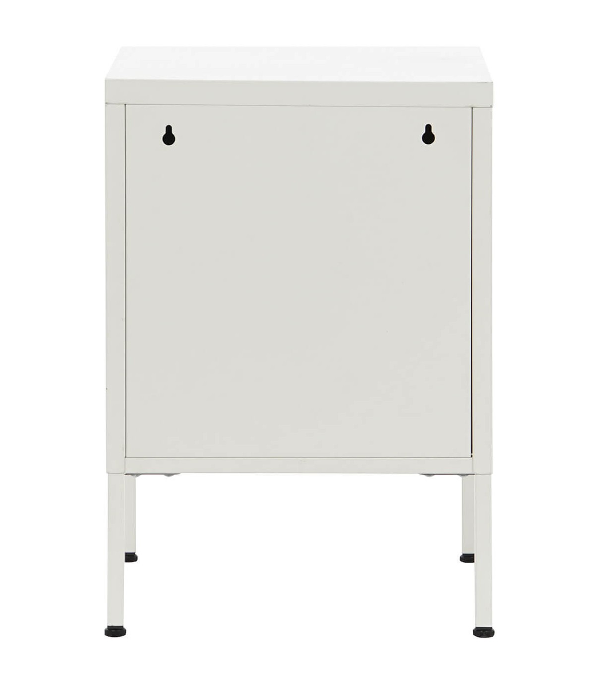 Mesita de noche de estilo vintage realizado en metal lacado en blanco, con una puerta y una balda interior, una mesita de noche práctica y decorativa ideal para decorar tu dormitorio o usarla como mesita auxiliar.