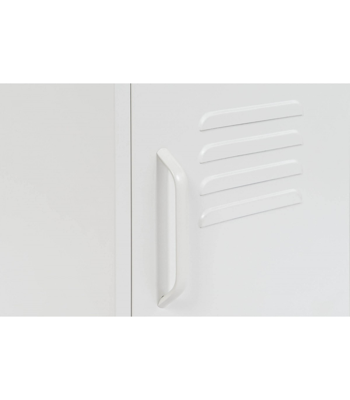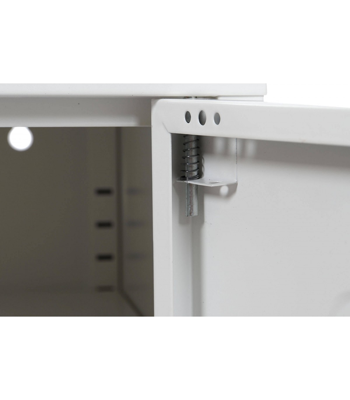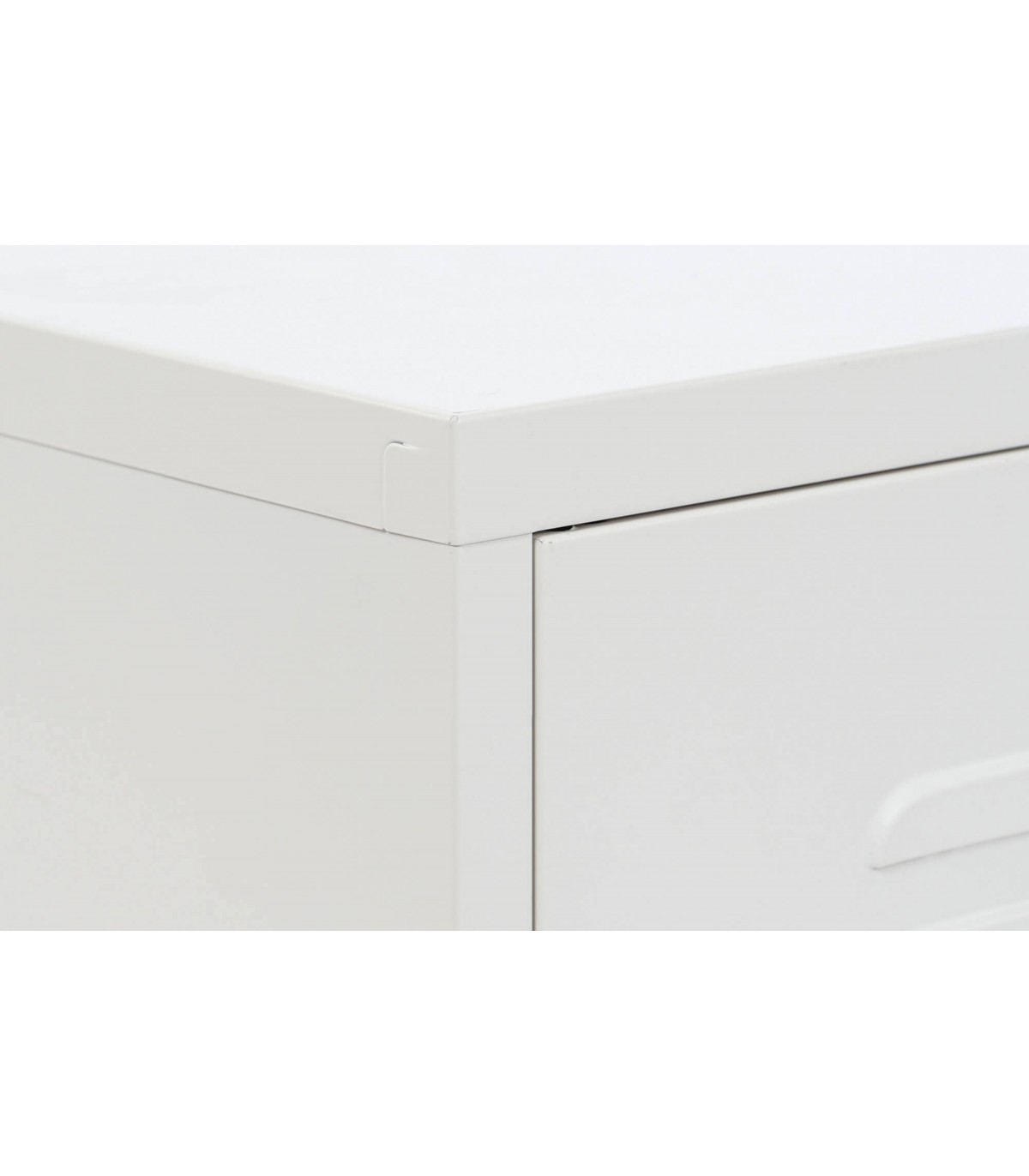 Mesita de noche de estilo vintage realizado en metal lacado en blanco, con una puerta y una balda interior, una mesita de noche práctica y decorativa ideal para decorar tu dormitorio o usarla como mesita auxiliar.