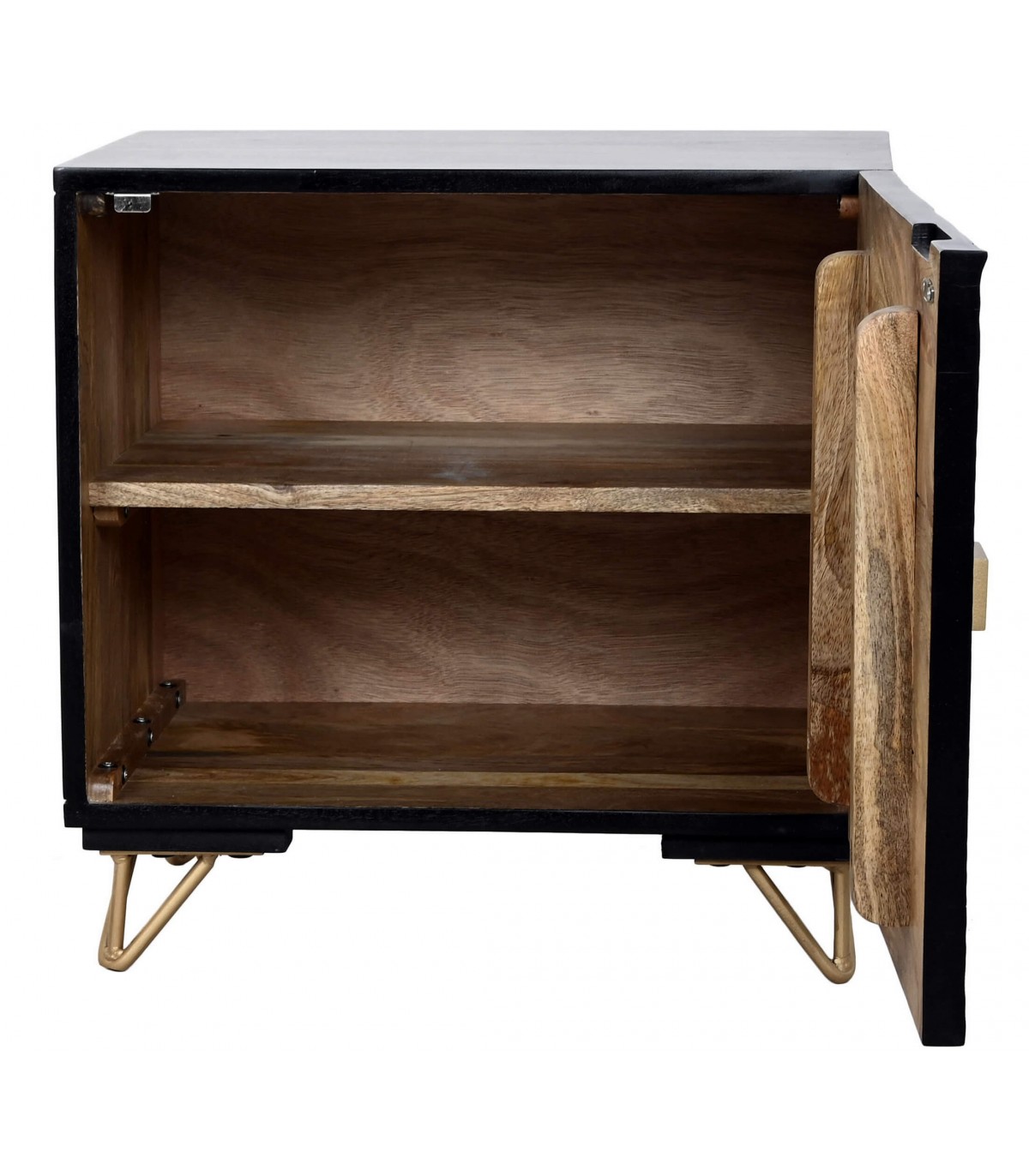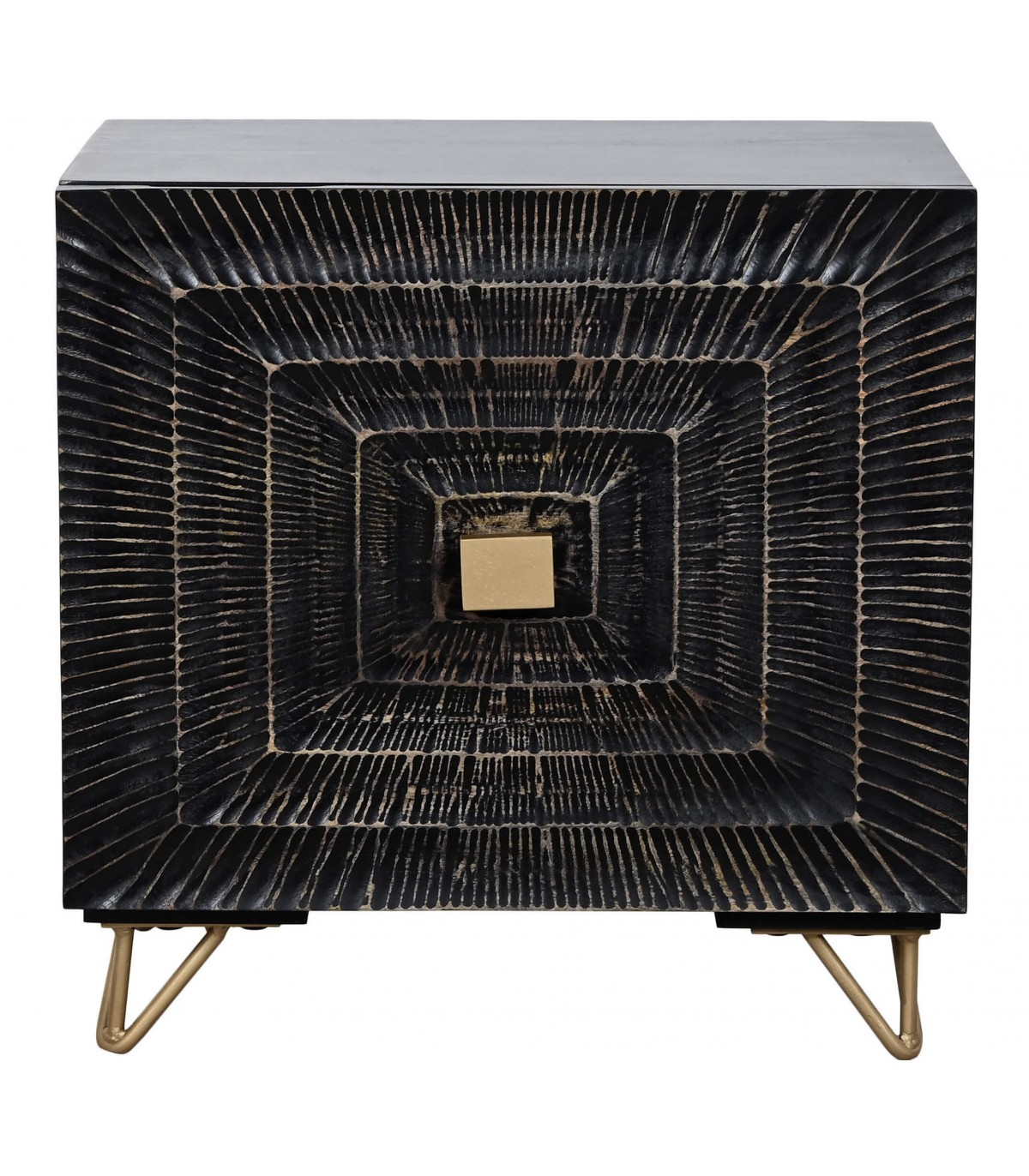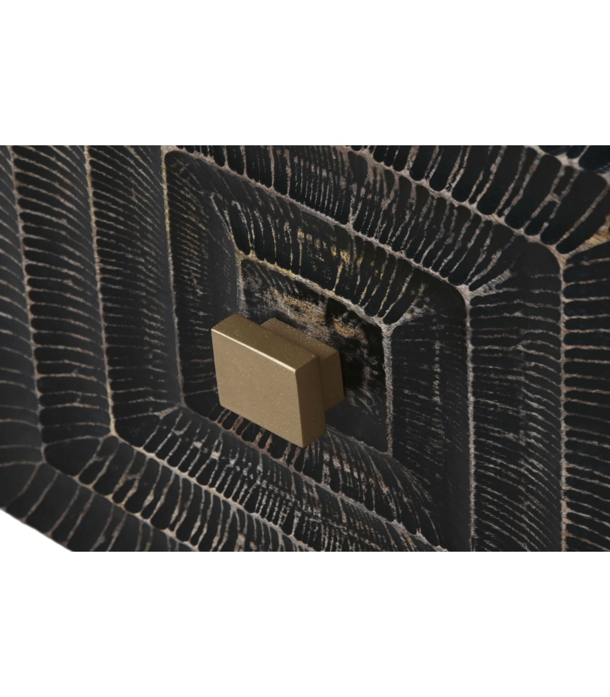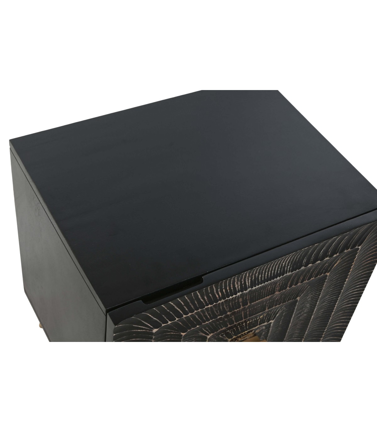 Una pieza con carácter y presencia que redefine el dormitorio. Esta mesita de noche de madera maciza de mango destaca por su puerta tallada en relieve con un patrón geométrico que aporta profundidad y sofisticación. El acabado negro rozado deja entrever matices cálidos que acentúan el trabajo artesanal, mientras que las patas metálicas en forma de horquilla y el tirador dorado cuadrado evocan el glamour del estilo art decó.