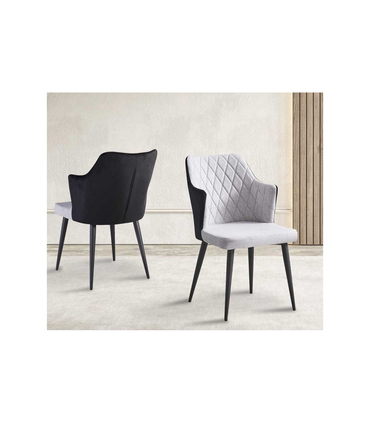 Acabado, tela chenilla gris y terciopelo negro, patas negro.