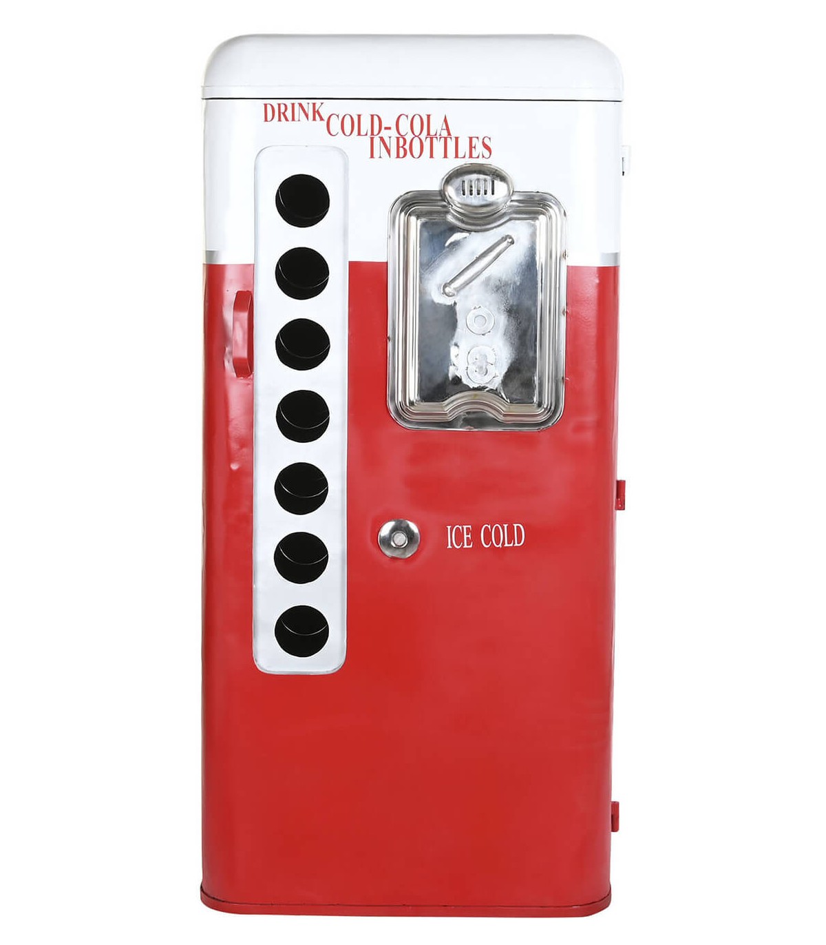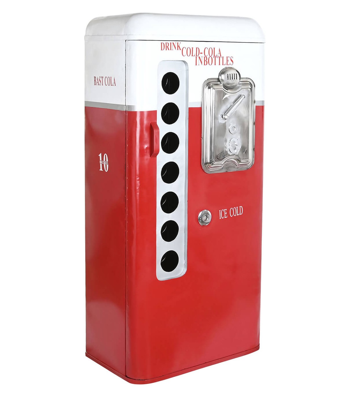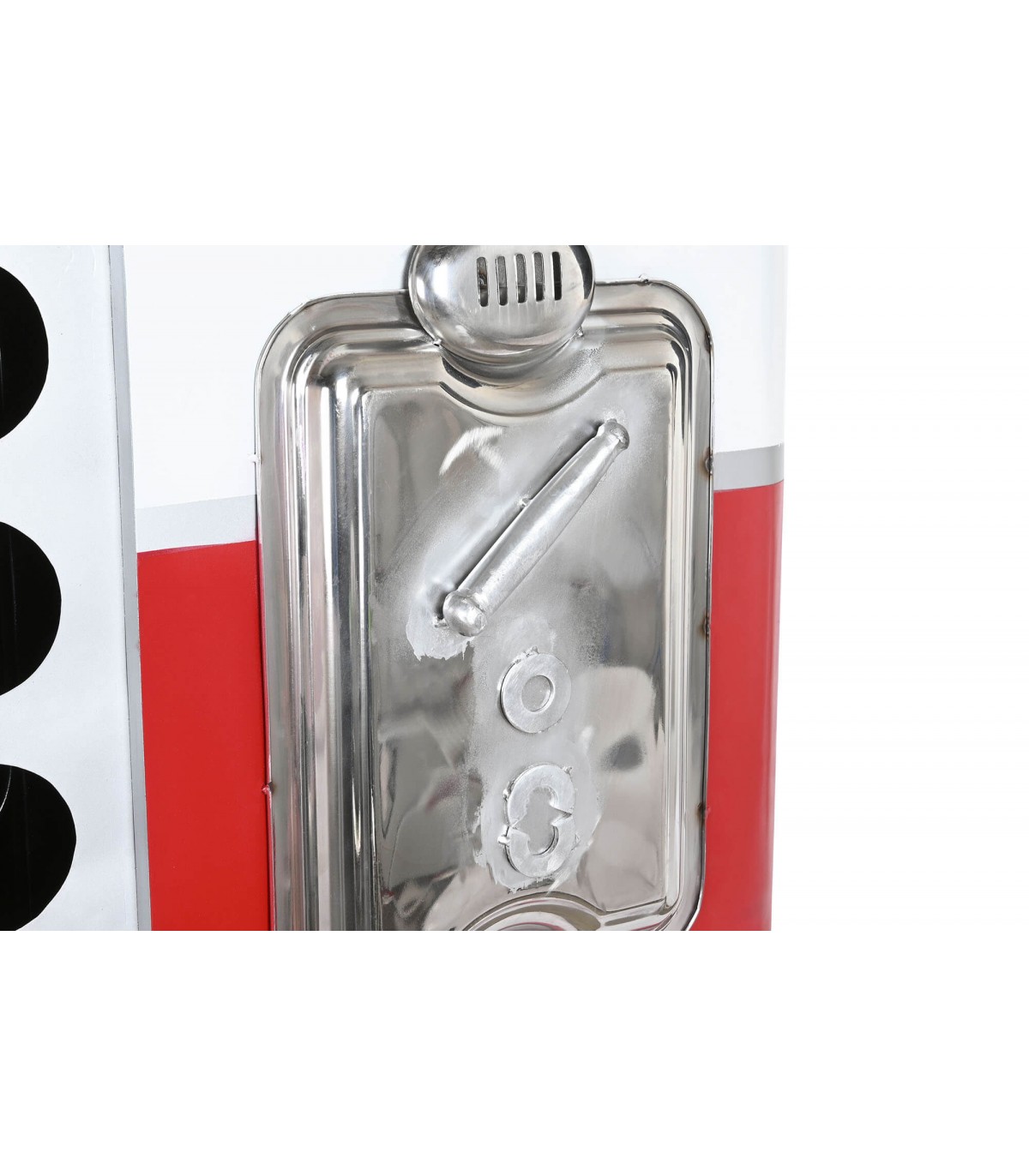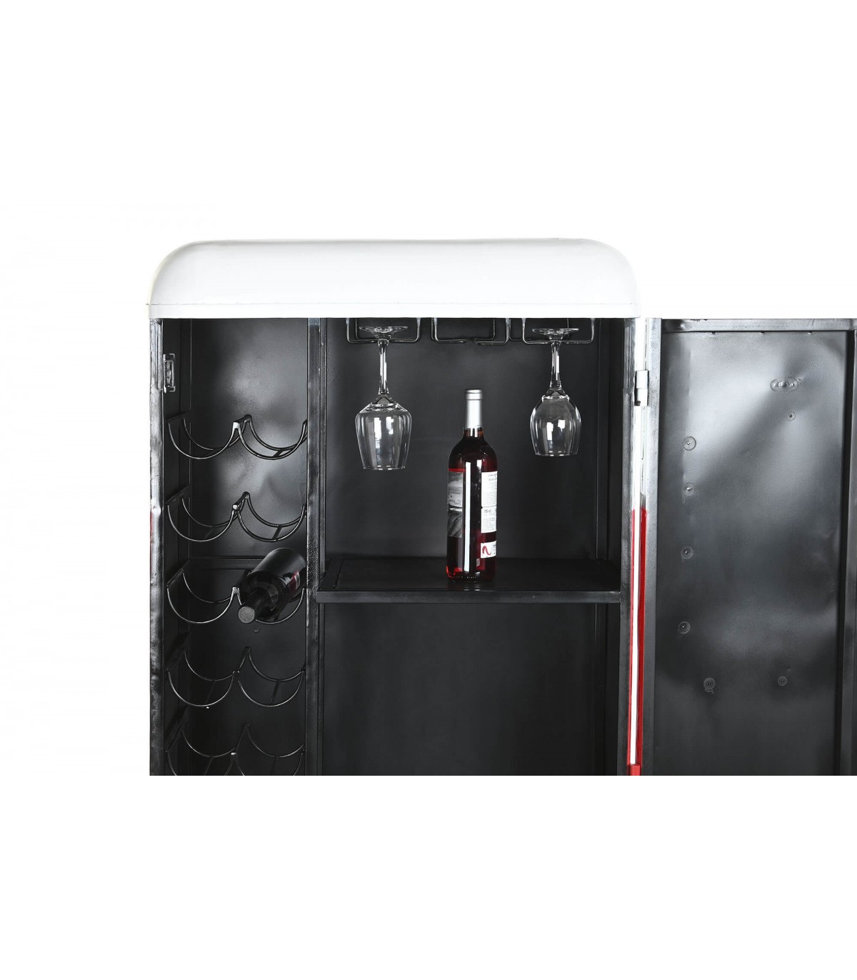 Mueble bar botellero, metal rojo, blanco y cromado de gran capacidad, con su puerta donde guardar 14 botellas tumbadas, y soporte superior para las copas, todo lo que necesitas en muy poco espacio y con un aire vintage que le dará un toque muy especial a ese espacio.