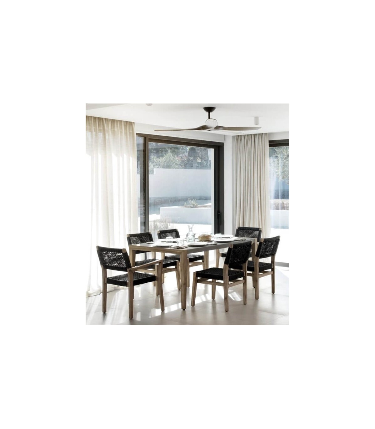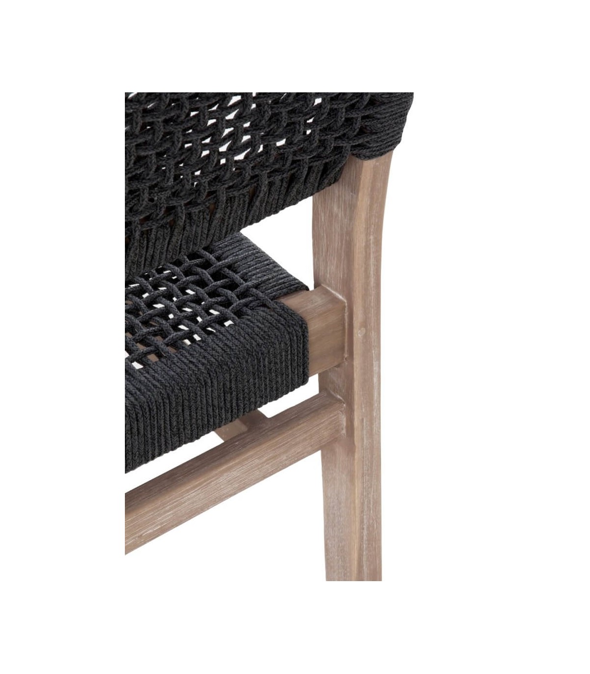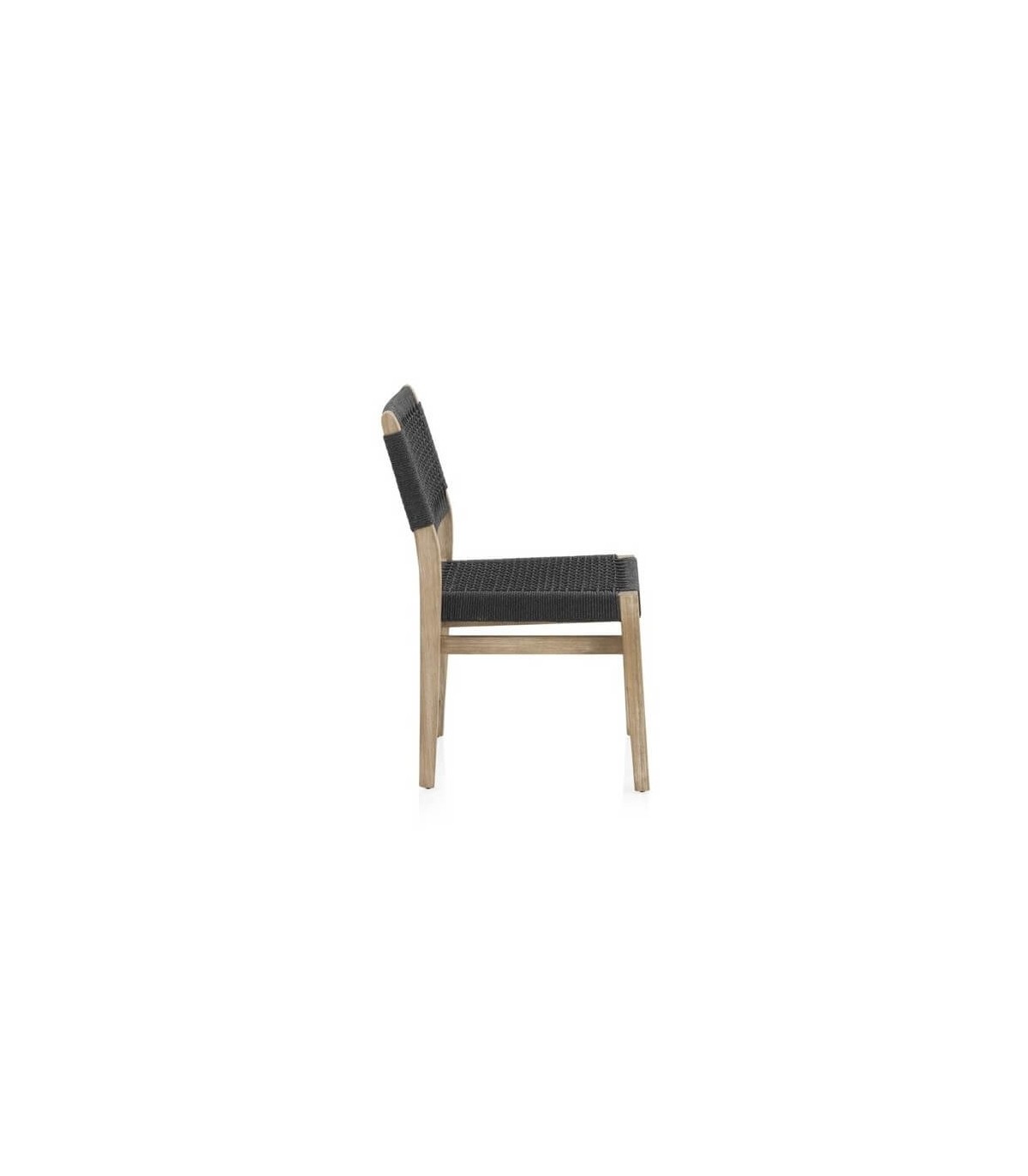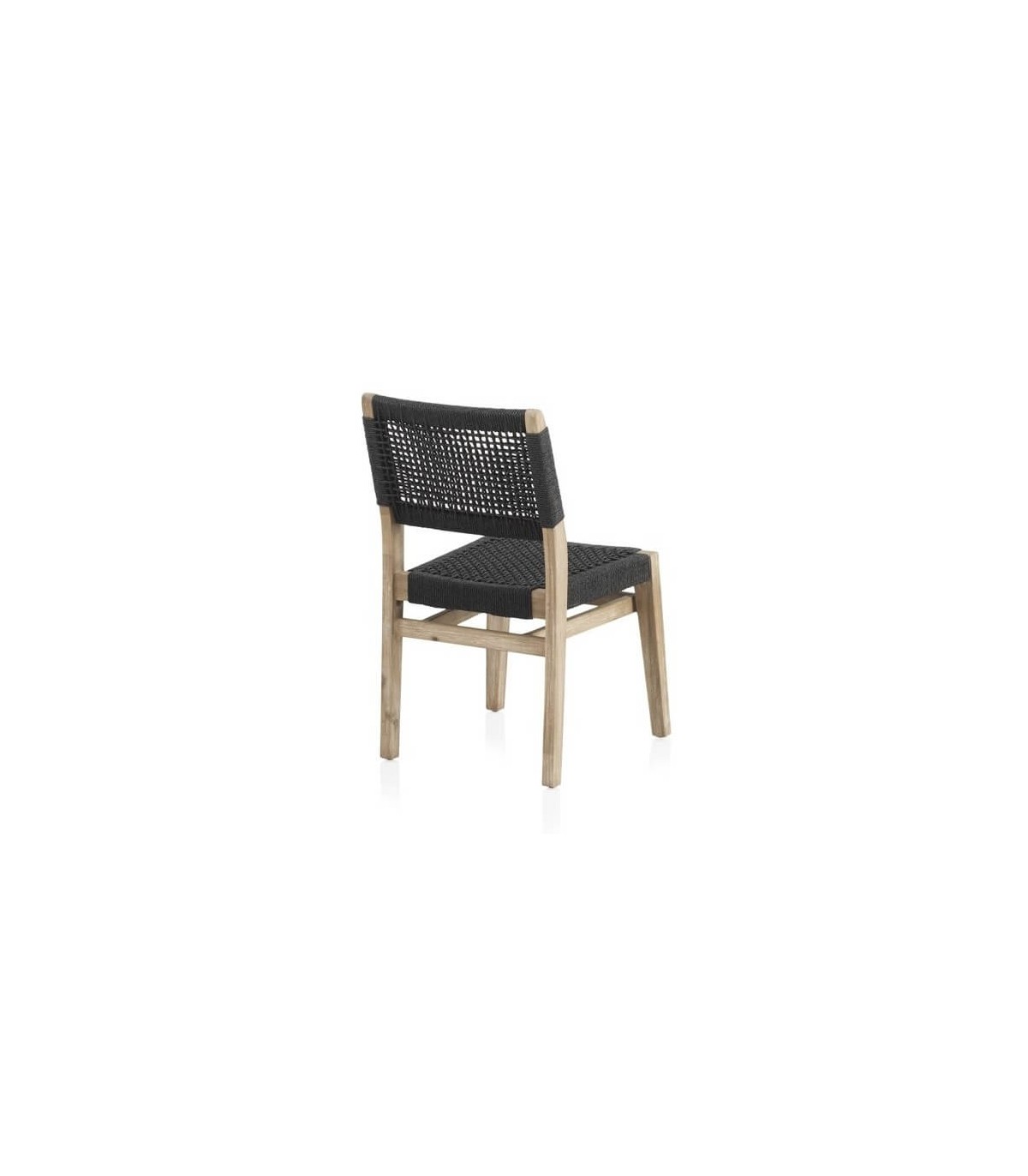 Silla realizada en madera acacia patinada con una estructura en aluminio recubierta de cuerda color negro, una silla resistente y cómoda que encaja bien en ambientes coloniales, incluso en exterior. Perfecta para hogar o para hostelería.