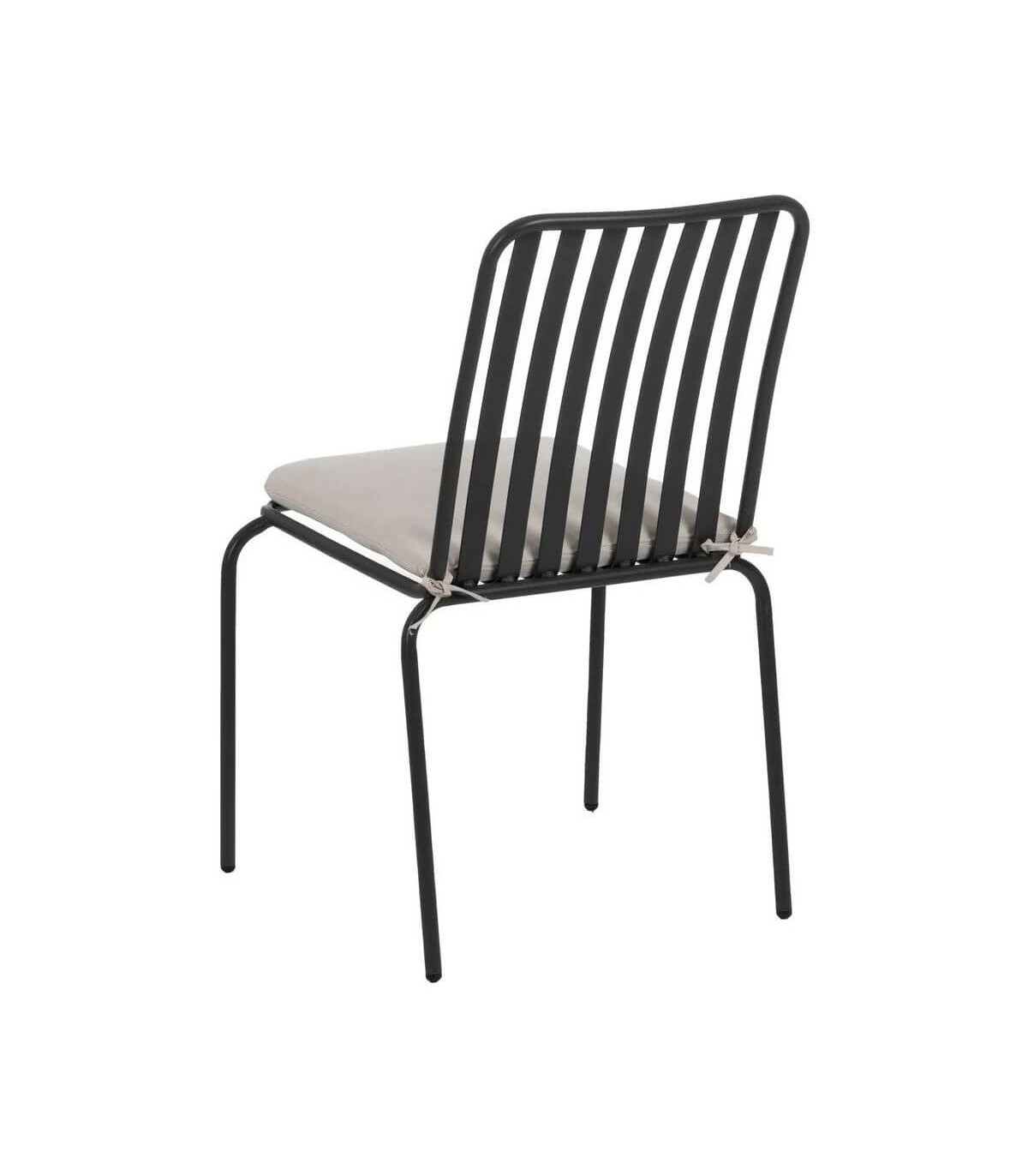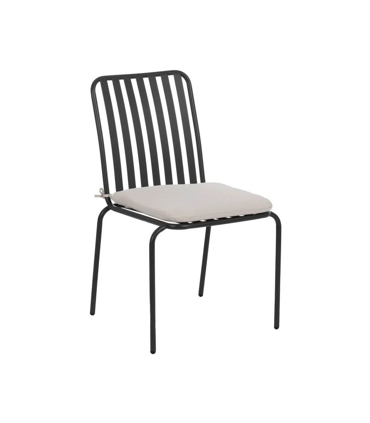 Silla apilable para exterior con la estructura en acero color gris antracita y cojín de asiento desenfundable color blanco, una silla resistente y cómoda que encaja bien en todo tipo de ambientes. Perfecta para hogar o para hostelería.