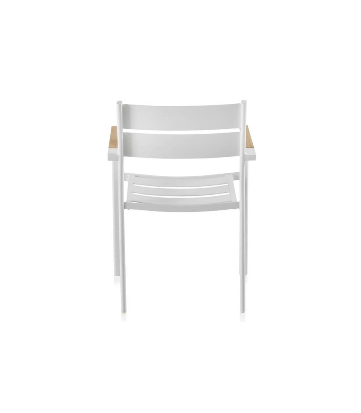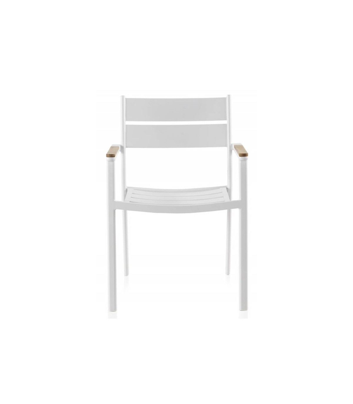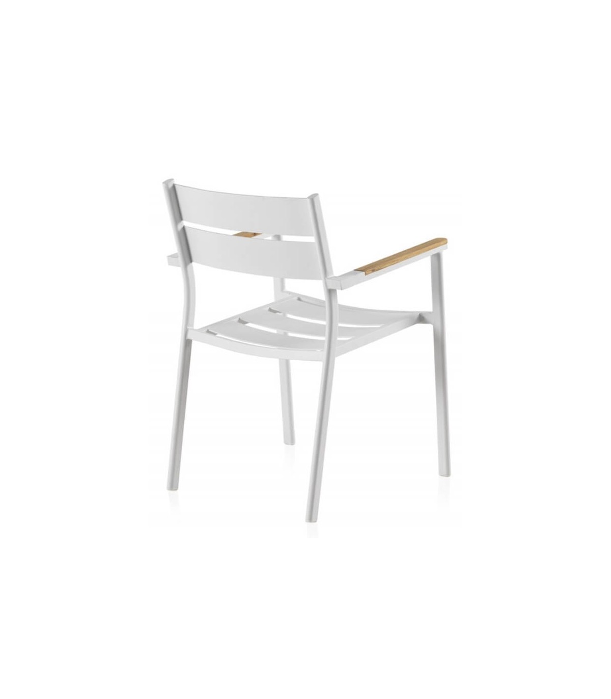 Sillón realizado en aluminio color blanco, madera natural, un sillón apilable, resistente y cómodo que encaja bien en ambientes modernos, incluso en interior. Perfecta para hogar o para hostelería.