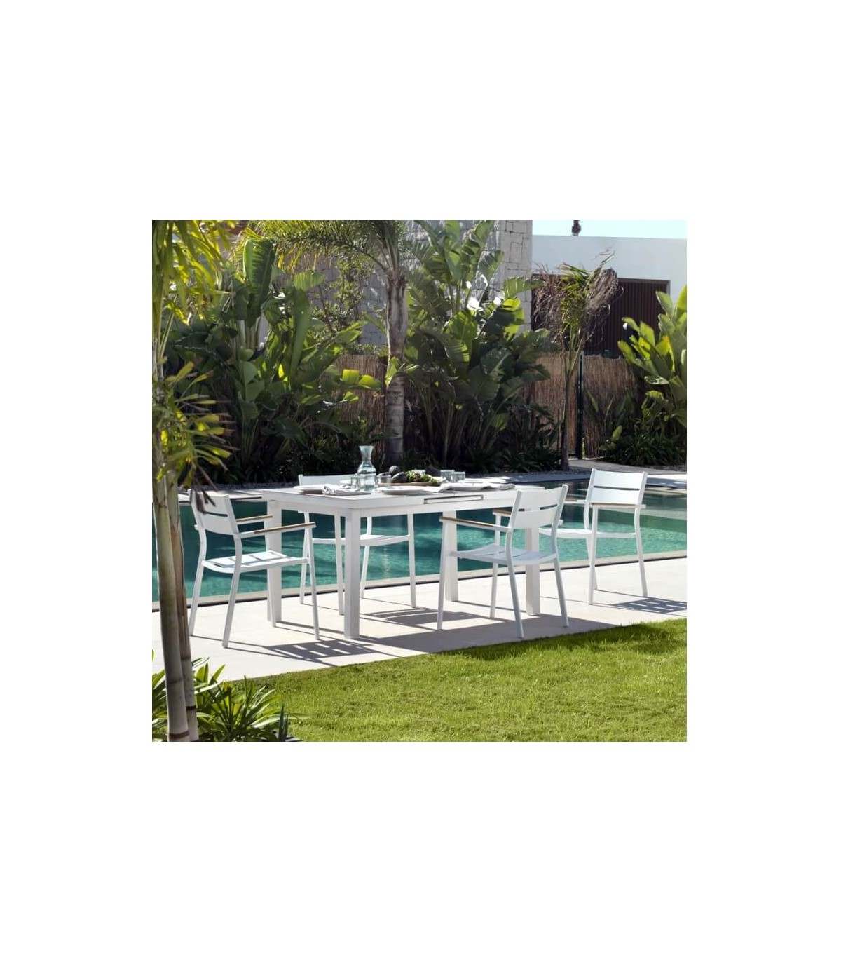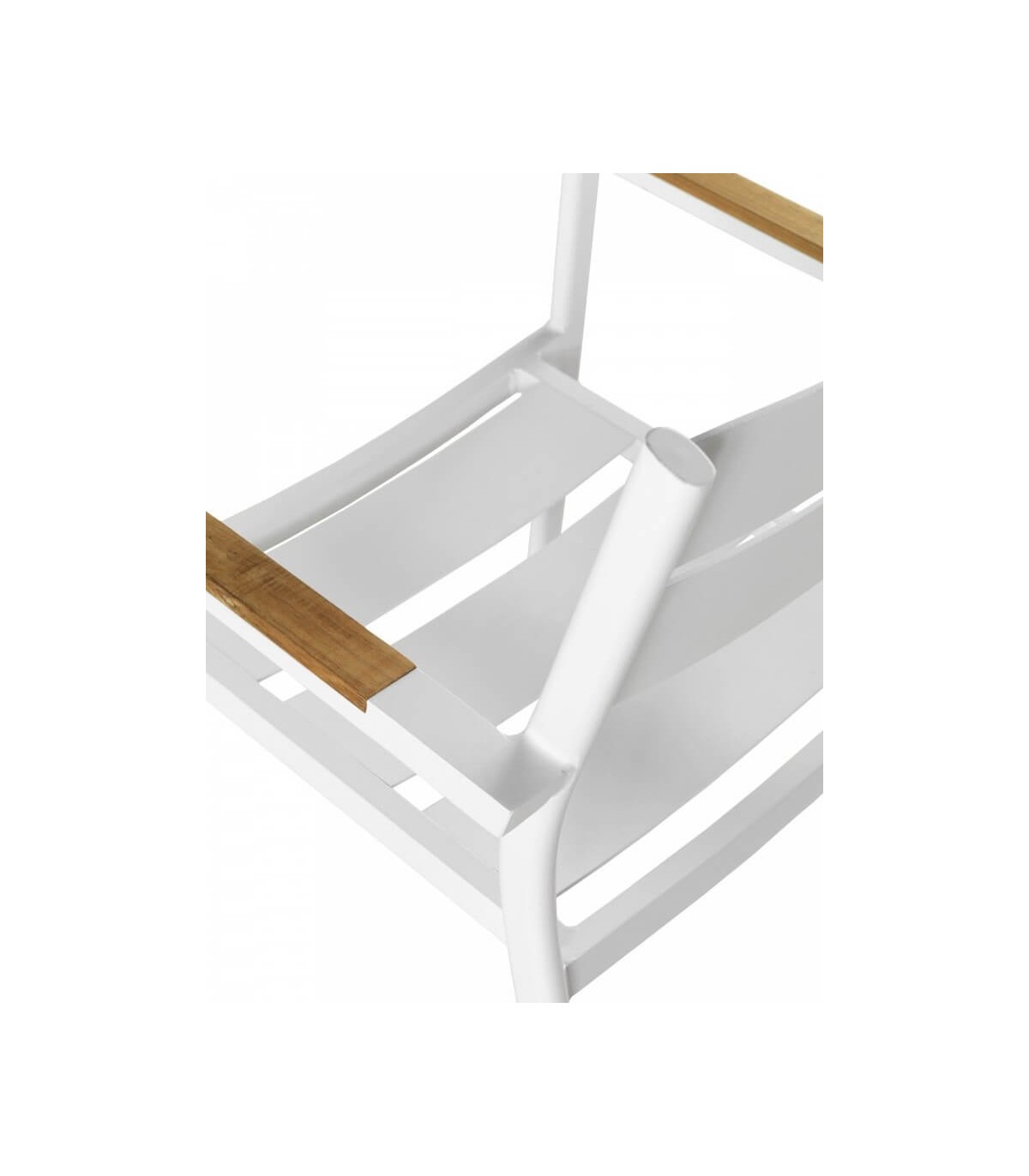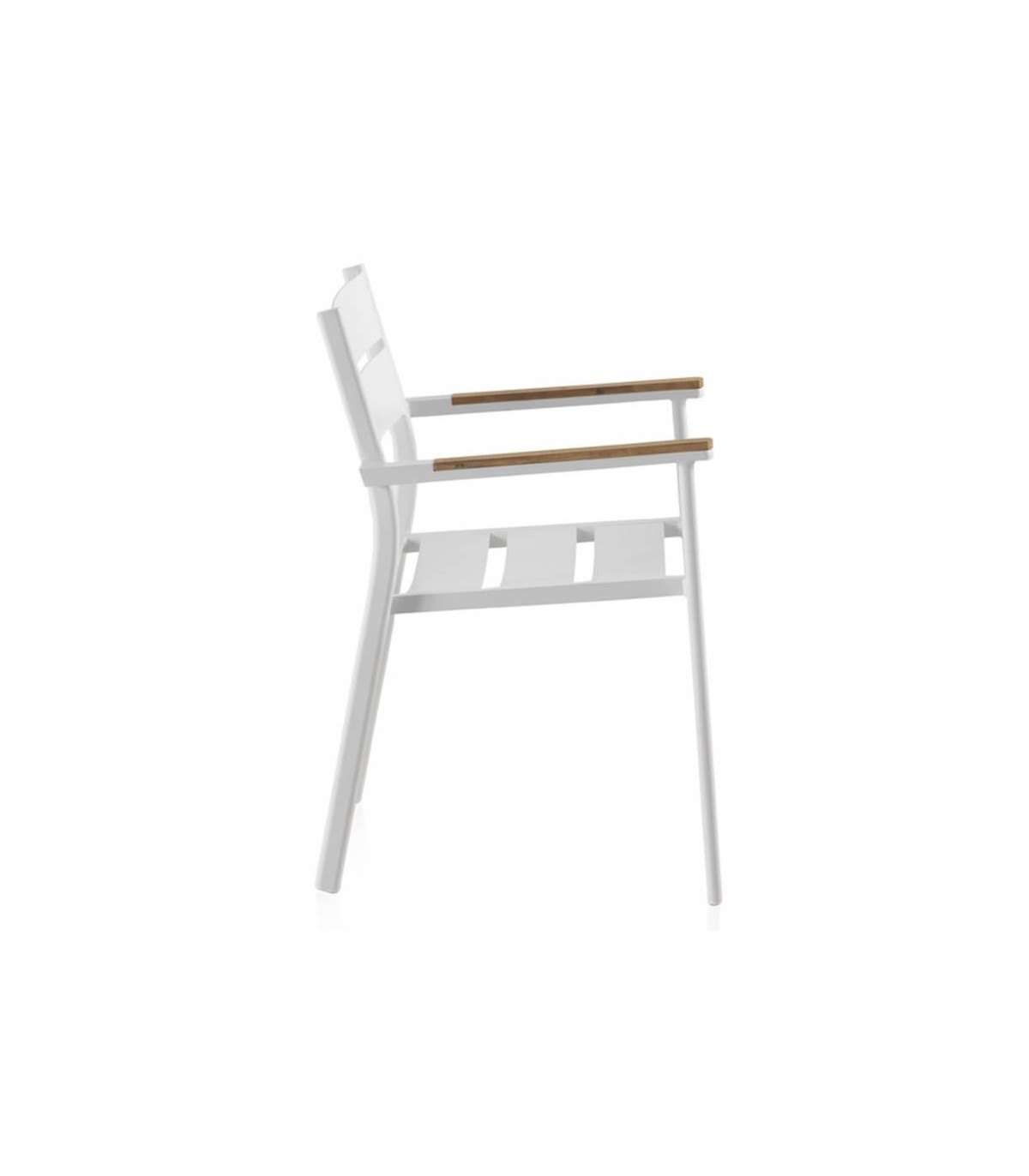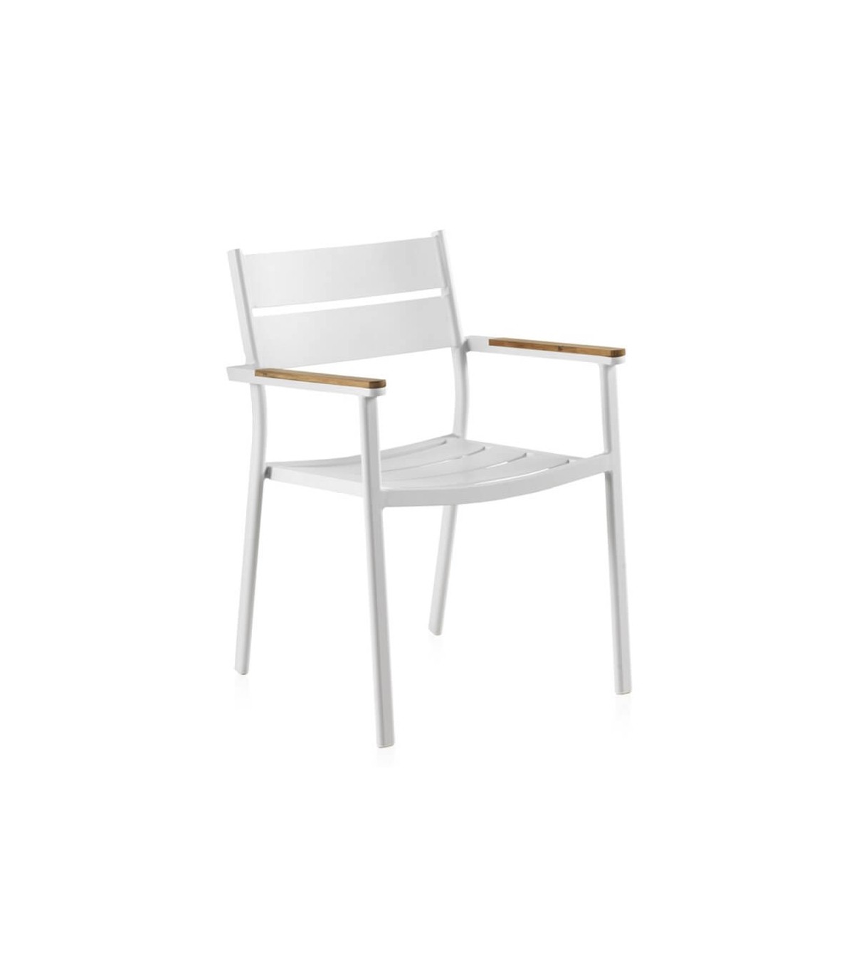 Sillón realizado en aluminio color blanco, madera natural, un sillón apilable, resistente y cómodo que encaja bien en ambientes modernos, incluso en interior. Perfecta para hogar o para hostelería.