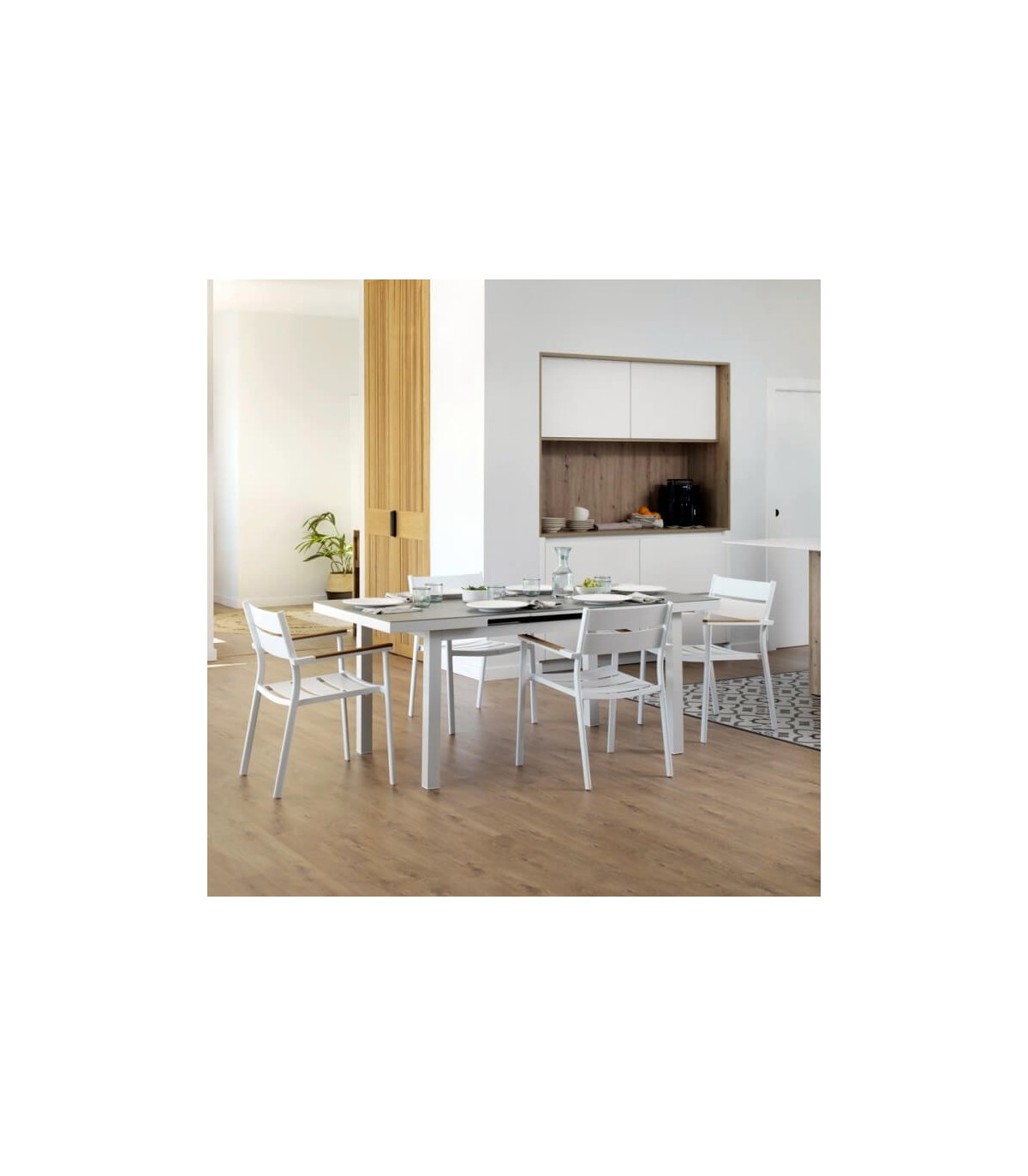 • Acabado, aluminio color blanco, madera natural.