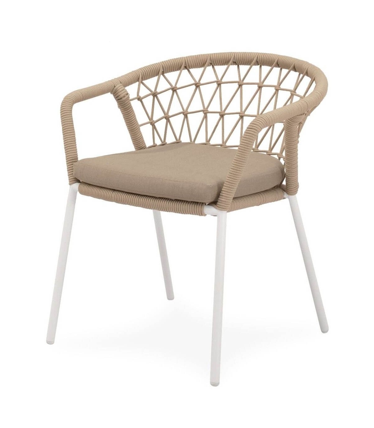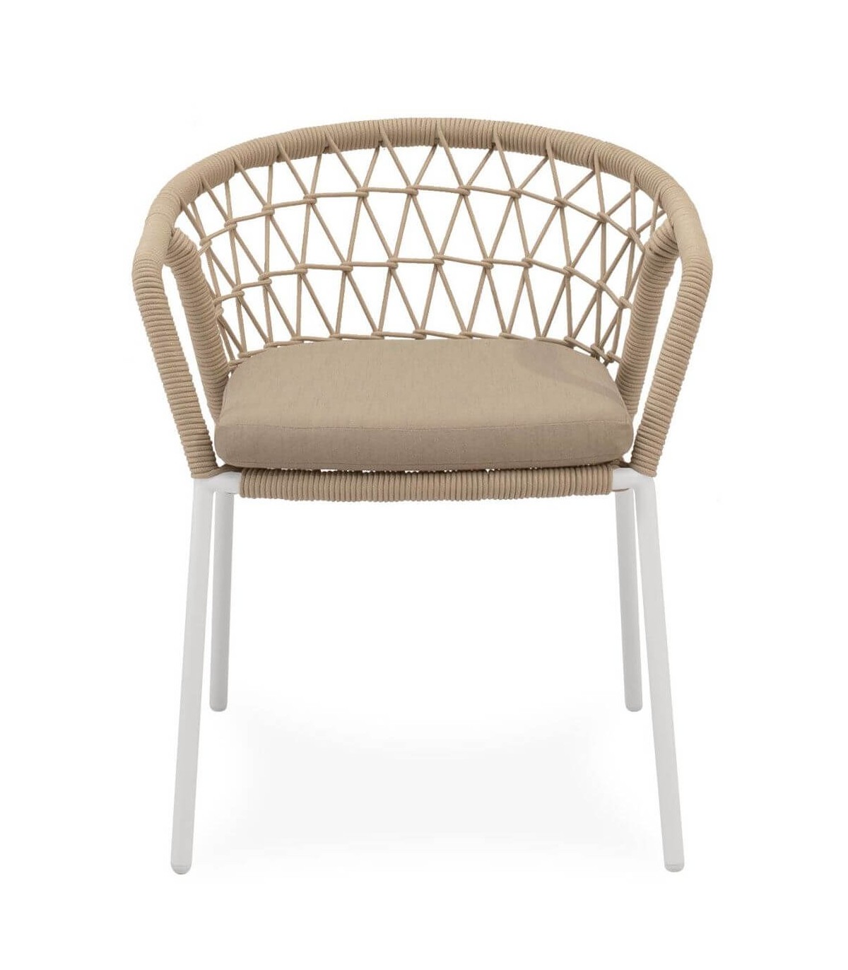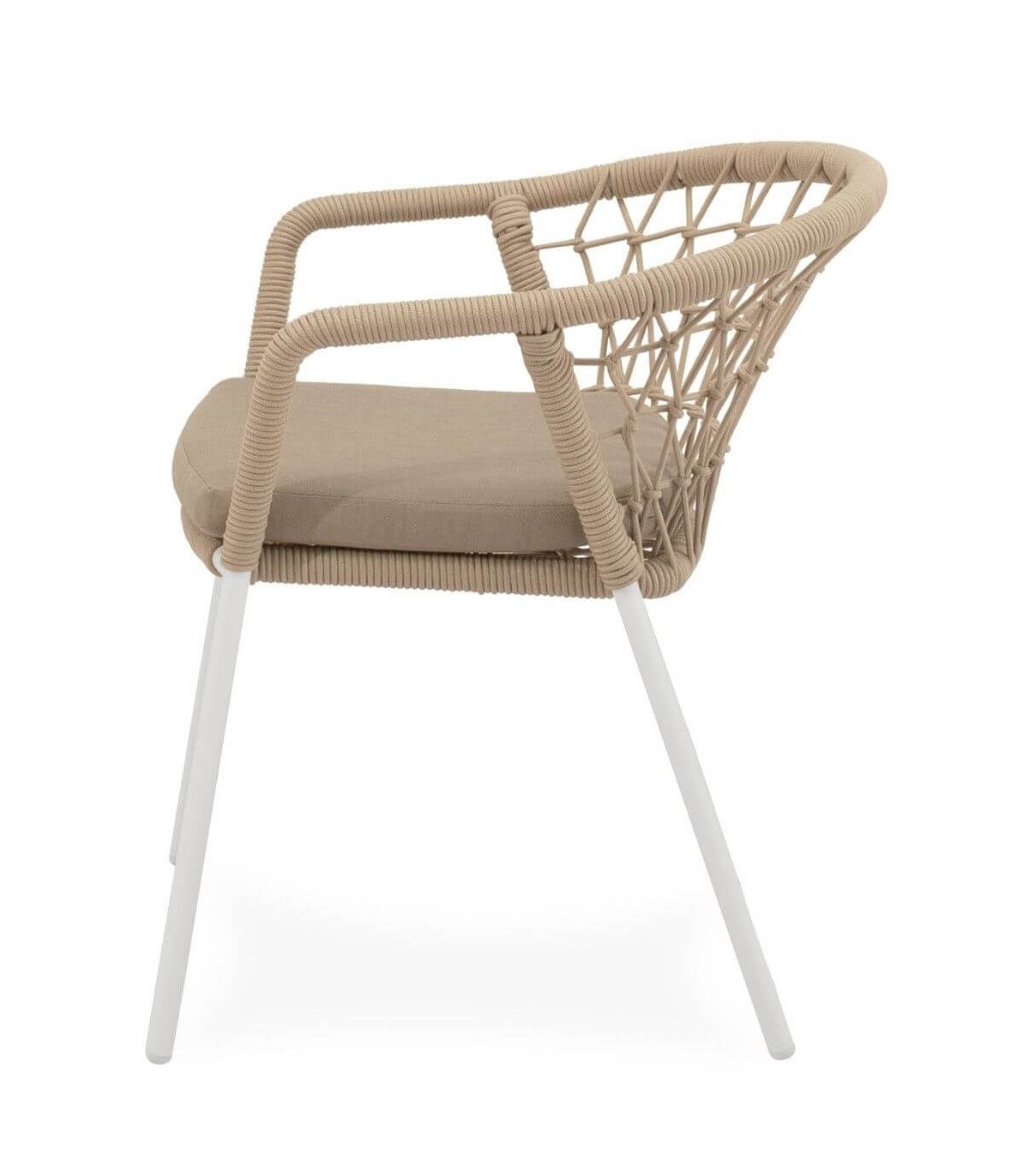 Diseño envolvente con respaldo bajo y entramado decorativo de cuerda beige, que aporta textura, ligereza visual y un aire mediterráneo actual. La estructura en acero blanco ofrece resistencia al uso exterior, manteniendo un estilo limpio y elegante.