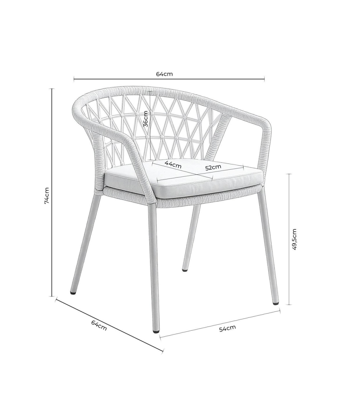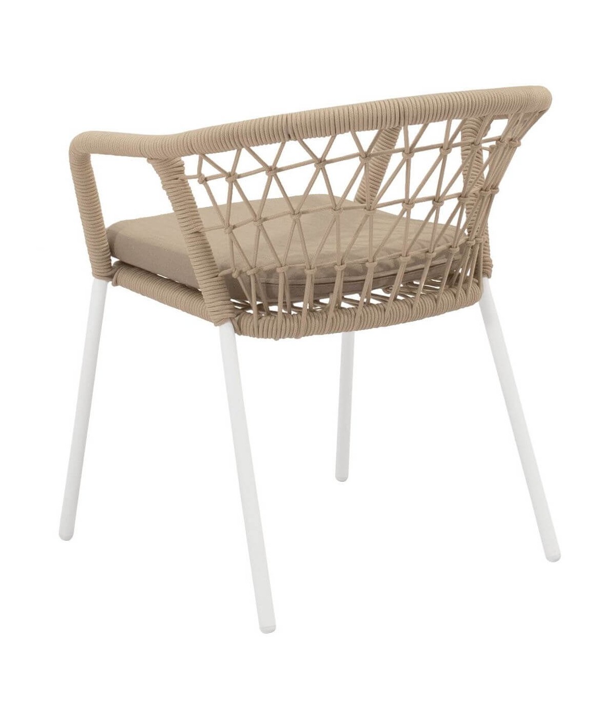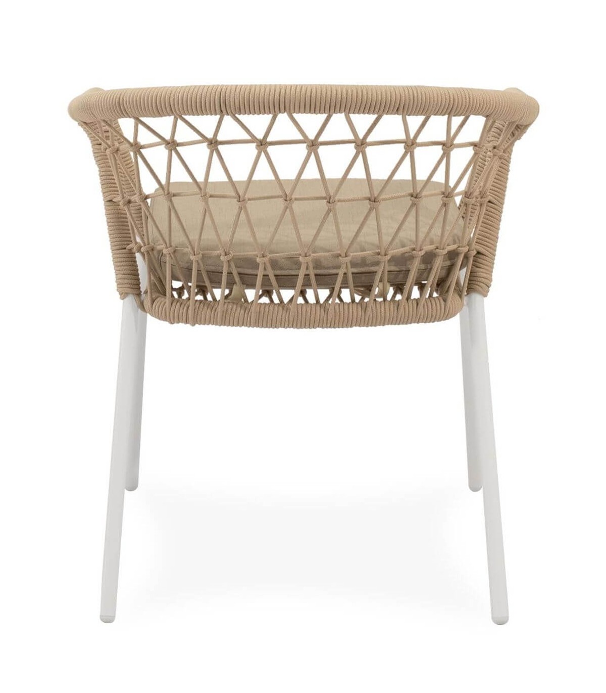 Diseño envolvente con respaldo bajo y entramado decorativo de cuerda beige, que aporta textura, ligereza visual y un aire mediterráneo actual. La estructura en acero blanco ofrece resistencia al uso exterior, manteniendo un estilo limpio y elegante.