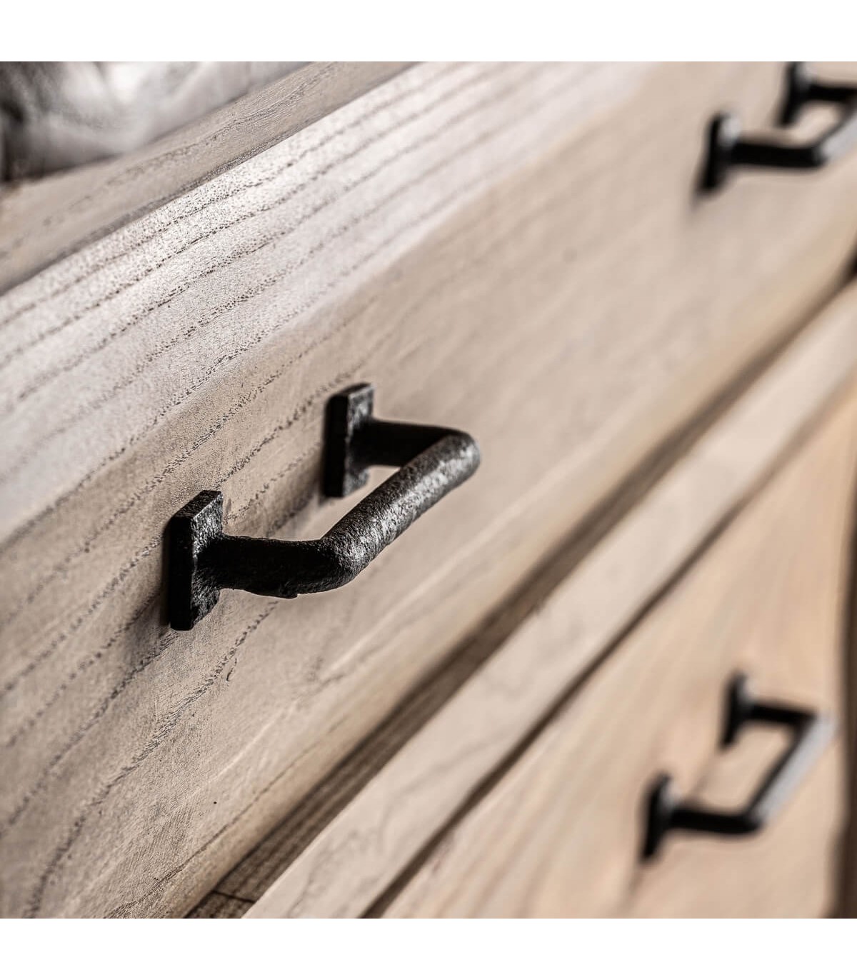Sus tres amplios cajones cuentan con tiradores de hierro forjado a mano en acabado negro vintage, que aportan carácter artesanal. Ideal para dormitorios o salones que apuestan por lo auténtico, lo bien hecho y lo duradero.