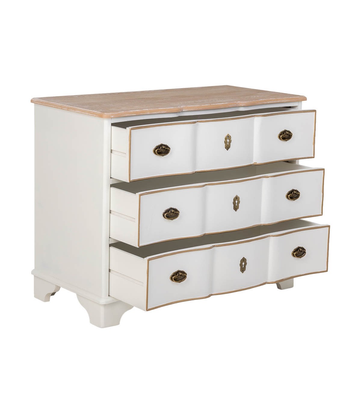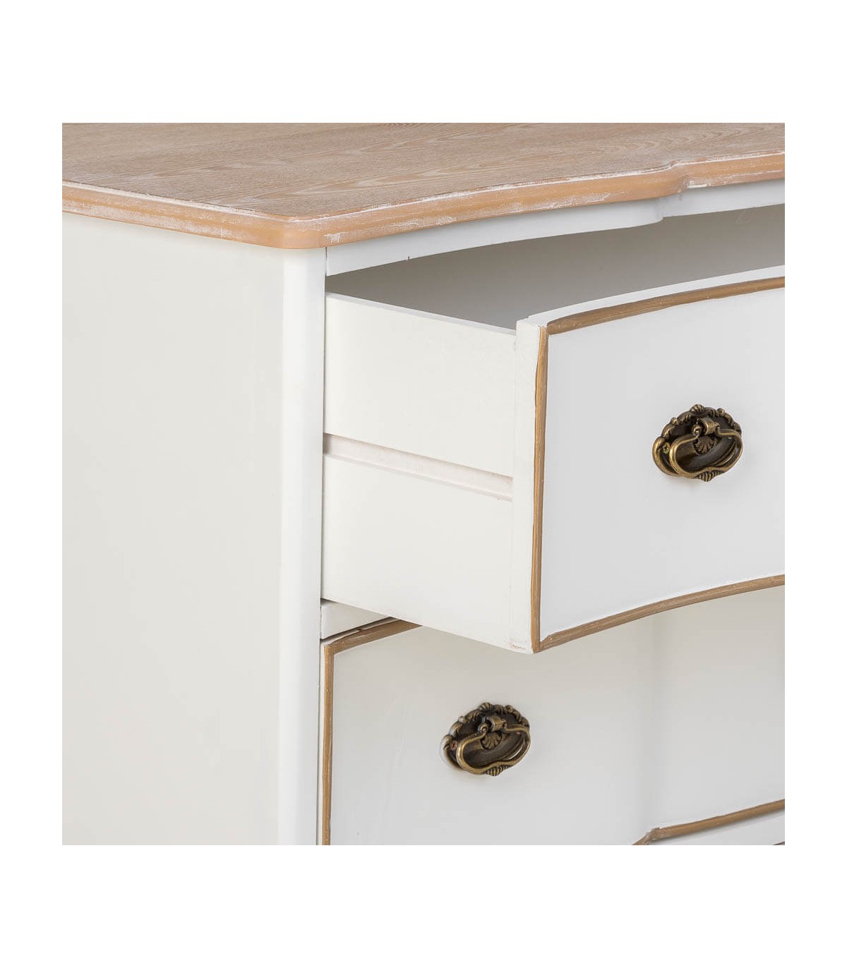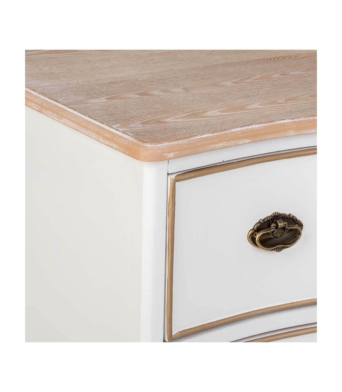 Dale un aire sofisticado a tu hogar con esta preciosa cómoda de tres cajones, donde se combinan armoniosamente la madera natural y el blanco lacado. Su diseño clásico con frente curvado realza el trabajo artesanal, mientras que los perfiles dorados y los tiradores metálicos envejecidos aportan un toque distinguido.