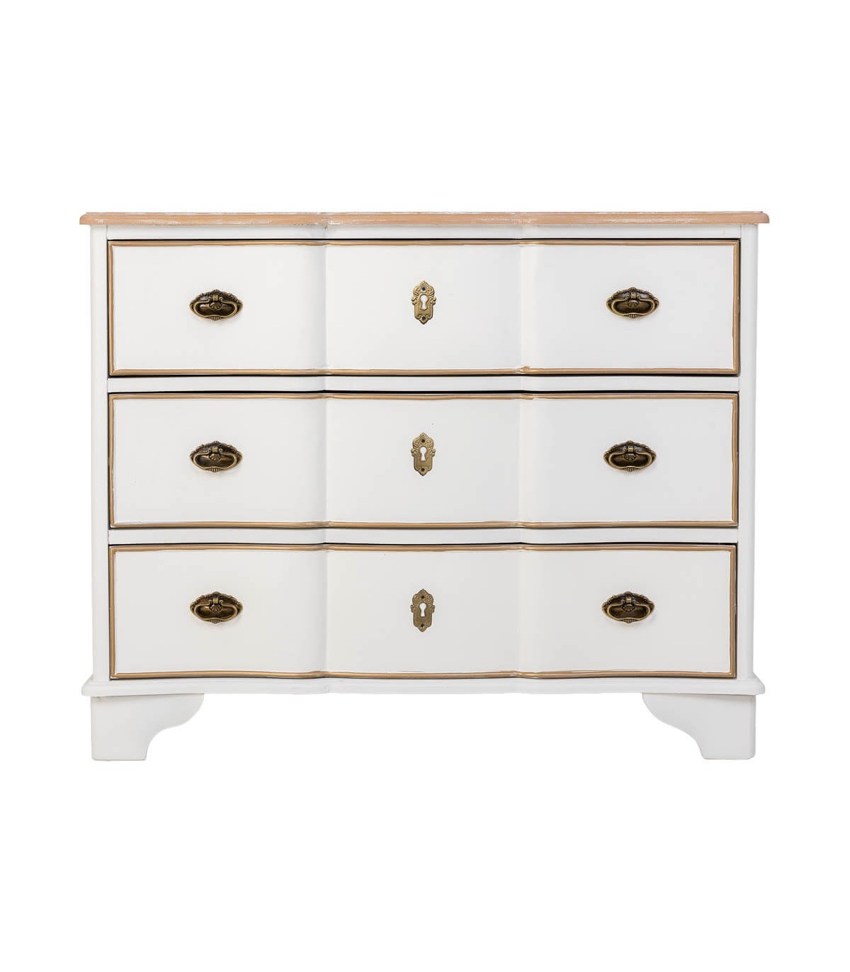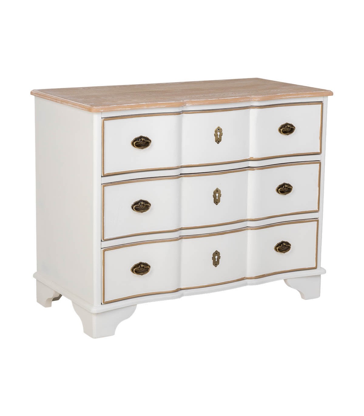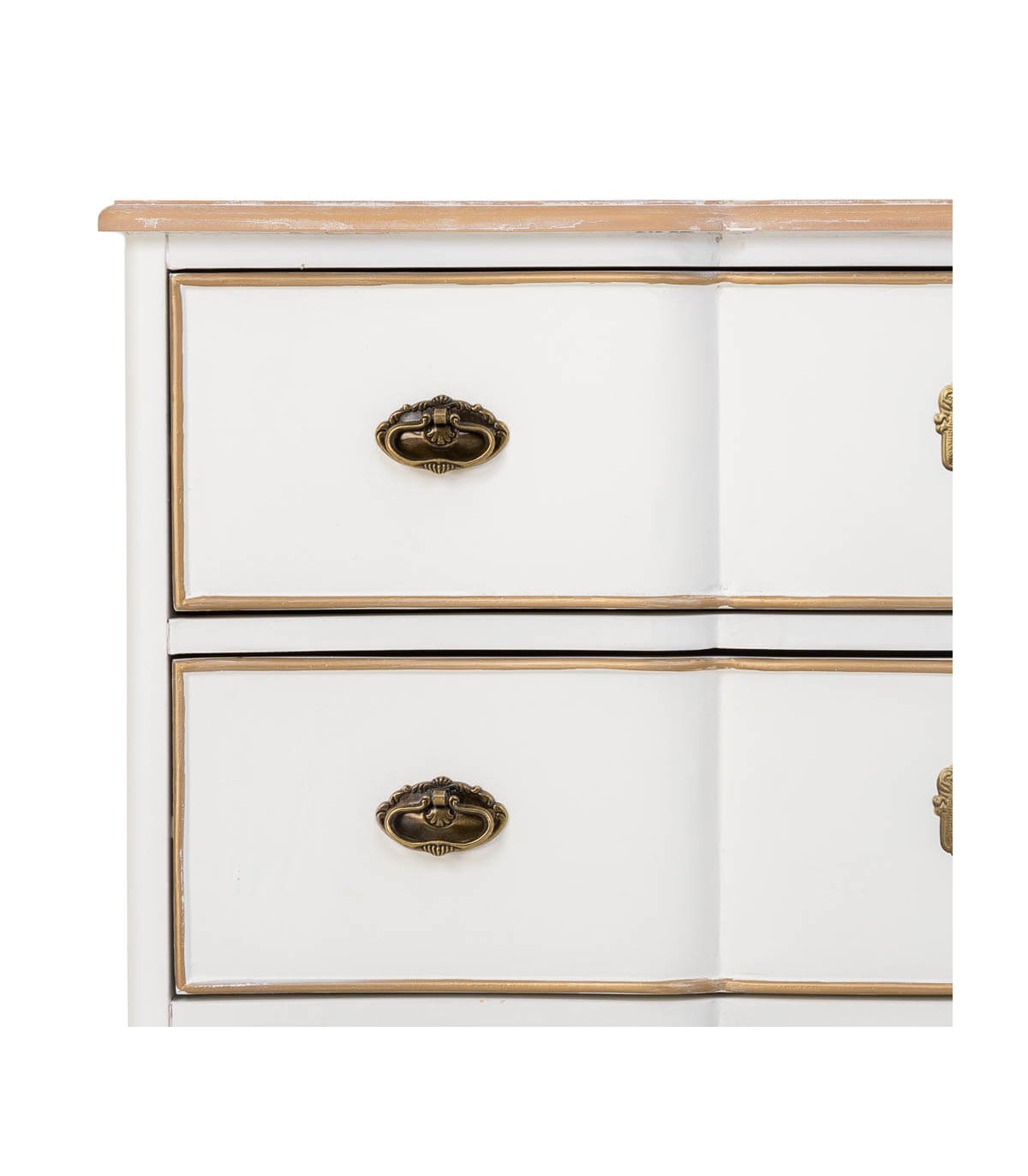 Dale un aire sofisticado a tu hogar con esta preciosa cómoda de tres cajones, donde se combinan armoniosamente la madera natural y el blanco lacado. Su diseño clásico con frente curvado realza el trabajo artesanal, mientras que los perfiles dorados y los tiradores metálicos envejecidos aportan un toque distinguido.
