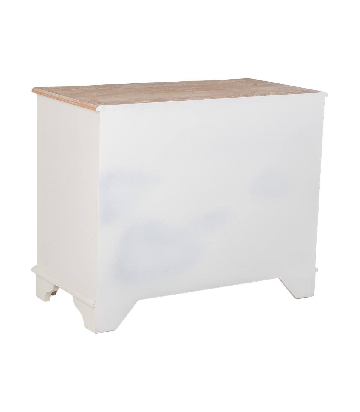 Ideal para dormitorios o entradas con carácter, ofrece una gran capacidad de almacenaje sin renunciar al encanto decorativo. El sobre en madera natural blanqueada aporta calidez visual, mientras que la estructura blanca suaviza y equilibra el conjunto.