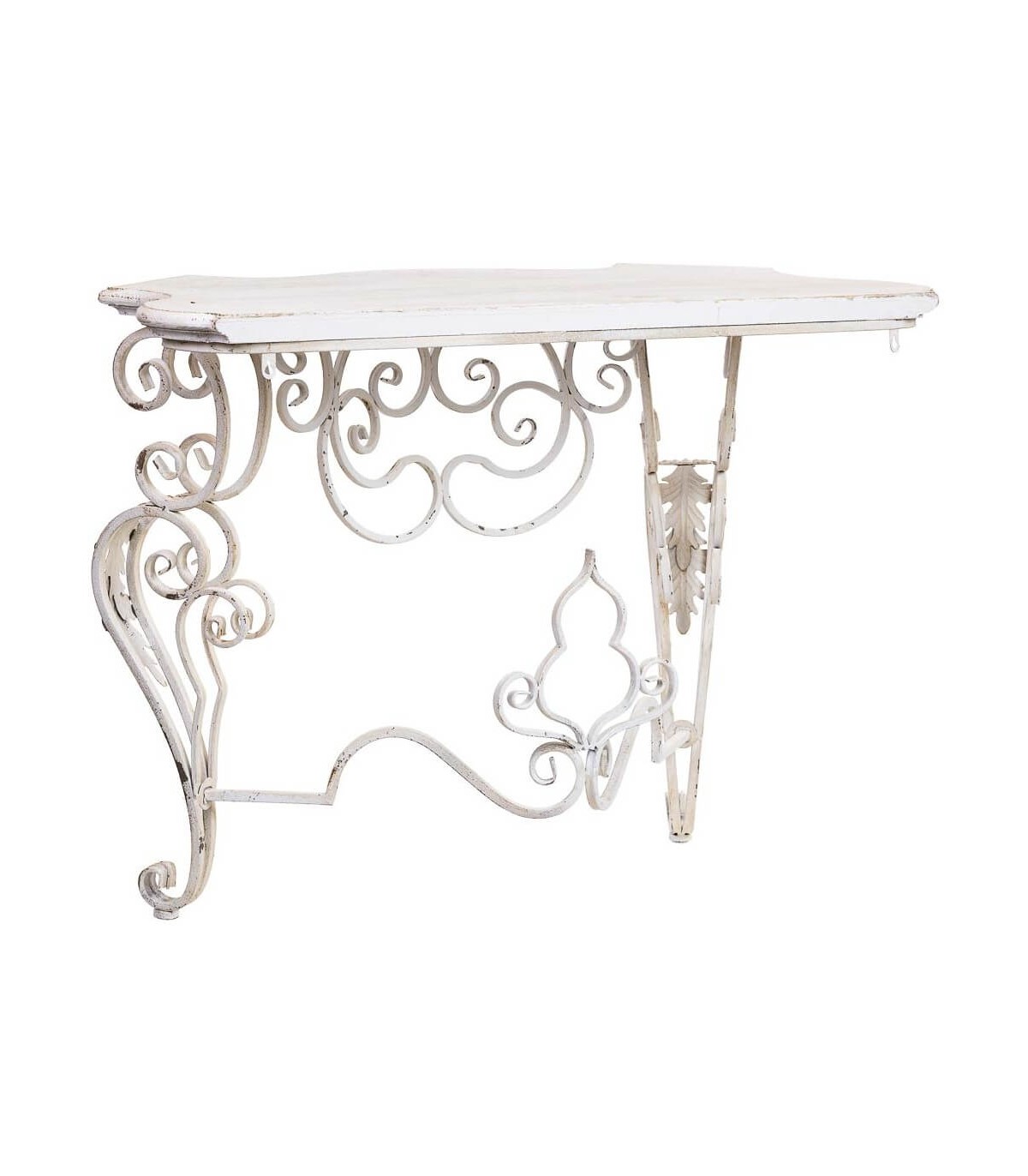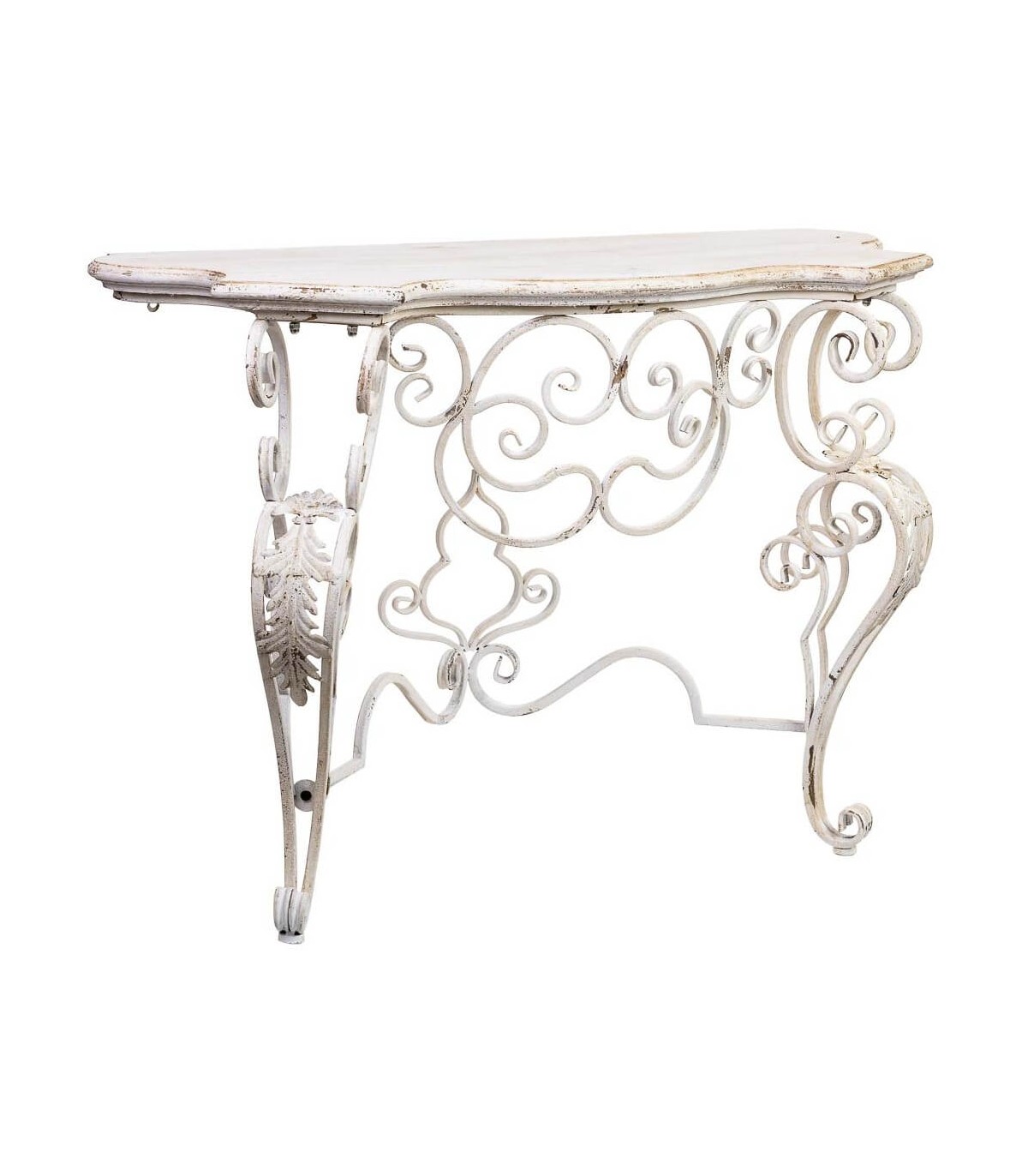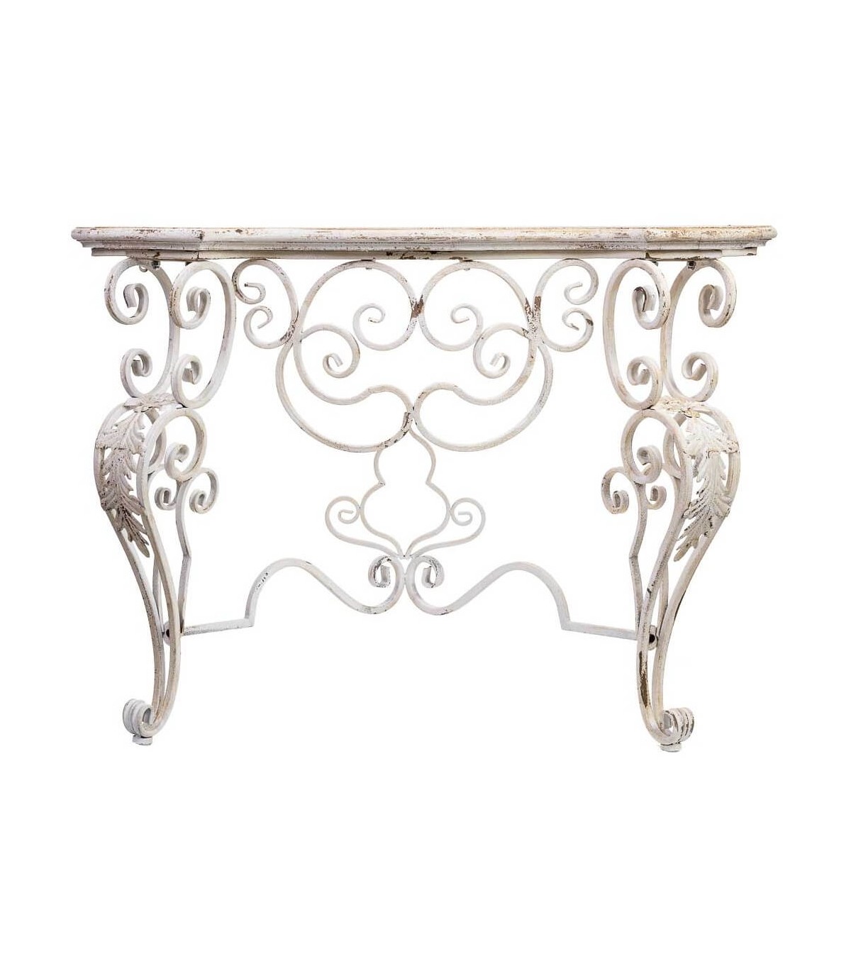 Dale un toque romántico y sofisticado a tu hogar con esta consola de entrada de estilo clásico vintage. Su estructura de metal forjado con detalles ornamentales curvados y su sobre de madera decapada crean una pieza llena de encanto y personalidad.