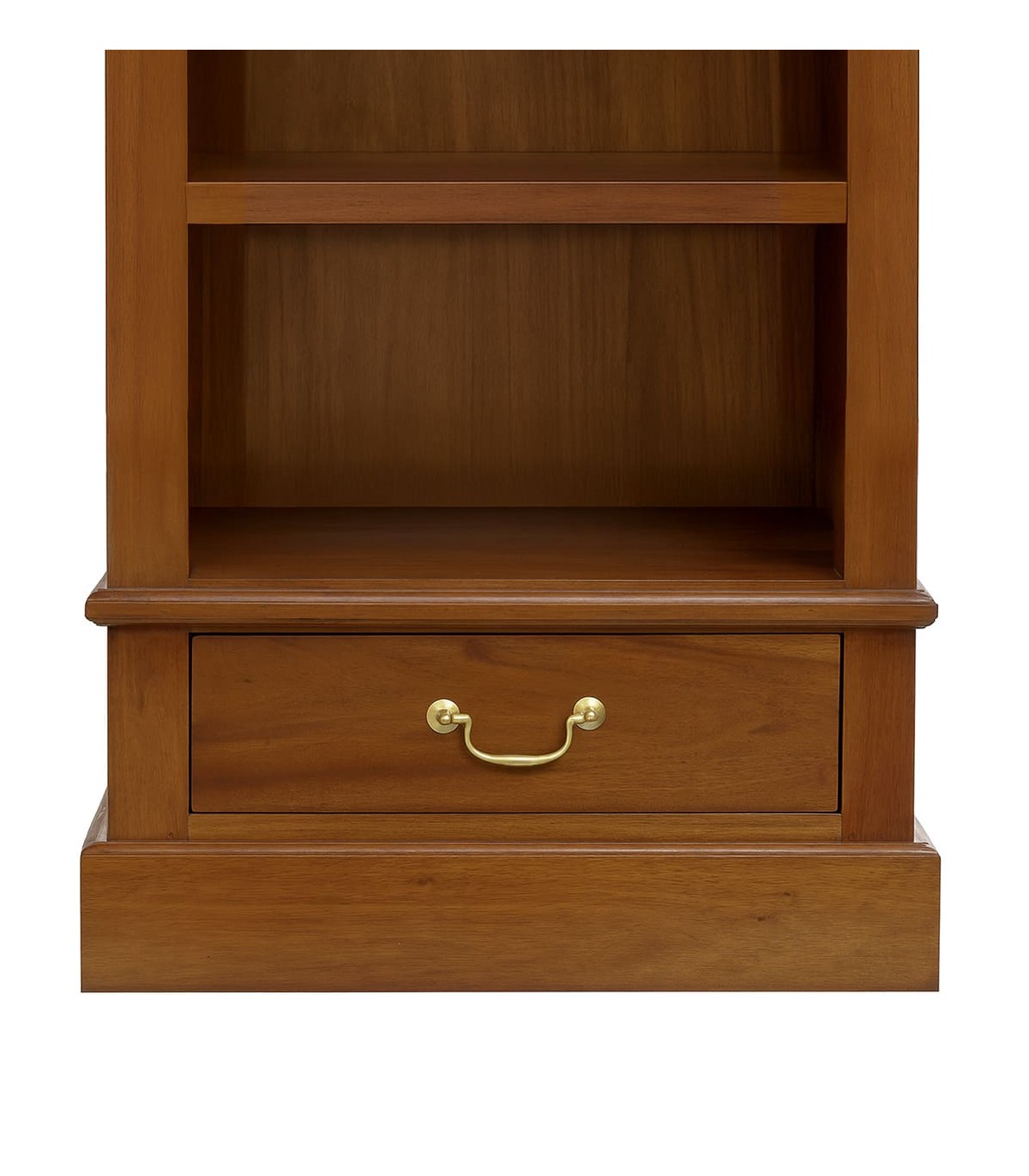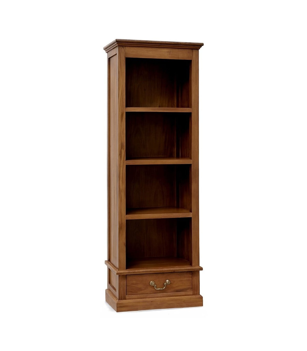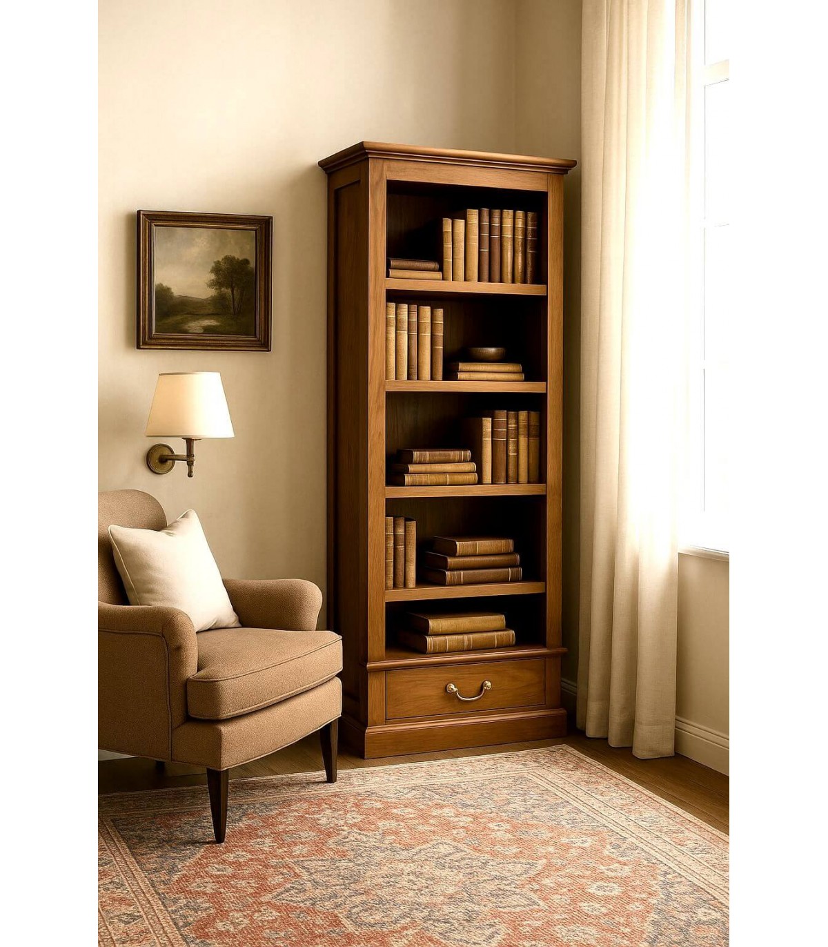 Esta estantería pequeña de diseño clásico combina elegancia, solidez y proporción en una pieza de carácter atemporal. Fabricada en madera maciza de caoba, destaca por su calidez natural y su acabado artesanal de gran calidad. El cajón inferior con tirador de bronce añade funcionalidad y un toque decorativo refinado.
