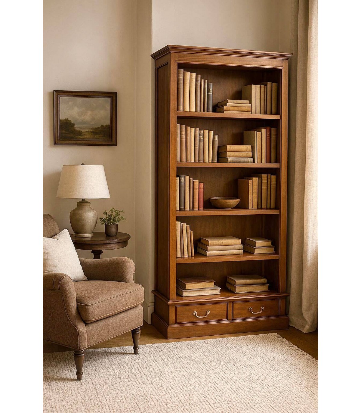 La estantería de diseño clásico aporta elegancia atemporal y funcionalidad práctica en salones, despachos o dormitorios. Fabricada en madera maciza de caoba, transmite calidez y solidez gracias a la nobleza de sus vetas naturales.