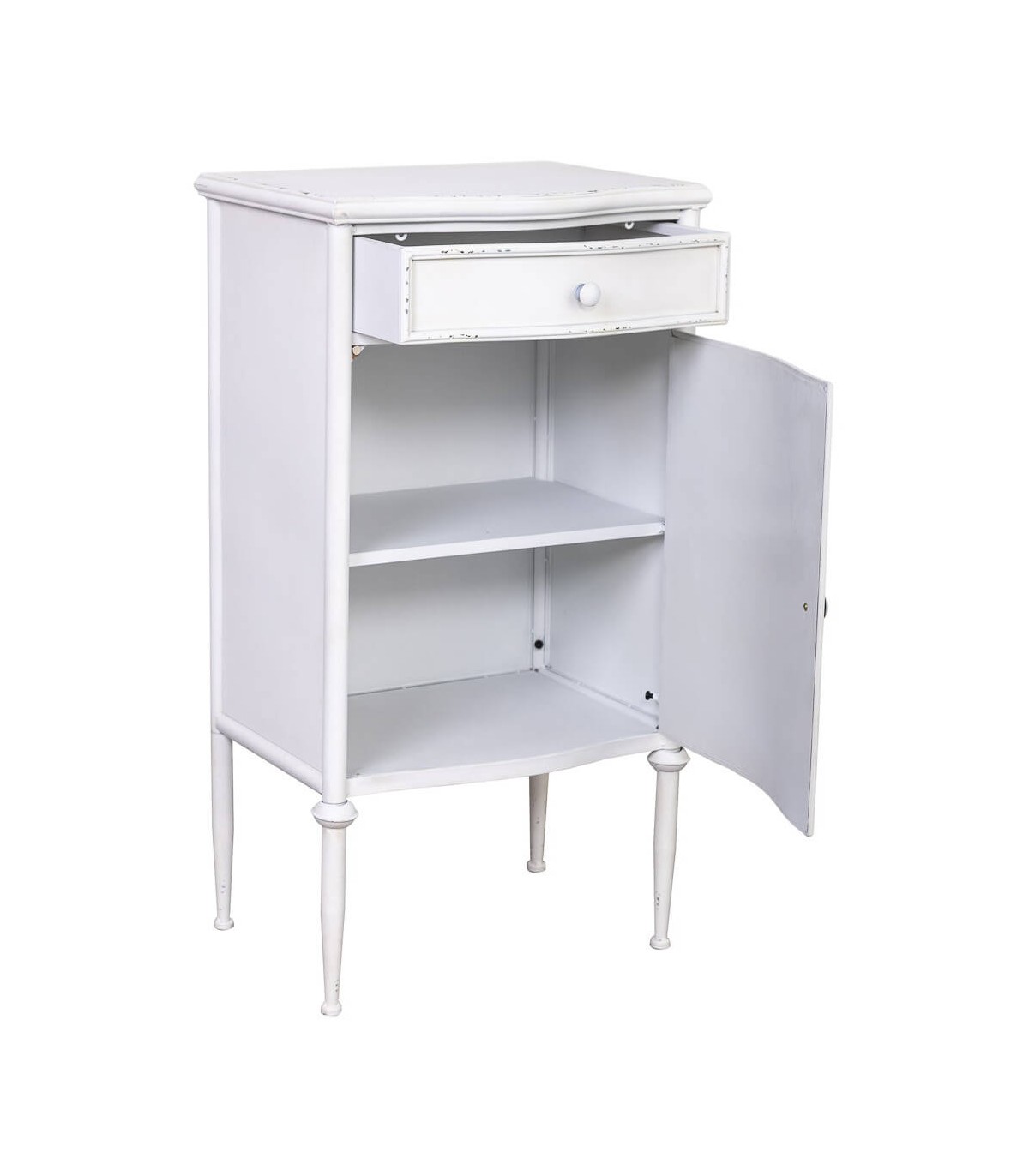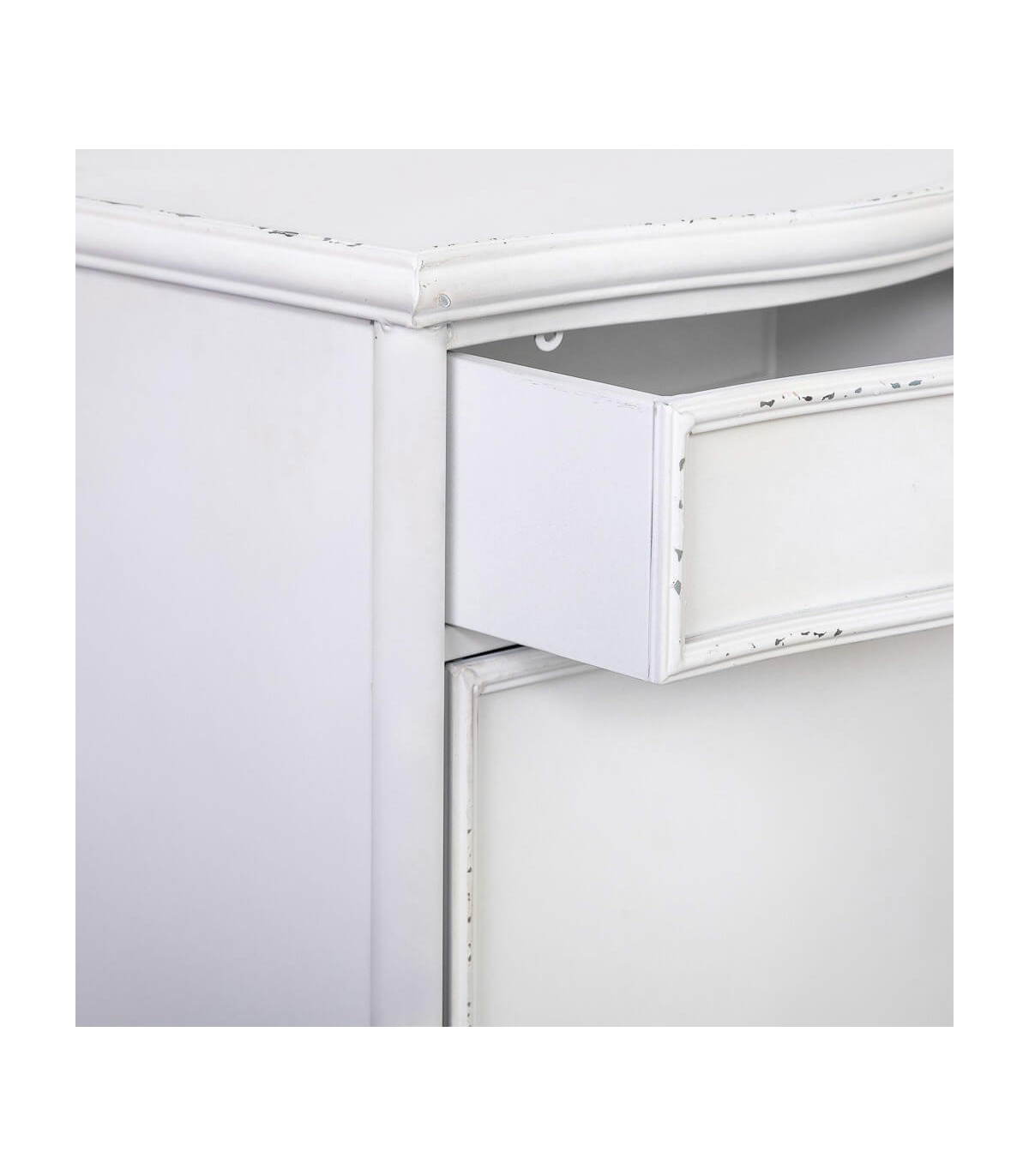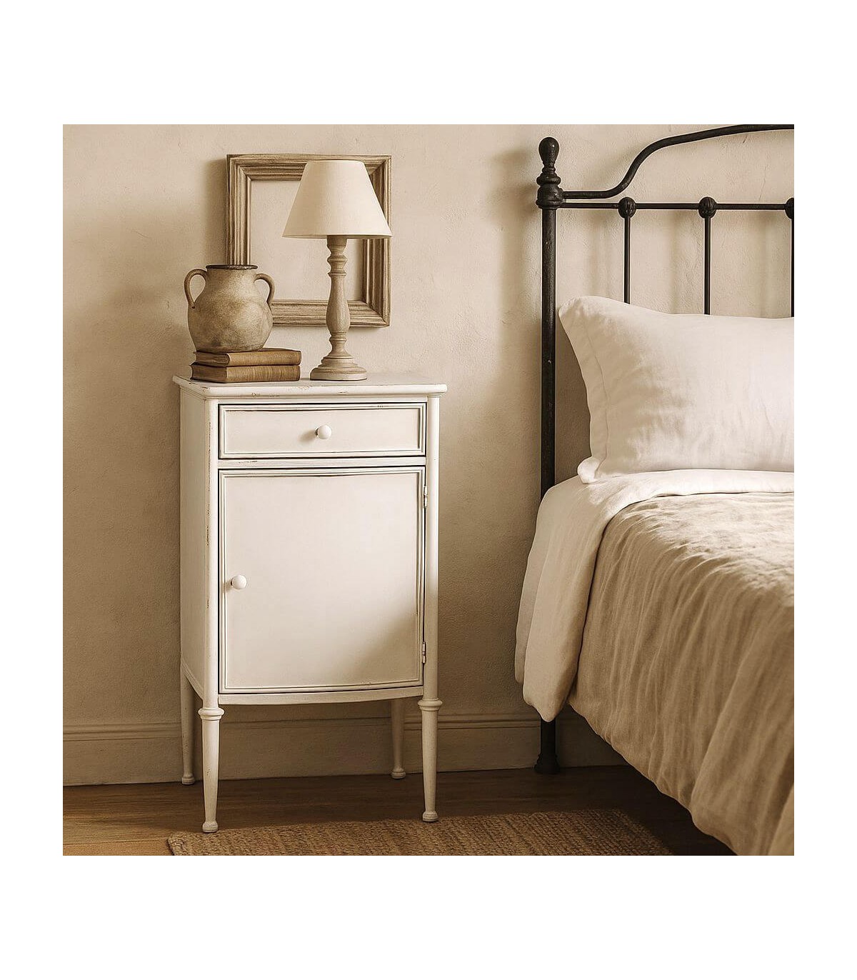 El encanto del metal envejecido y el blanco rozado se funden en una pieza que desprende calma y elegancia atemporal. Su diseño alto combina un cajón y una puerta que aportan equilibrio entre funcionalidad y presencia estética.