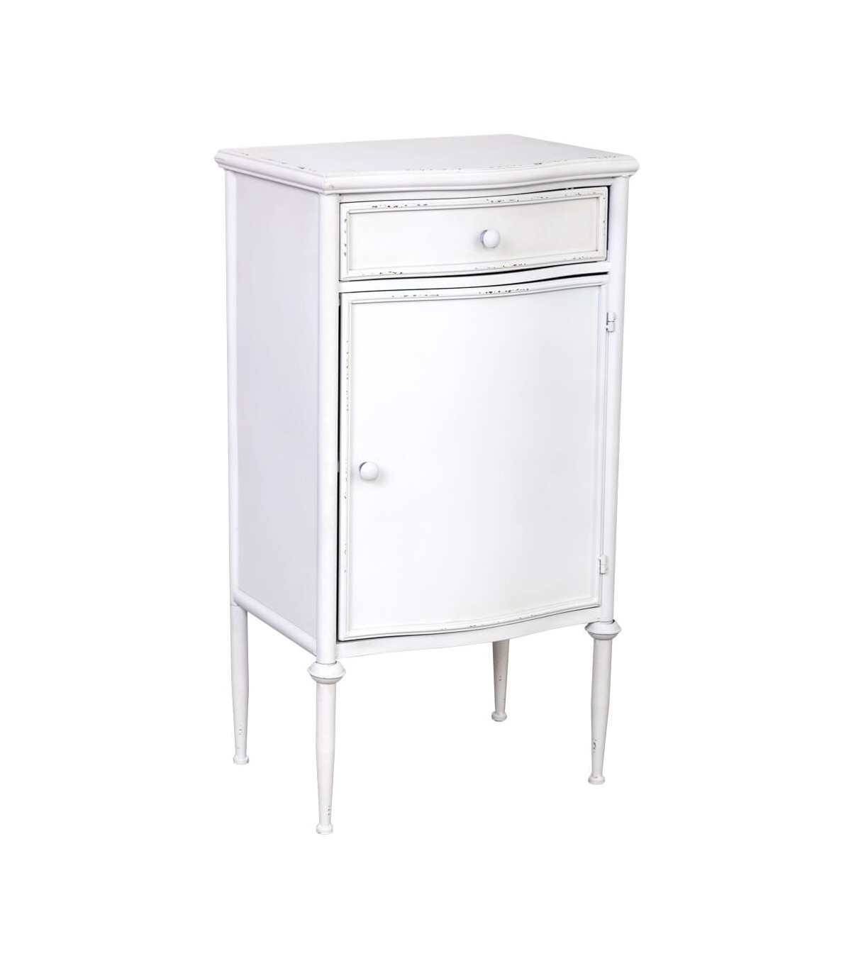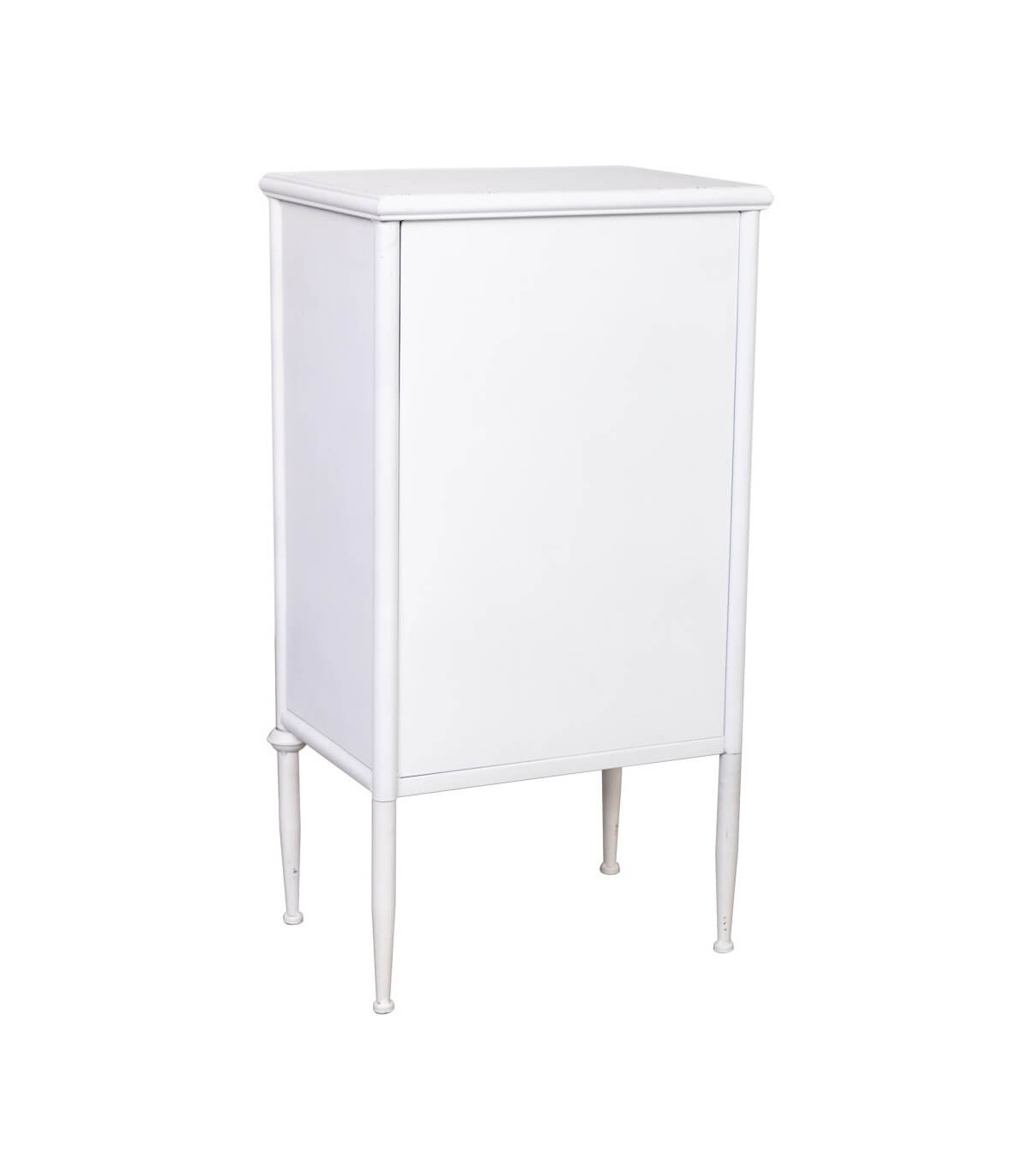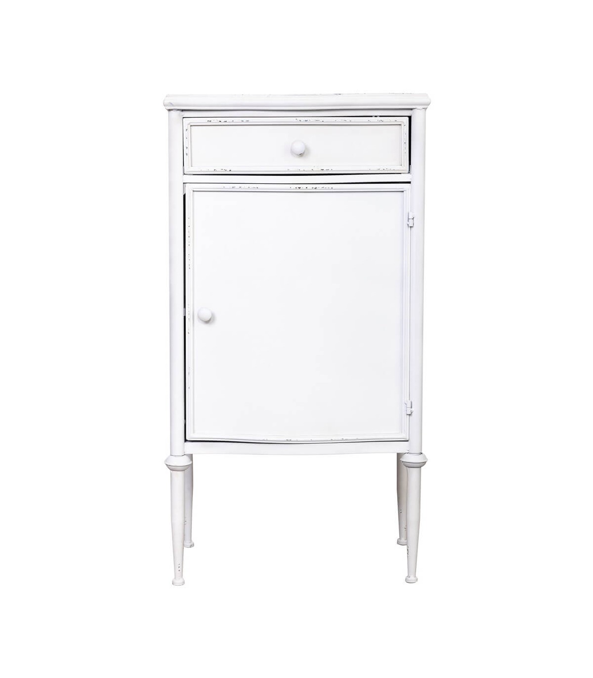 El encanto del metal envejecido y el blanco rozado se funden en una pieza que desprende calma y elegancia atemporal. Su diseño alto combina un cajón y una puerta que aportan equilibrio entre funcionalidad y presencia estética.