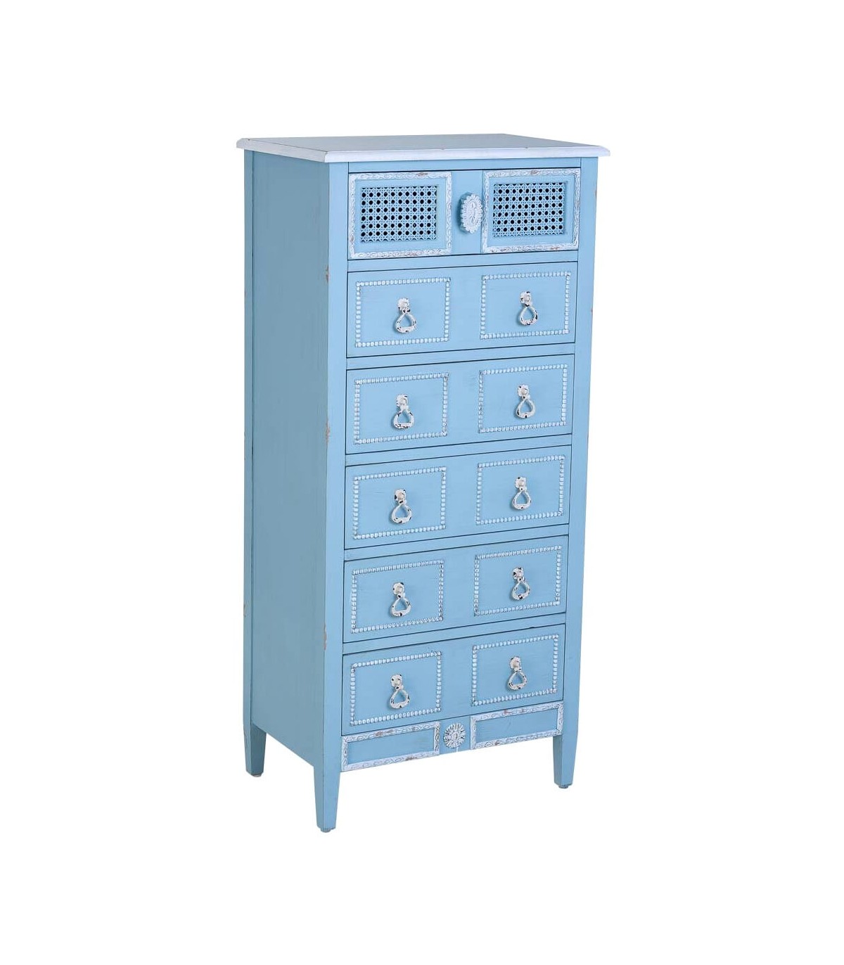 🍃 Sinfonier Clásico Romántico con 6 Cajones – Madera y Ratán en Azul Rozado con Detalles en Blanco ✨