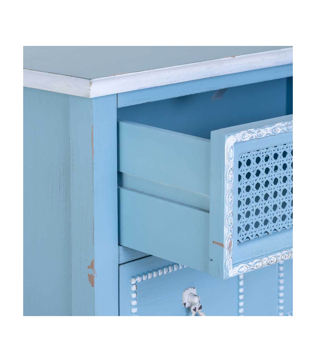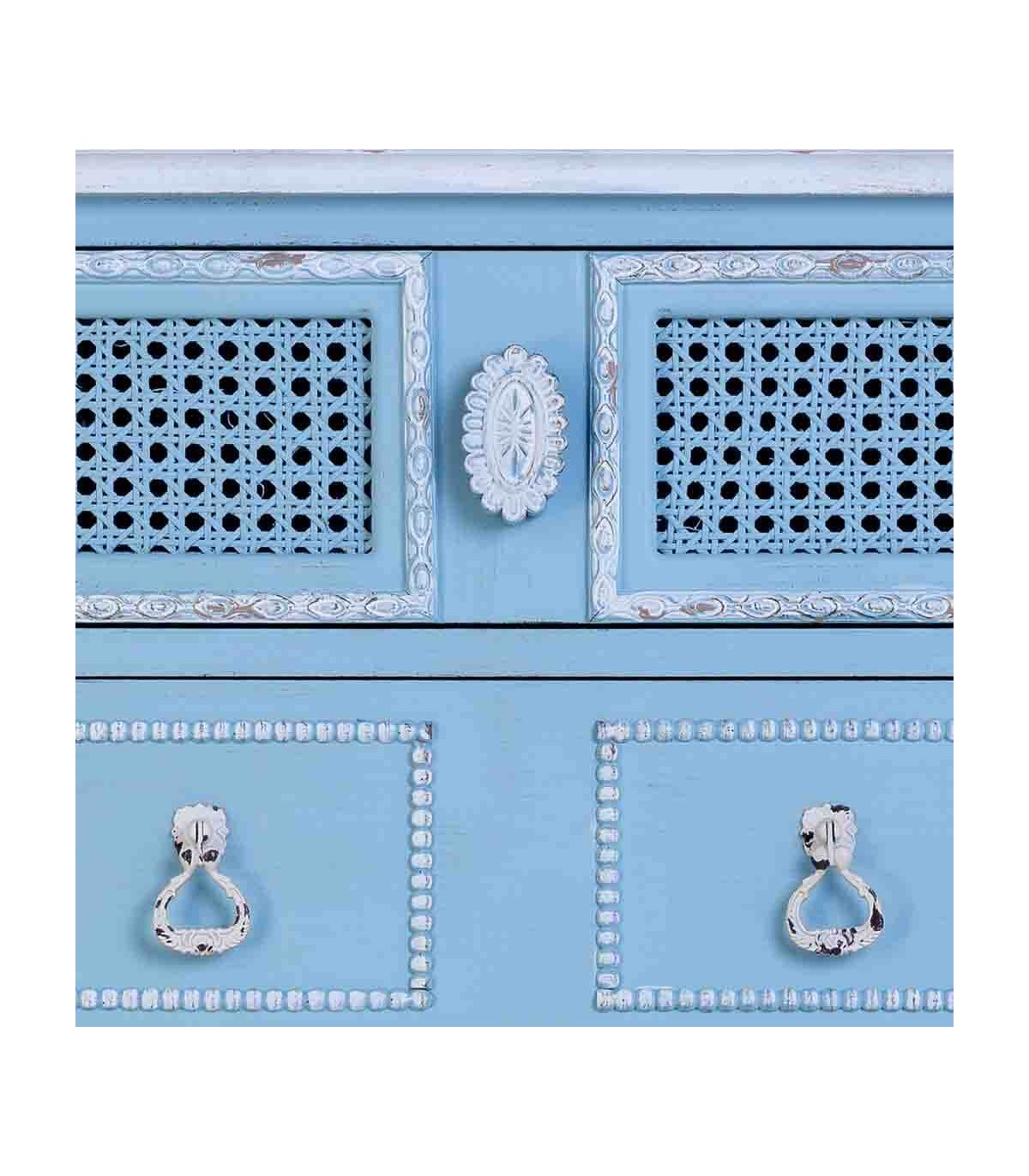 Acabado, madera y ratán teñidos en color azul rozado, con la tapa y detalles en blanco, tiradores en metal a juego. Fabricación artesanal. entendemos las variaciones de tonalidad, tamaño y forma o ciertas imperfecciones (grietas, nudos, marcas) como un valor añadido que la convierten en pieza única.