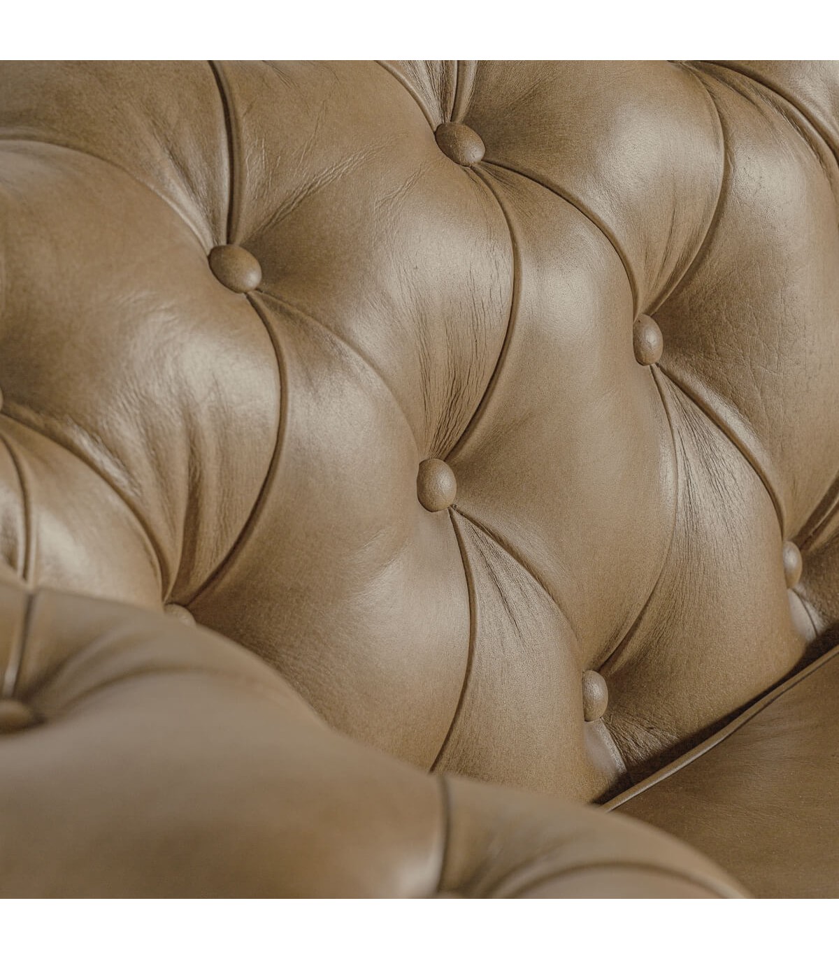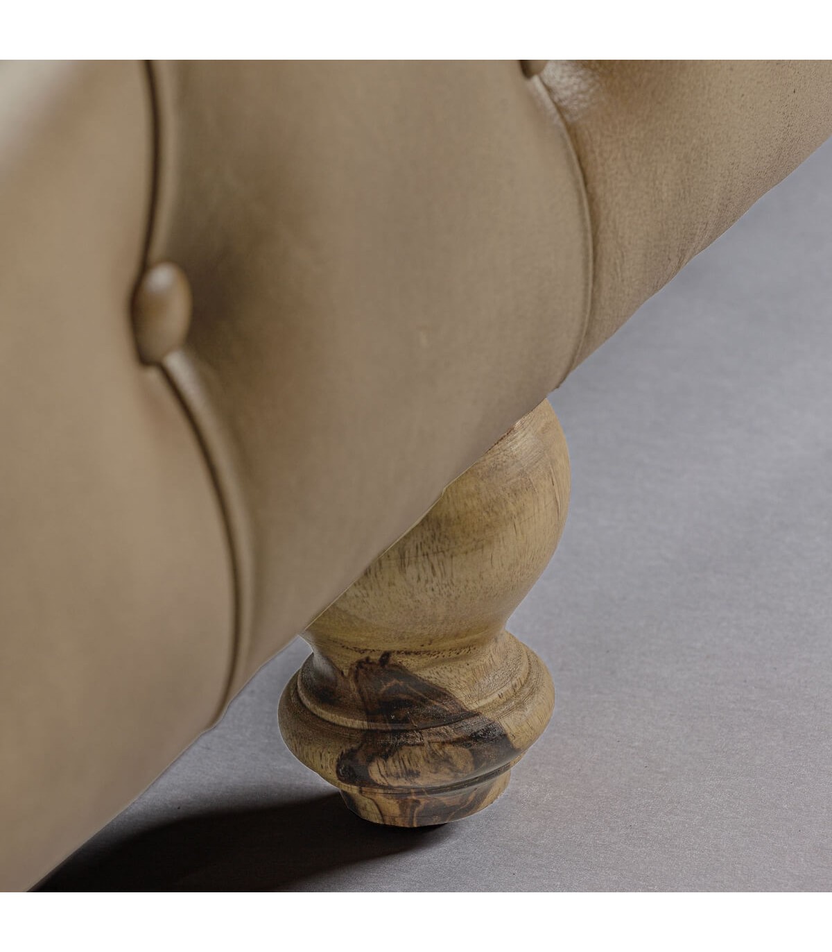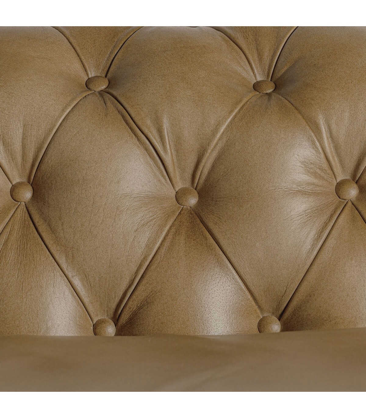 Aporta sofisticación y carácter con este imponente sofá Chester de tres plazas, tapizado en piel auténtica color caqui. Su respaldo y brazos con capitoné clásico, el asiento de cojines gruesos y las patas torneadas en madera natural evocan el lujo inglés con un toque contemporáneo.