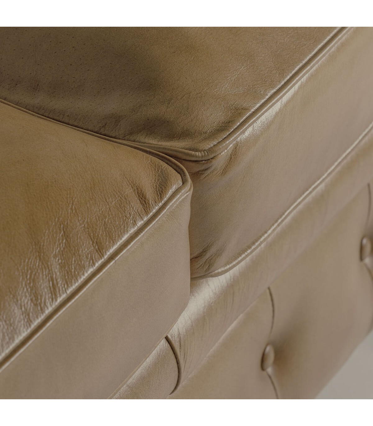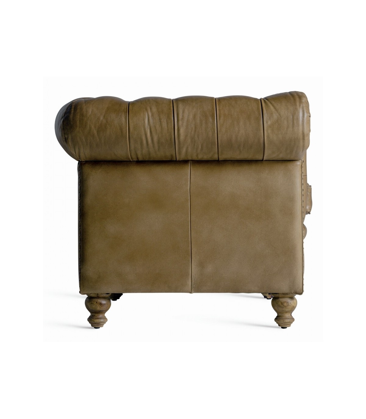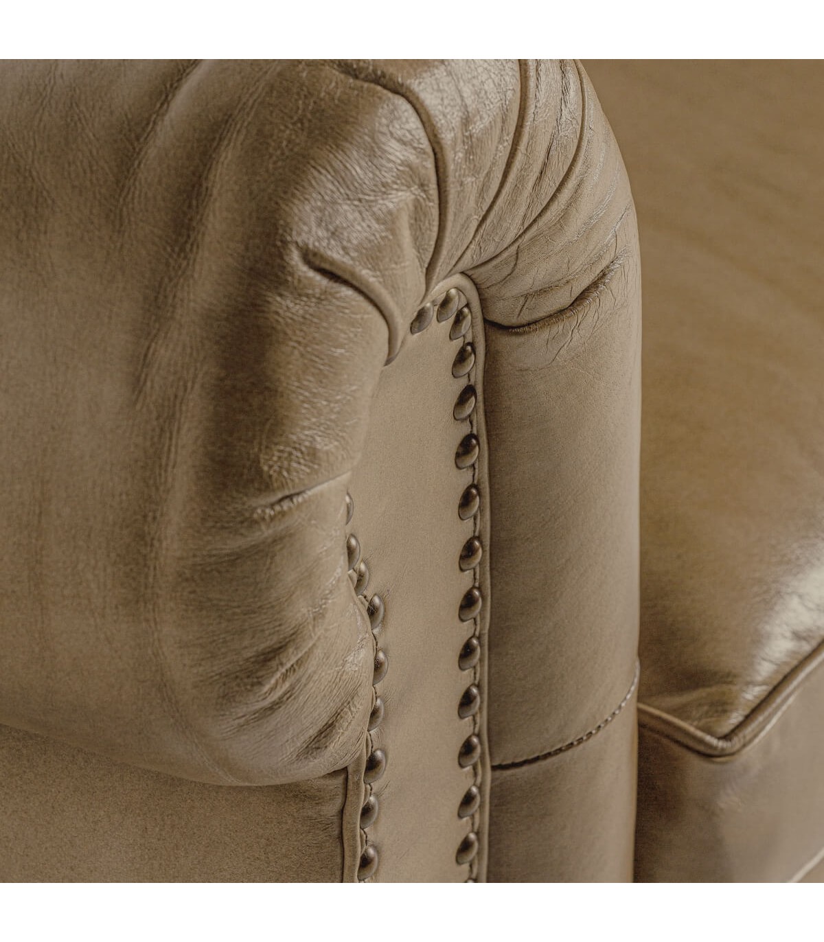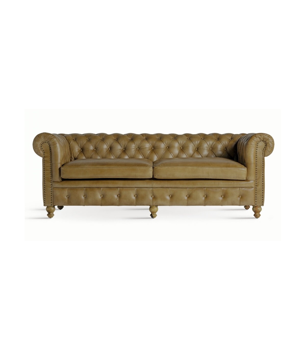Aporta sofisticación y carácter con este imponente sofá Chester de tres plazas, tapizado en piel auténtica color caqui. Su respaldo y brazos con capitoné clásico, el asiento de cojines gruesos y las patas torneadas en madera natural evocan el lujo inglés con un toque contemporáneo.