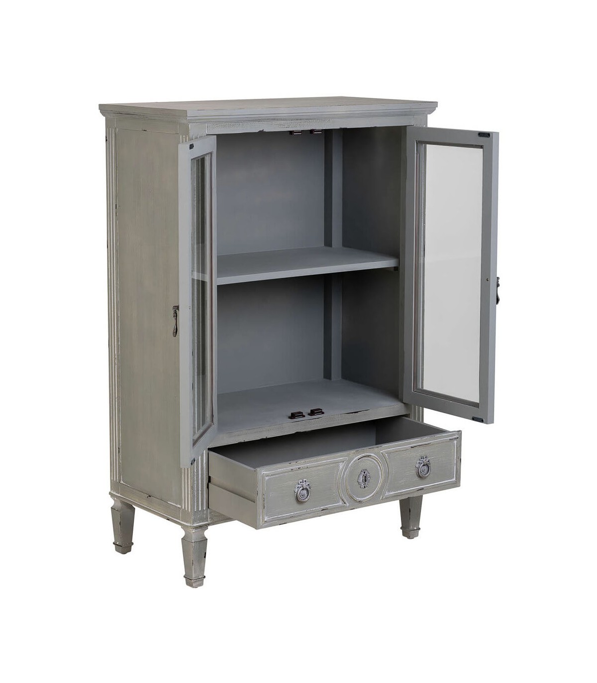 Dale un aire elegante y atemporal a tu hogar con la Vitrina Baja Clásica, una pieza de madera maciza de abeto con un refinado acabado en gris rozado con pátina blanca. Su diseño cuenta con dos puertas acristaladas y un cajón inferior, proporcionando almacenamiento funcional y exhibición para vajilla, libros o decoración.