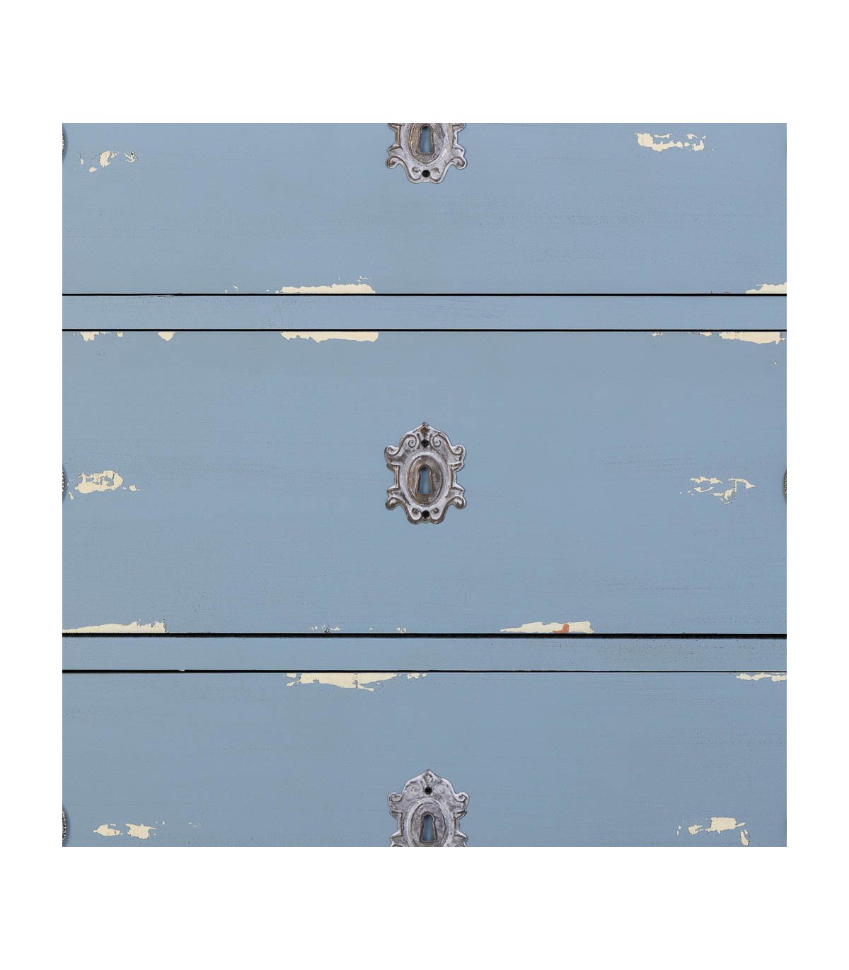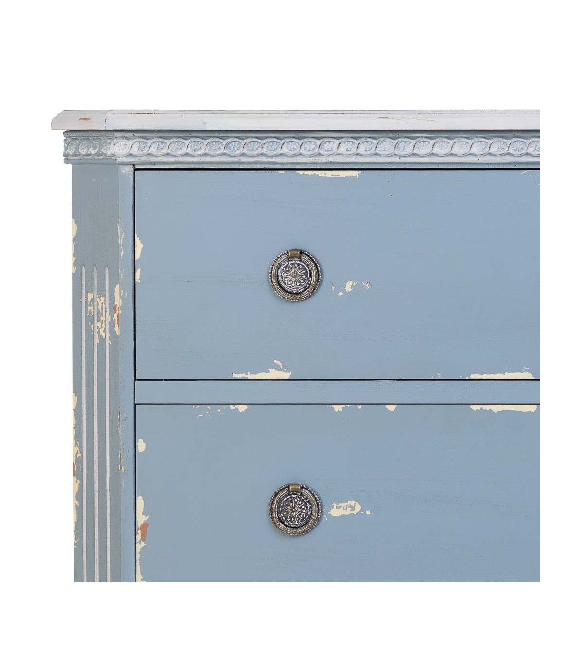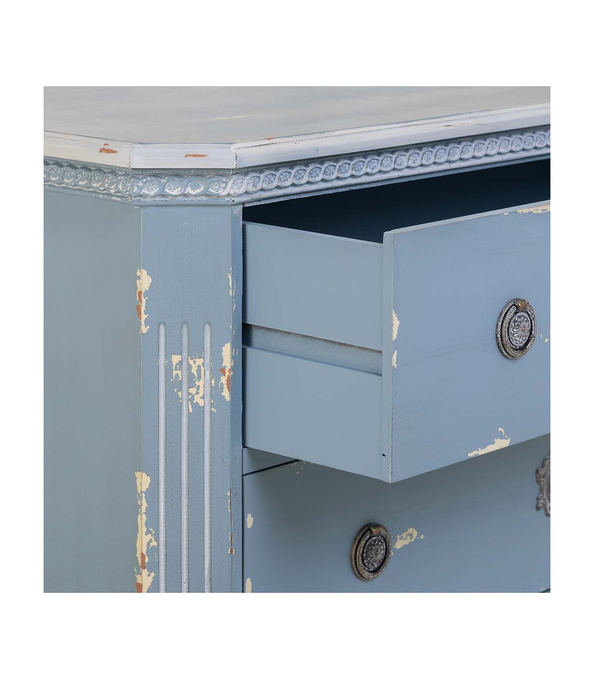 Aporta un aire vintage y sofisticado a tu hogar con esta cómoda de madera en azul decapado y detalles en blanco. Su diseño clásico con tiradores metálicos decorativos le otorga un encanto atemporal.